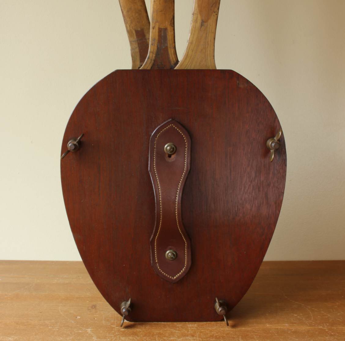 This vintage / antique wooden tennis racket press which has a brown leather carrying handle has brass and metal fittings and comes complete with two original wooden dividers so will take up to 3 tennis rackets.