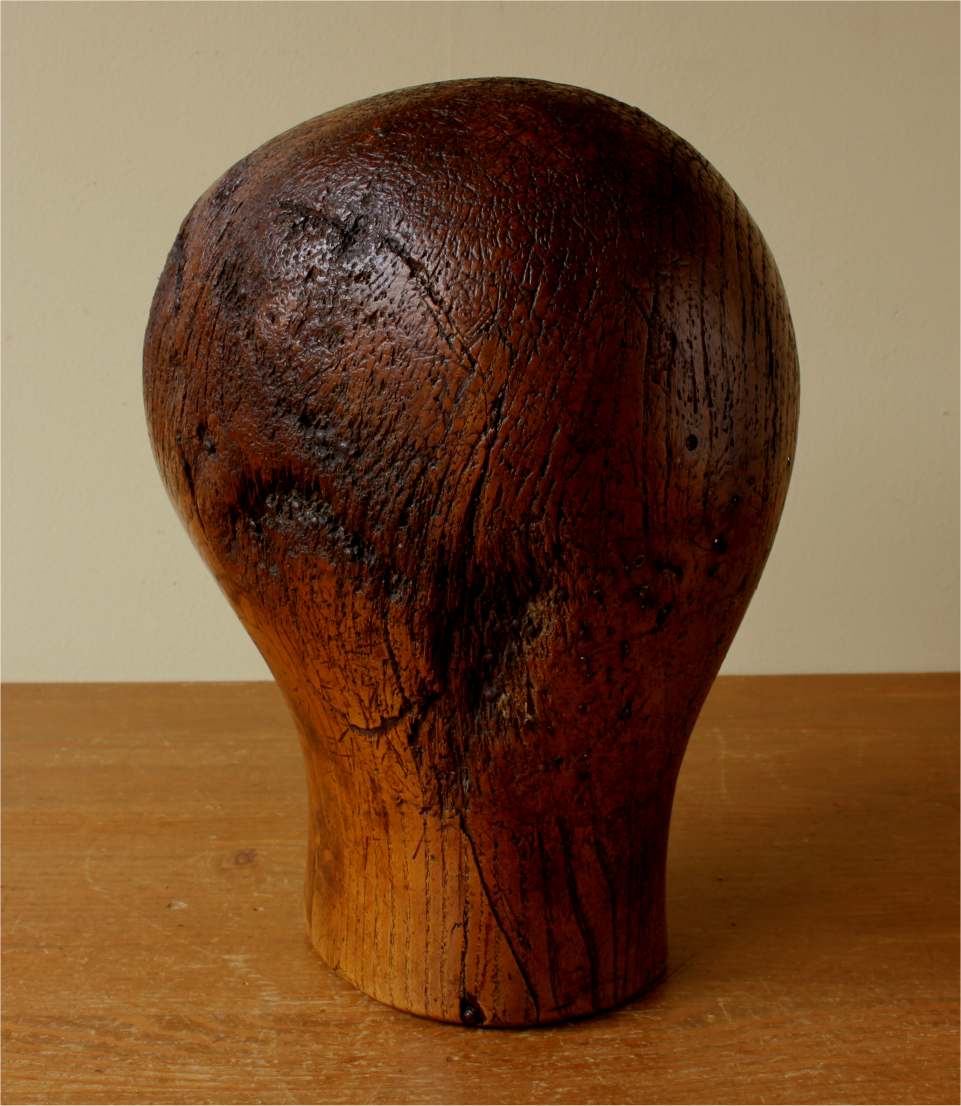 This antique wooden head shaped wig / hat block which is a wonderful dark brown colour has accumulated lots of pin holes and wear over the years giving it a stunning patina and would be super for displaying wigs, hats, fascinators and other headwear.