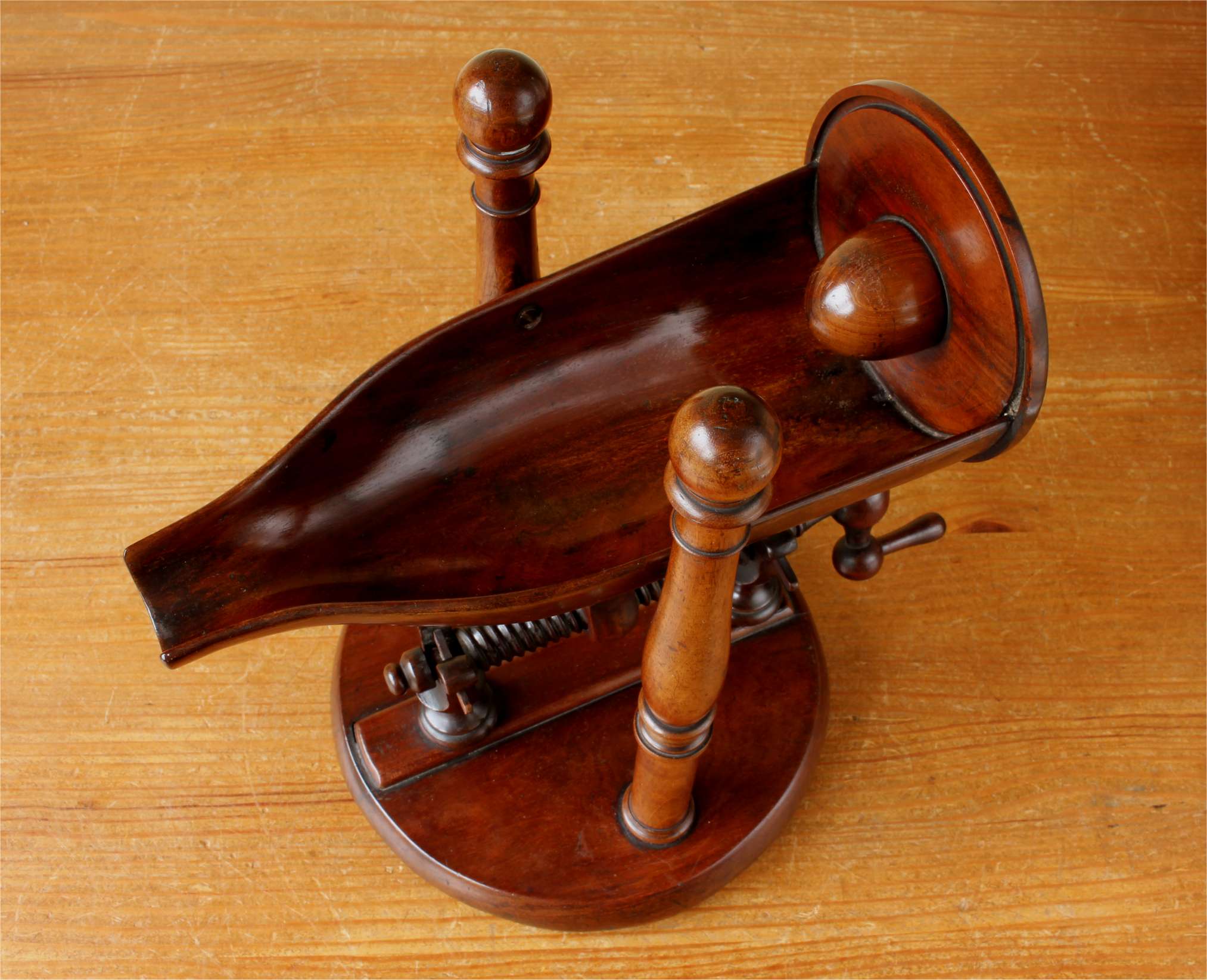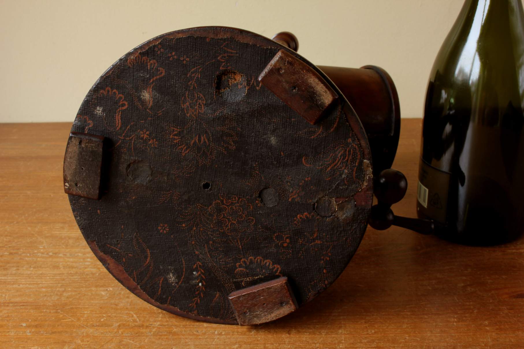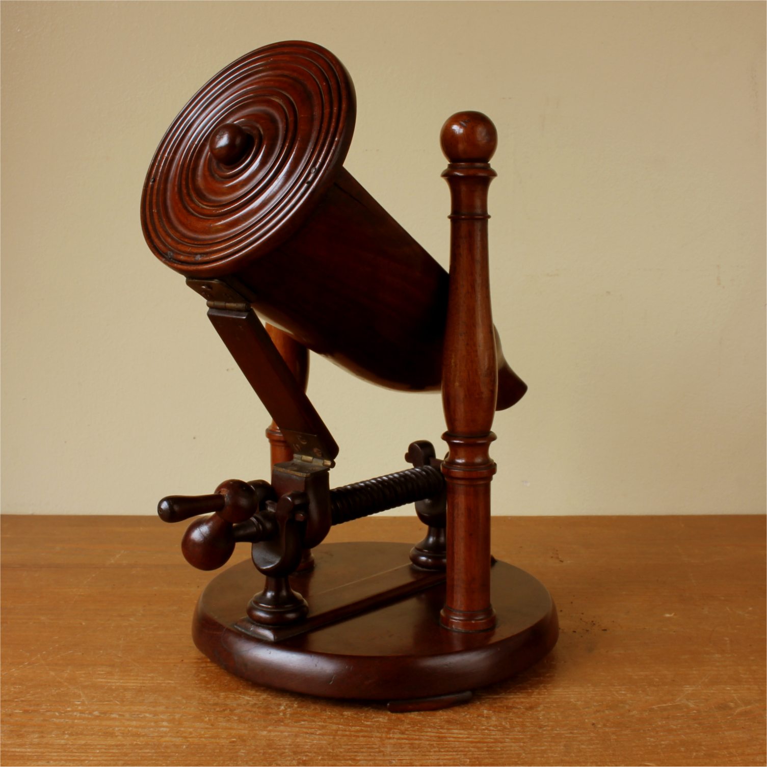 This rare Regency Period bottle holder has a clever design with all parts except for the brass hinges being made of wood including the winding thread with handle, bottle cradle with punt and sits on it's base which has three feet.