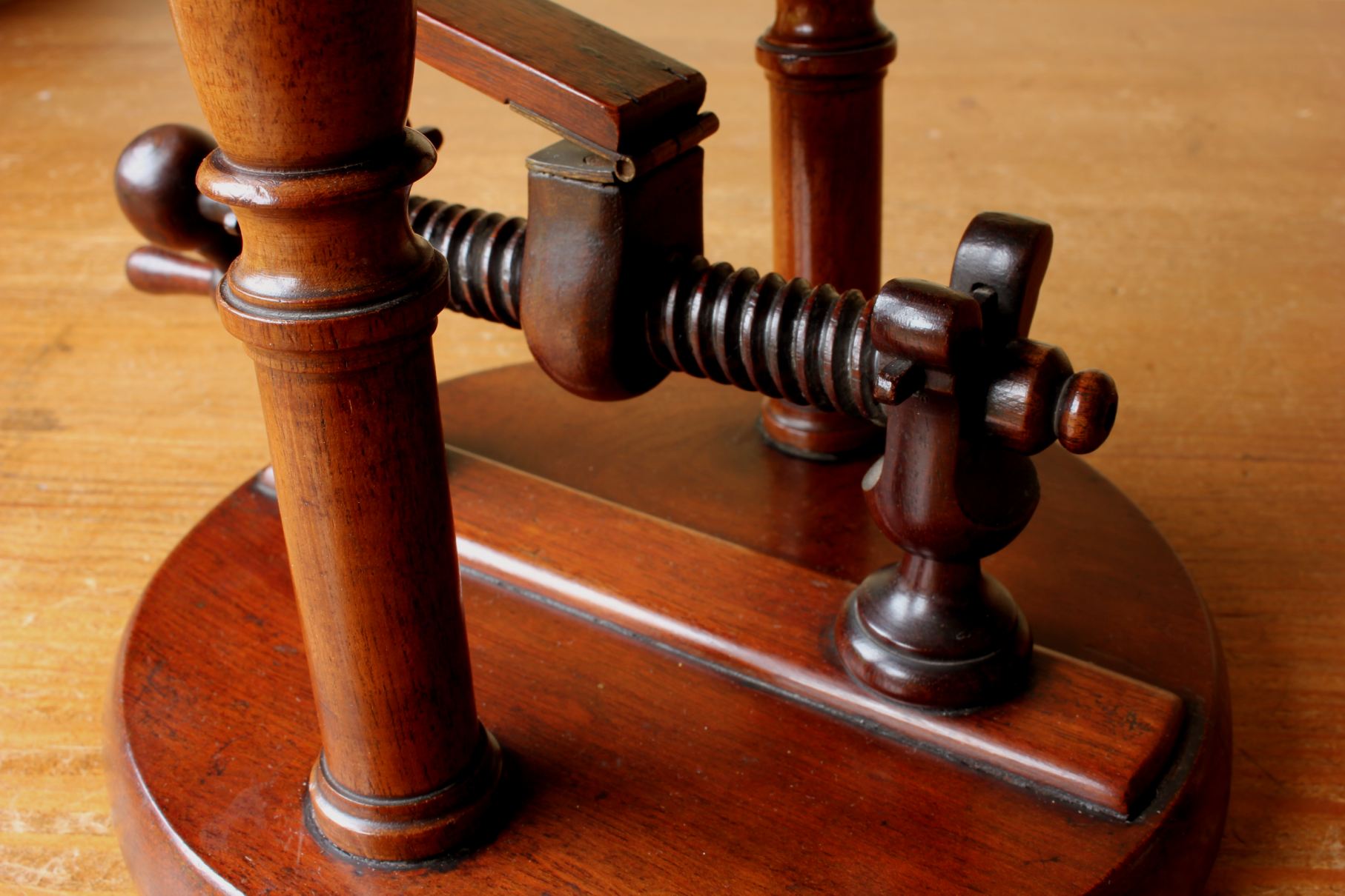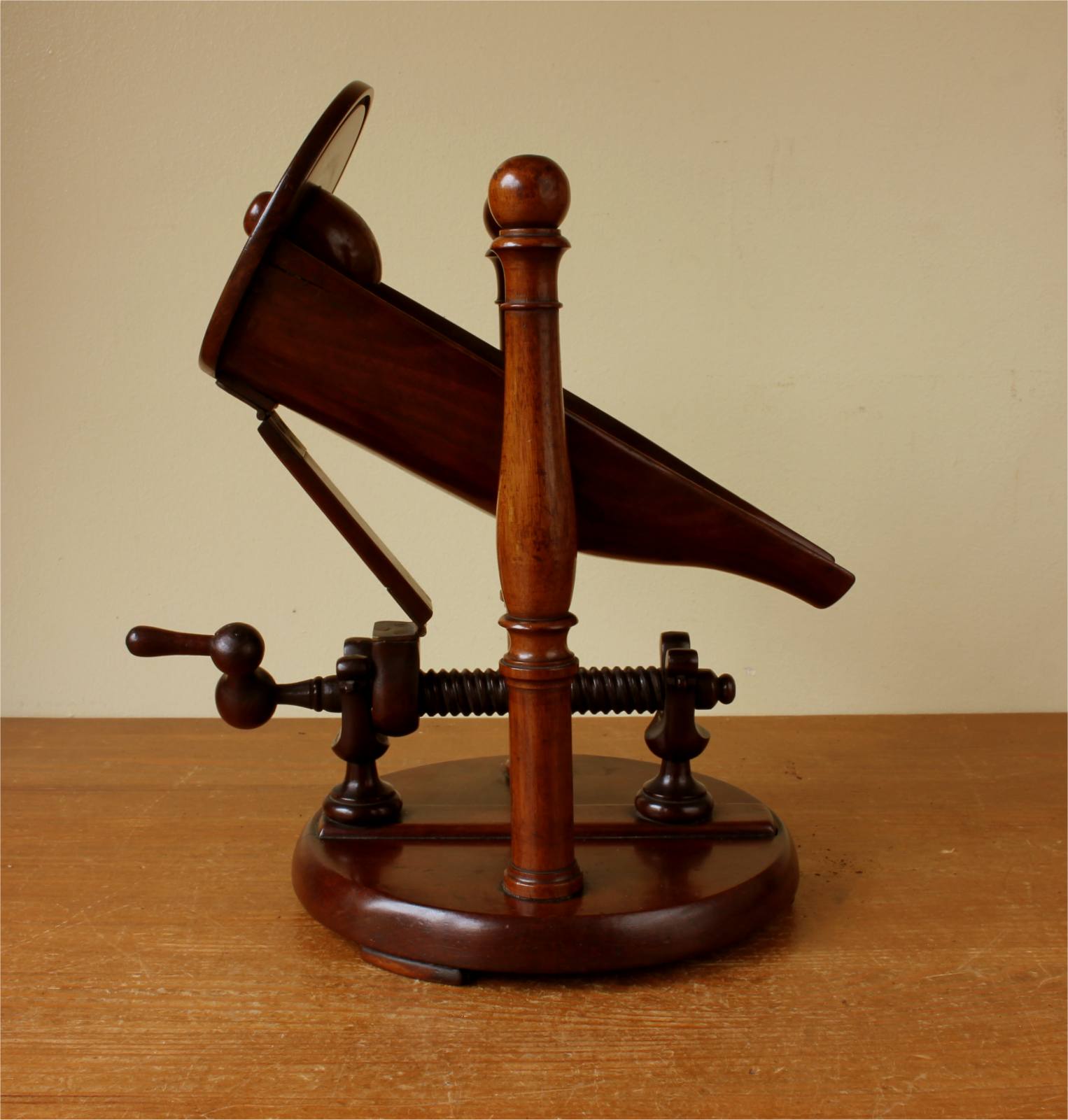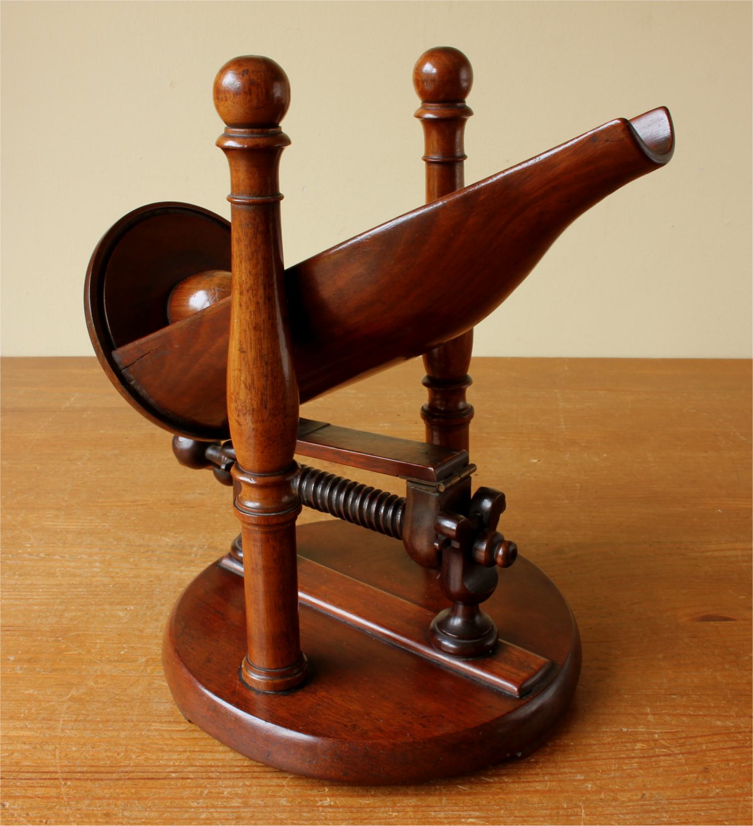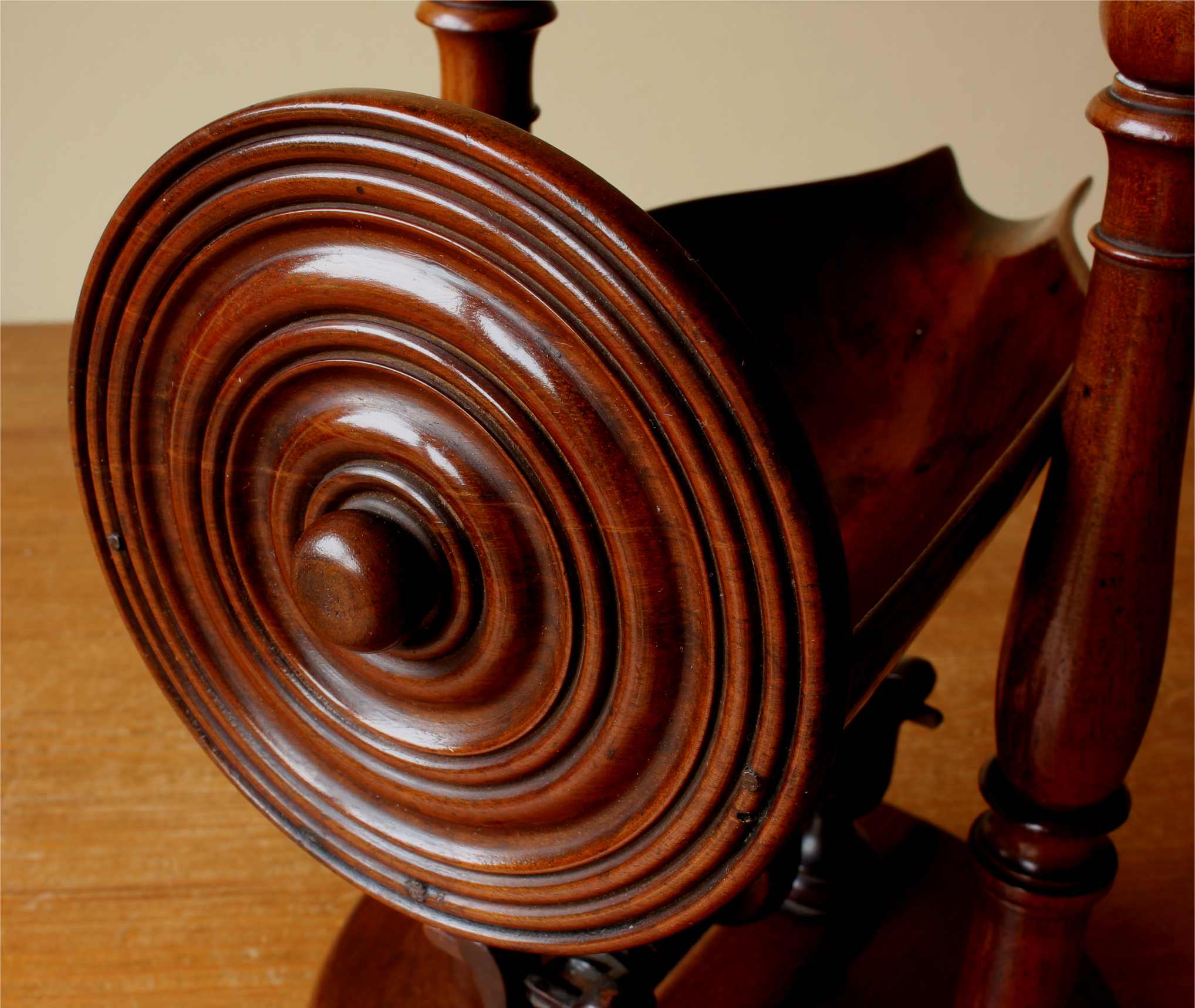 This rare Regency Period bottle holder has a clever design with all parts except for the brass hinges being made of wood including the winding thread with handle, bottle cradle with punt and sits on it's base which has three feet.