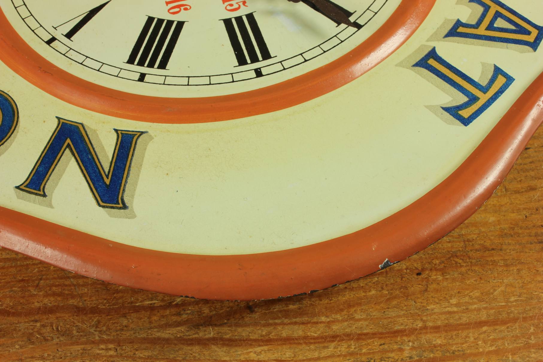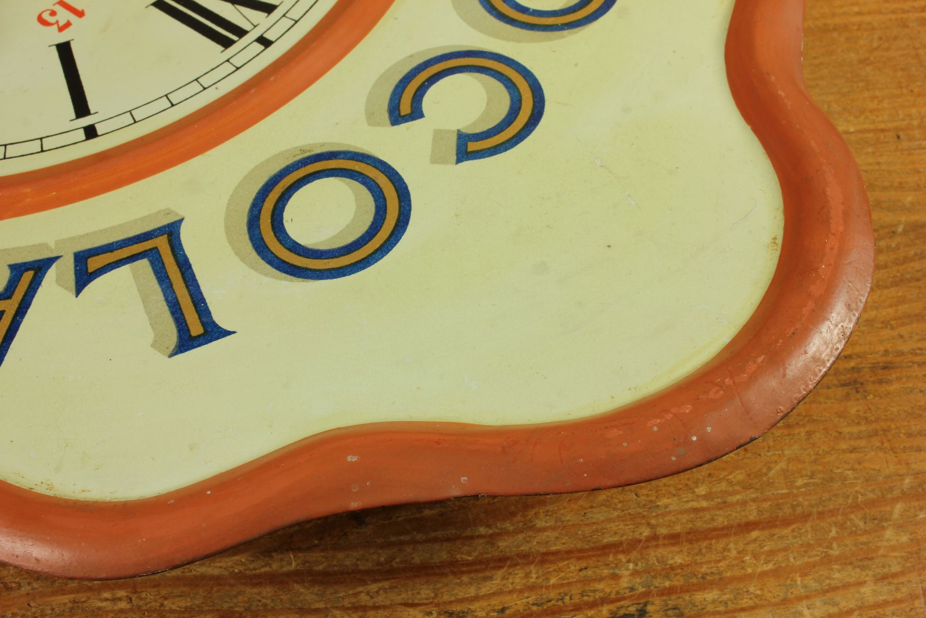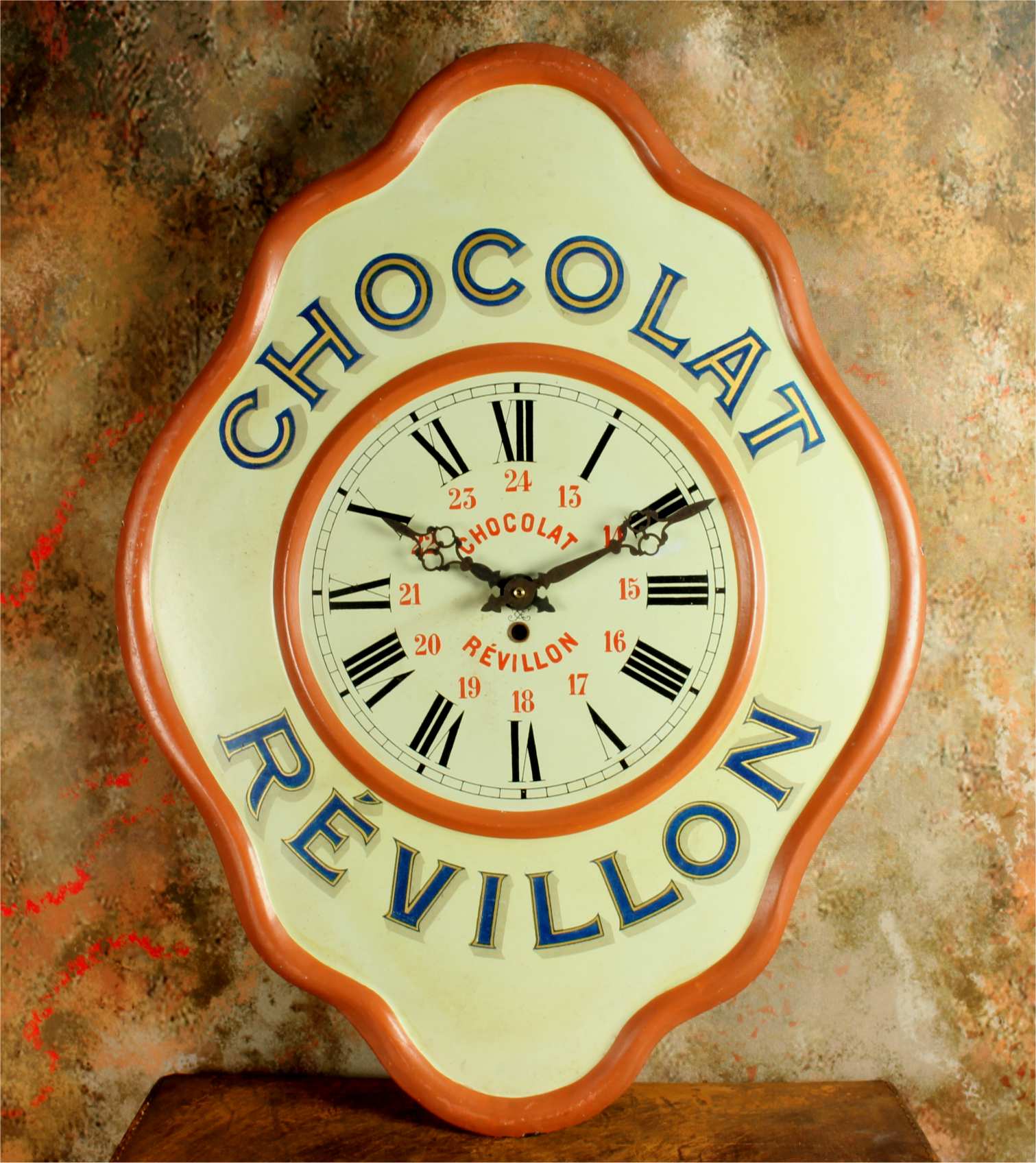 This highly decorative advertising clock would have originally been hung in a French Chocolate shop or cafe to advertise Chocolat Revillon and has lots of charm.