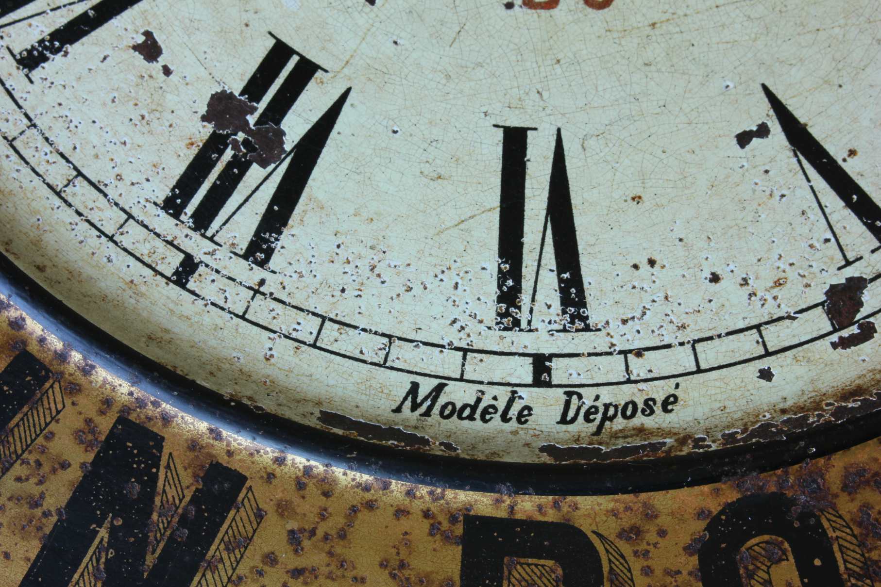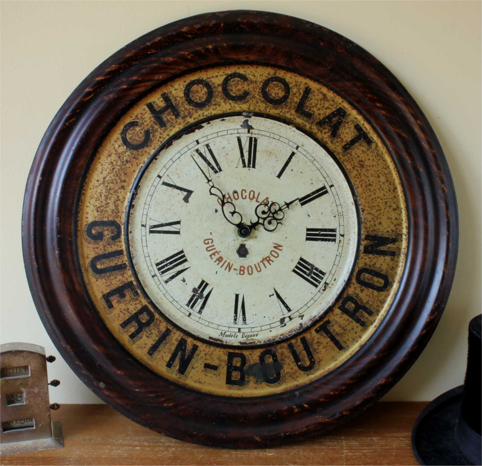 This stylish chocolate advertising wall clock which has a great patina is made of embossed painted metal and would have originally been hung in a French Cafe to advertise Guerin Boutron Chocolat.