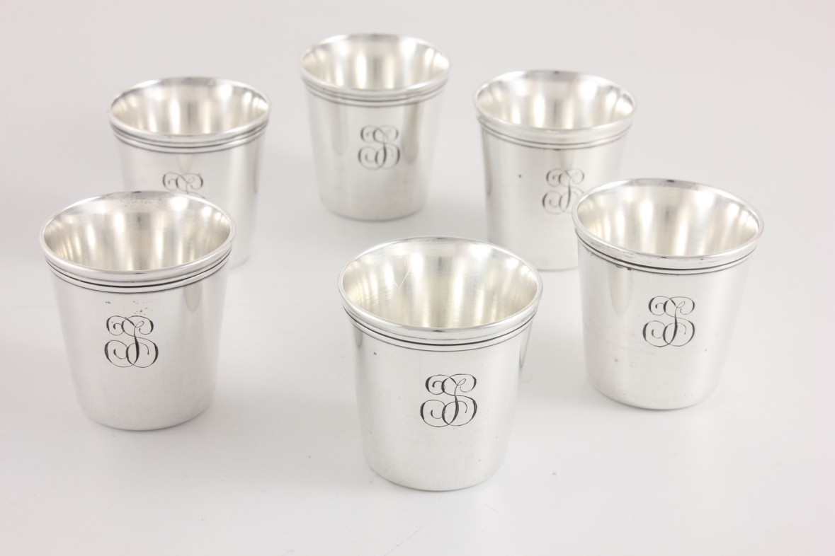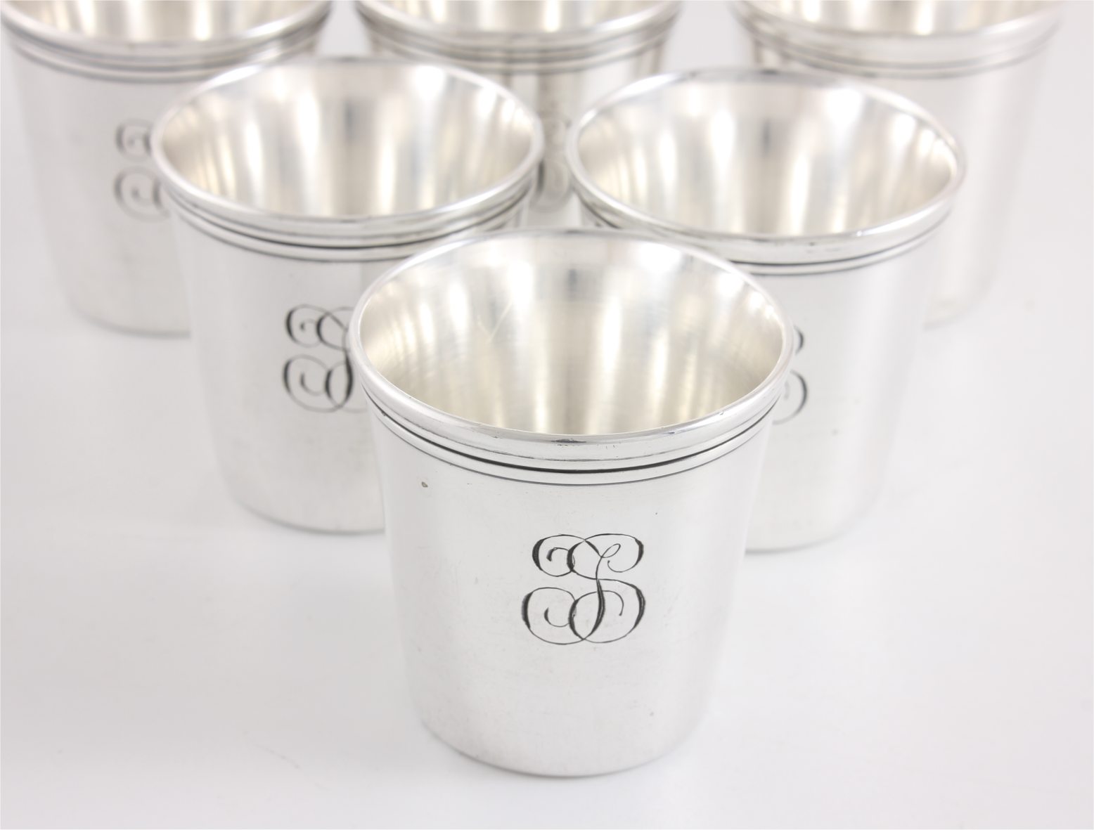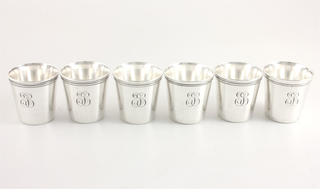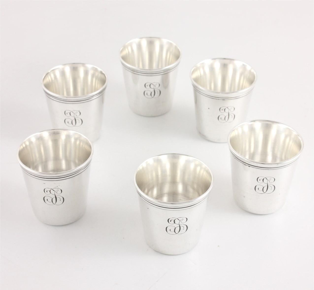 This handsome set of 6 antique French vodka shot cups which date from c1900 are made of silver plate and are by top French silversmith Christofle.