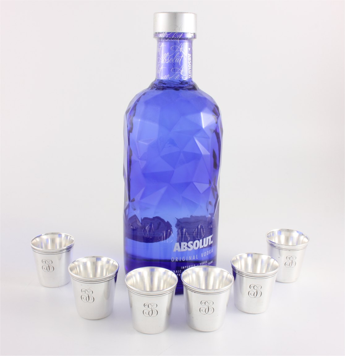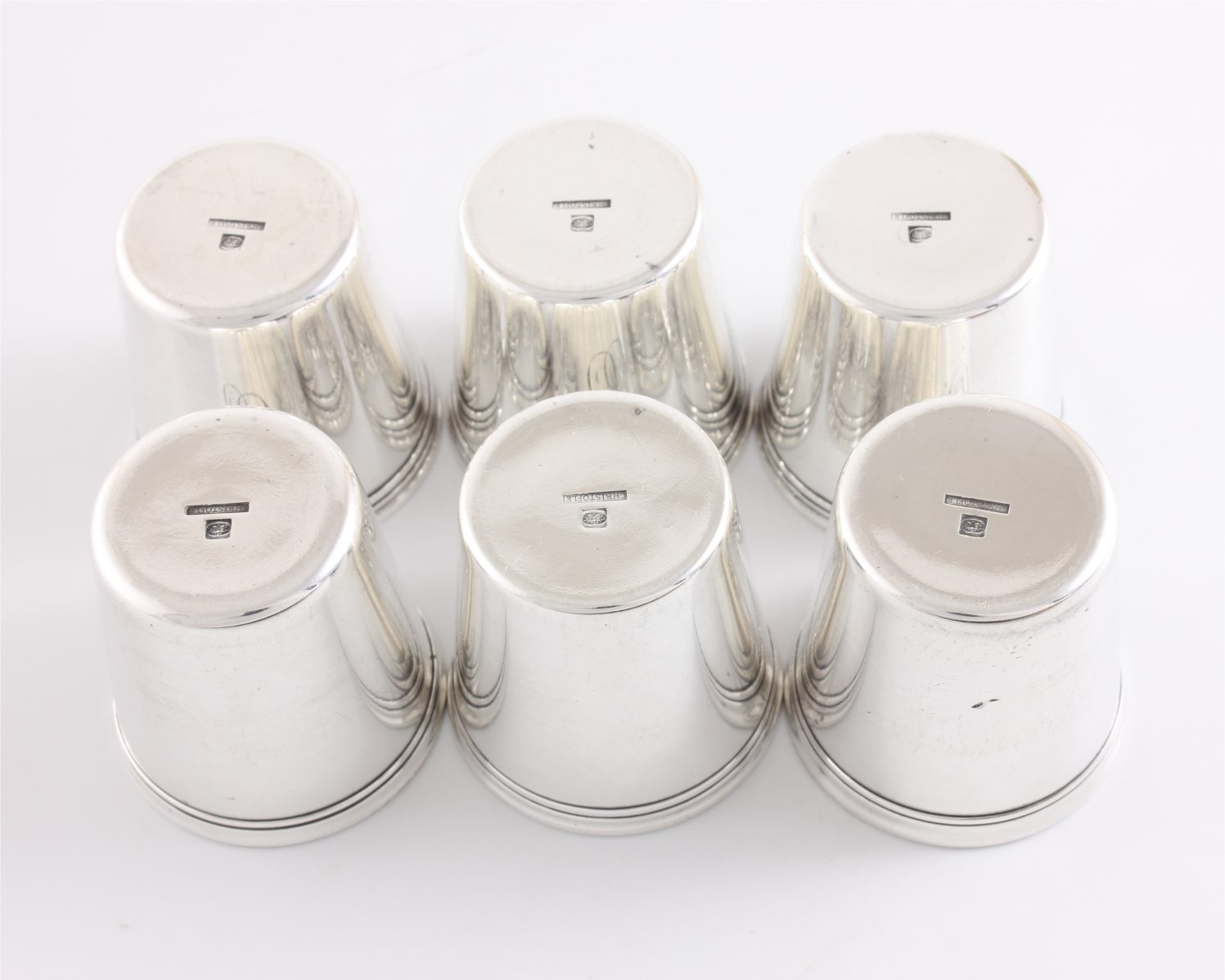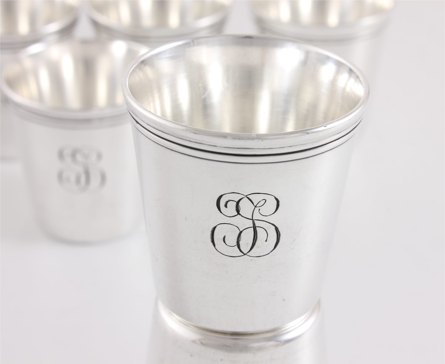 This handsome set of 6 antique French vodka shot cups which date from c1900 are made of silver plate and are by top French silversmith Christofle.