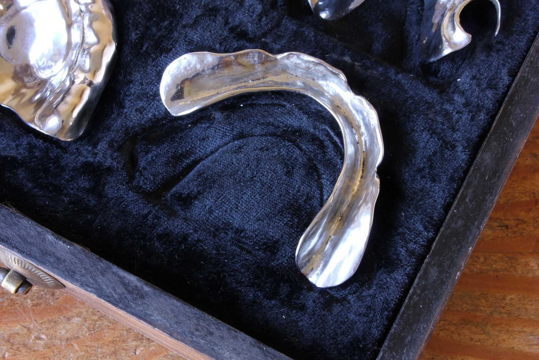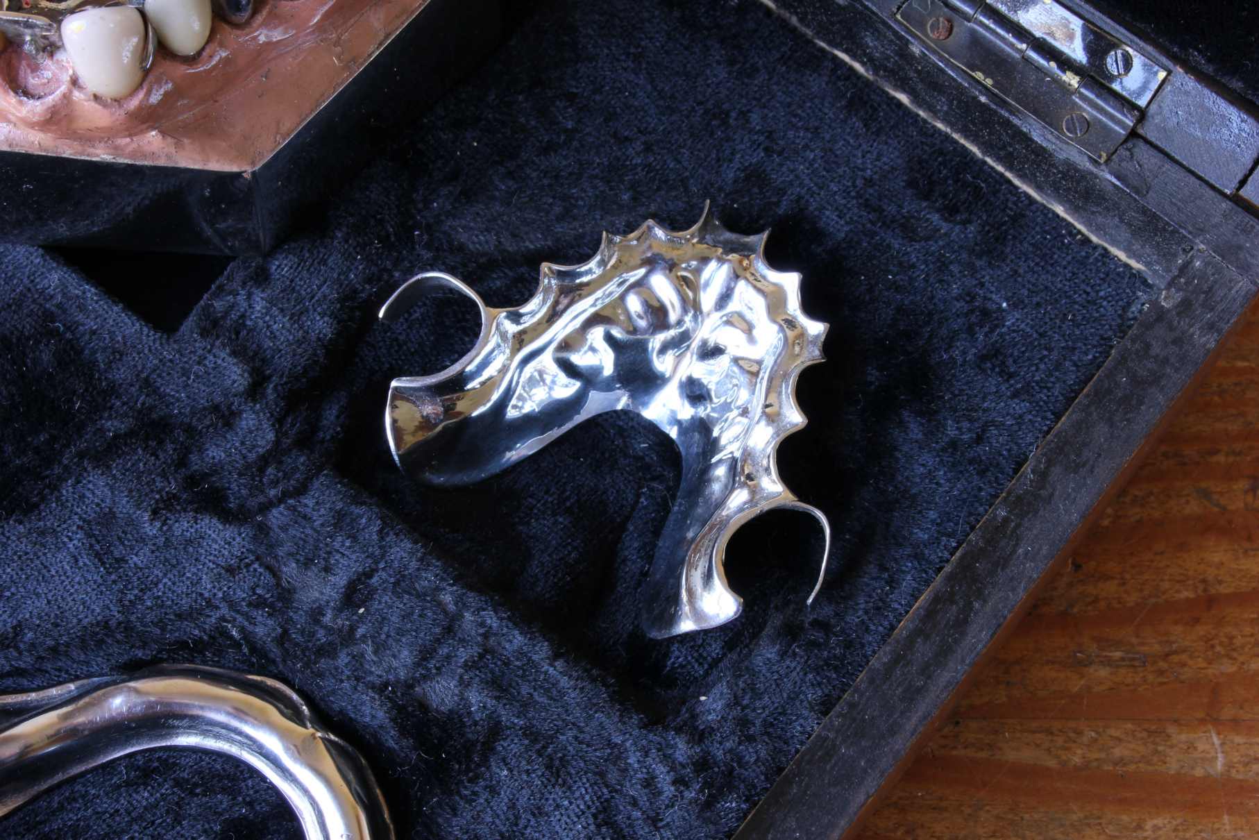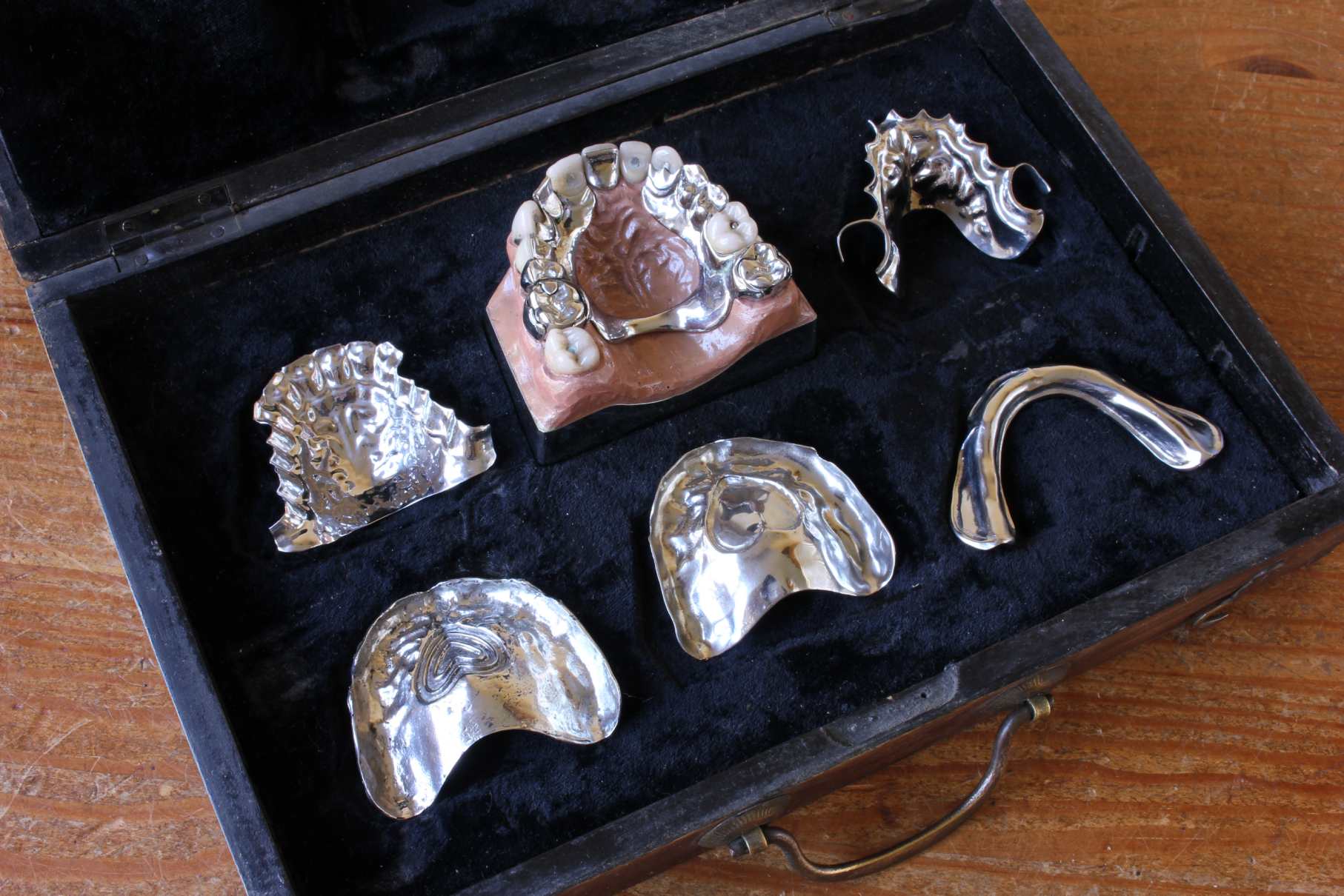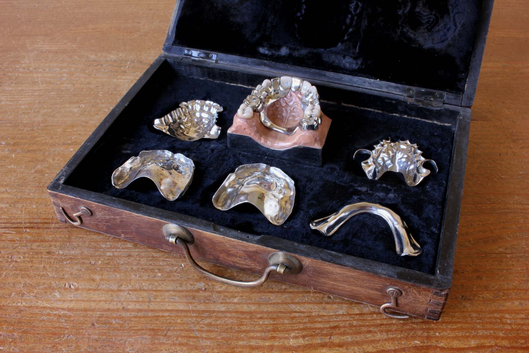 This fascinating dentistry collection is presented in it's wooden hinged display box which has a carrying handle and velvet lining and would most probably have been a salesman's trade sample set to show the dental options available to clients.
