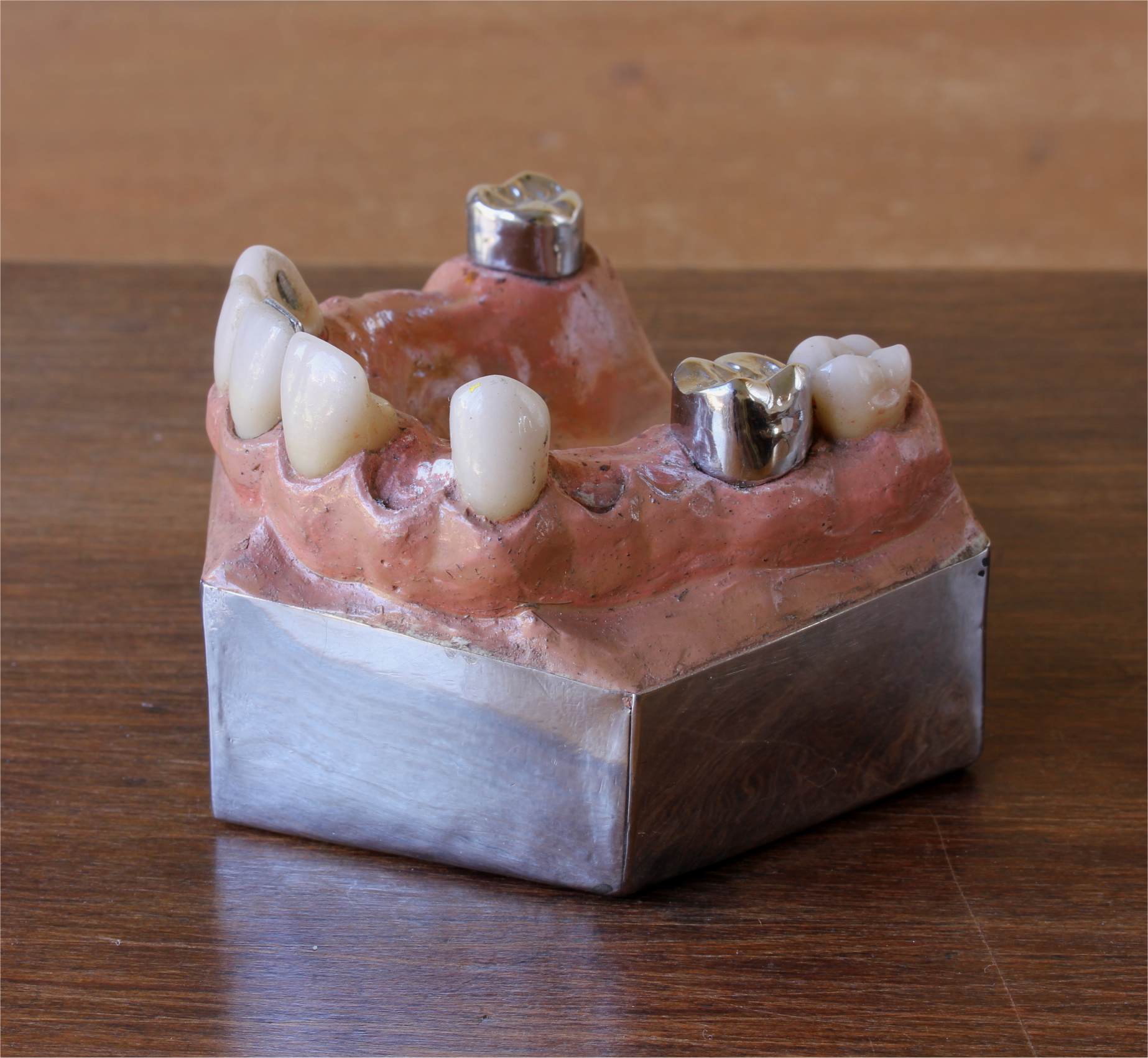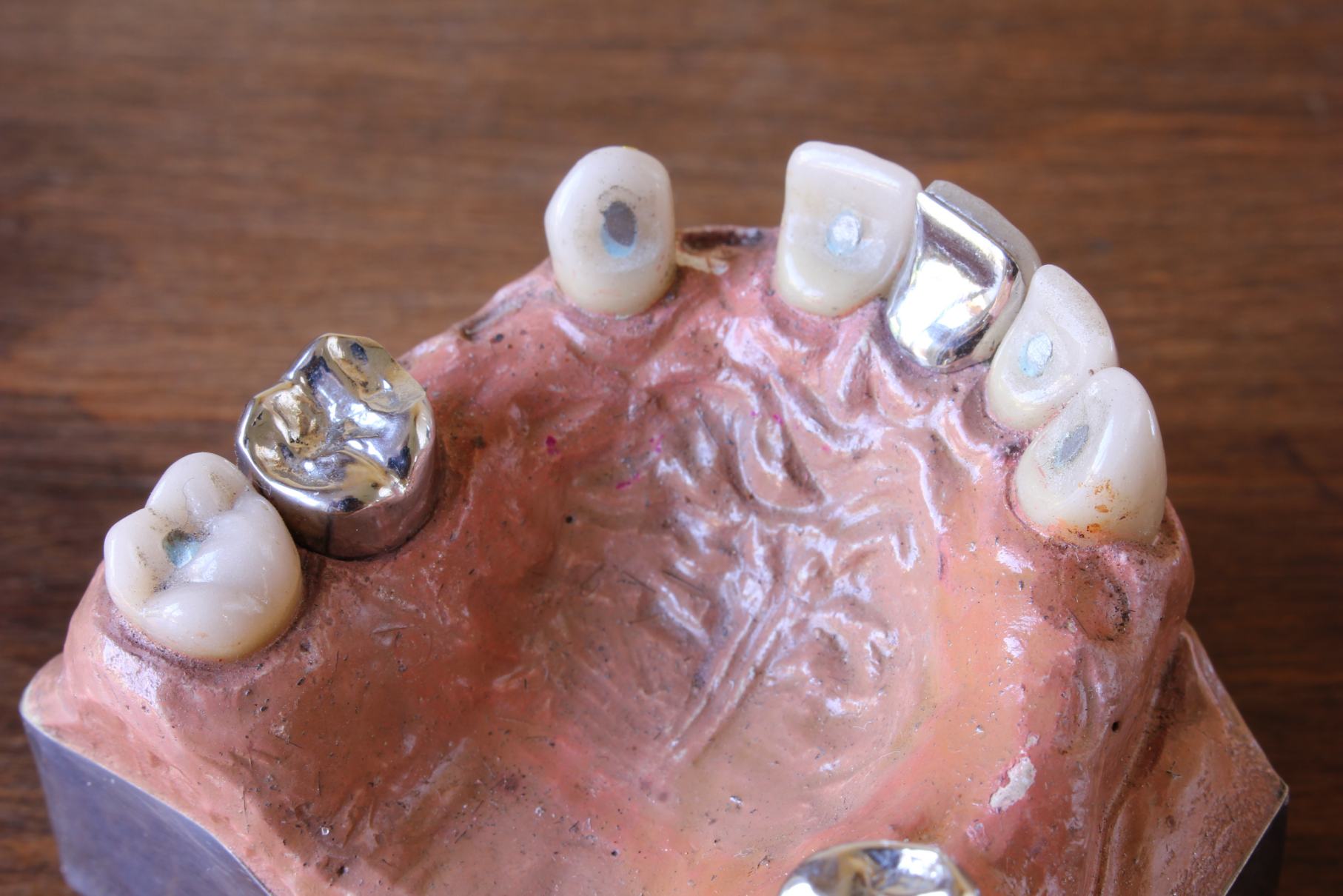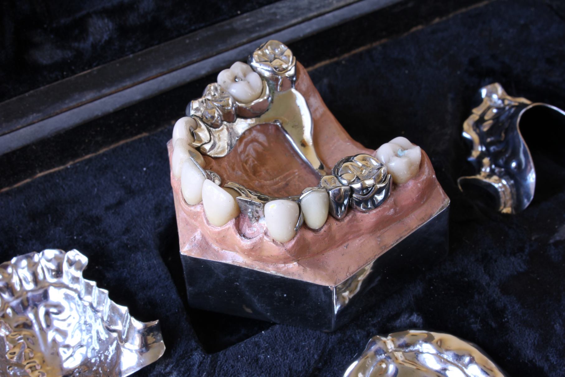 This fabulous set of antique dental fixtures consists of six metal plates and a model of the gum and inner mouth which is fitted with porcelain tube teeth.