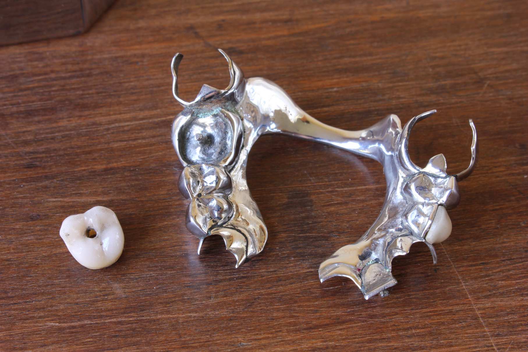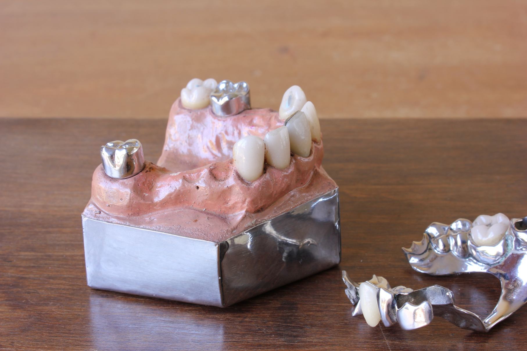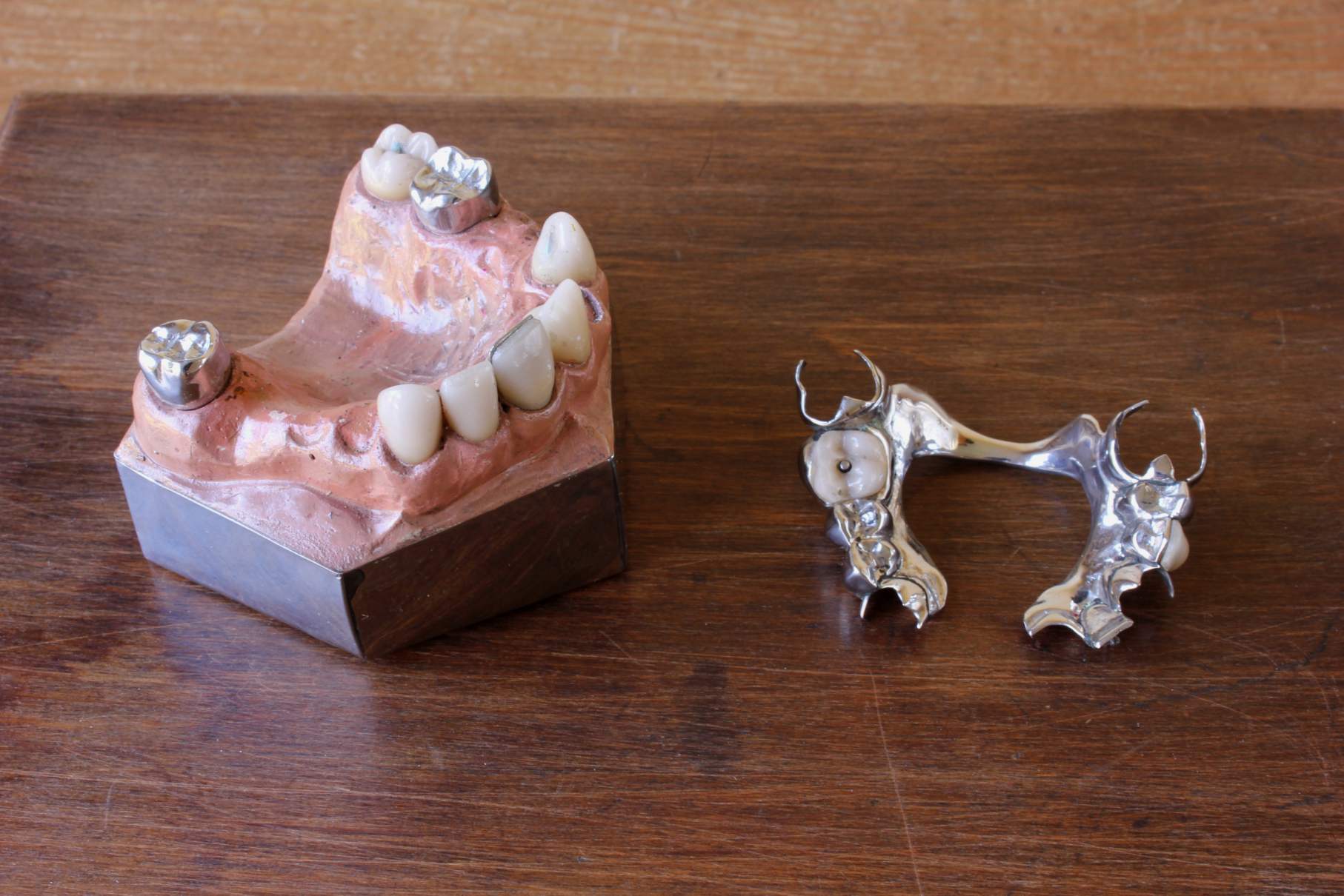 This fabulous set of antique dental fixtures consists of six metal plates and a model of the gum and inner mouth which is fitted with porcelain tube teeth.