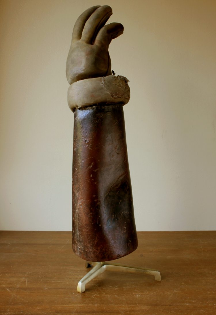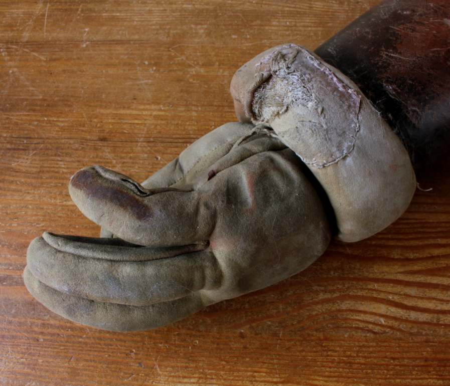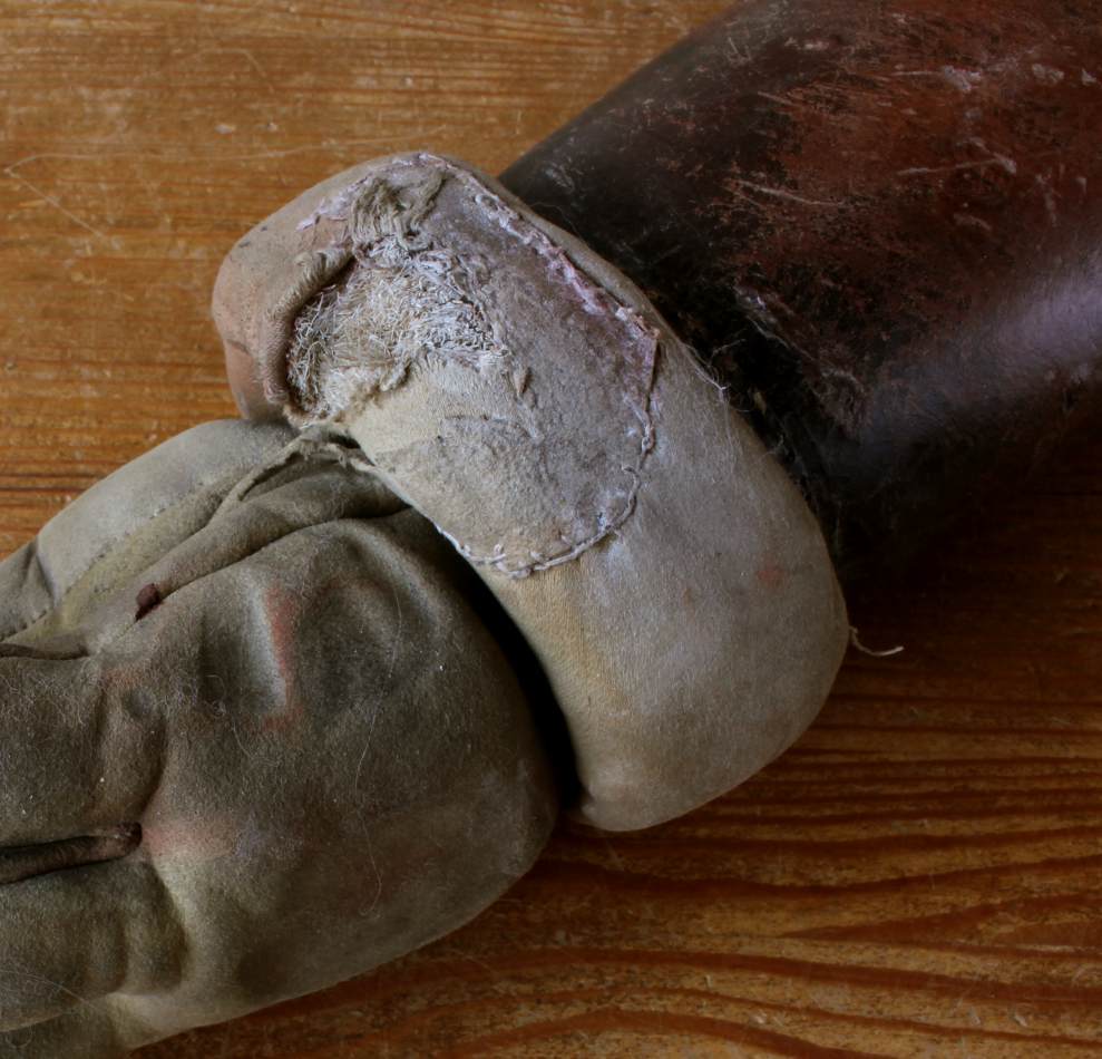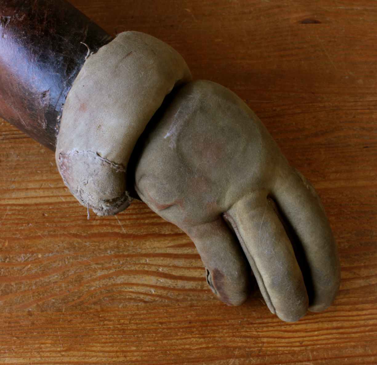 This stunning antique French fencing glove which dates from c1900 has a thick brown leather sleeve and a padded suede leather hand section.