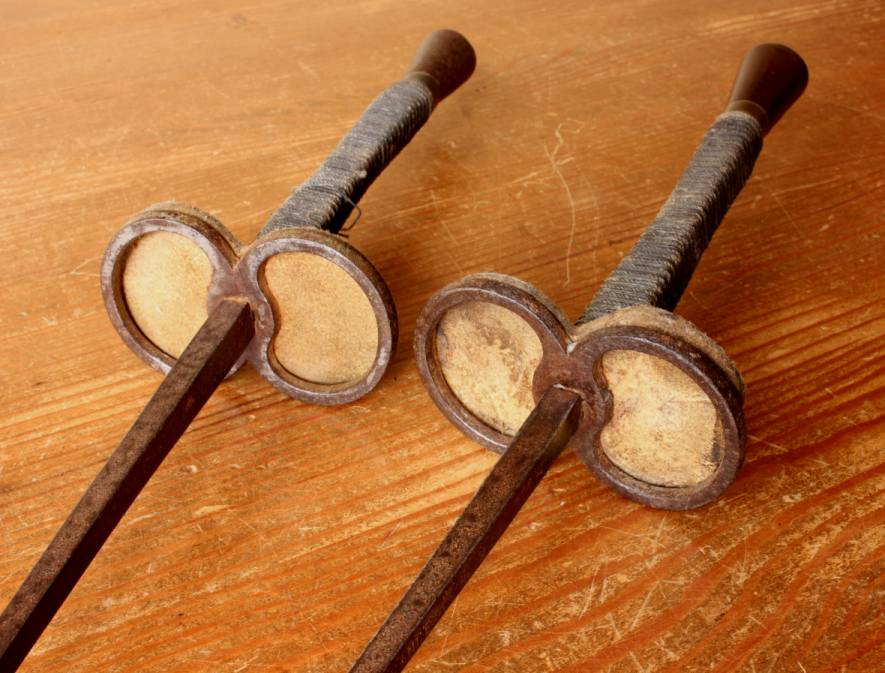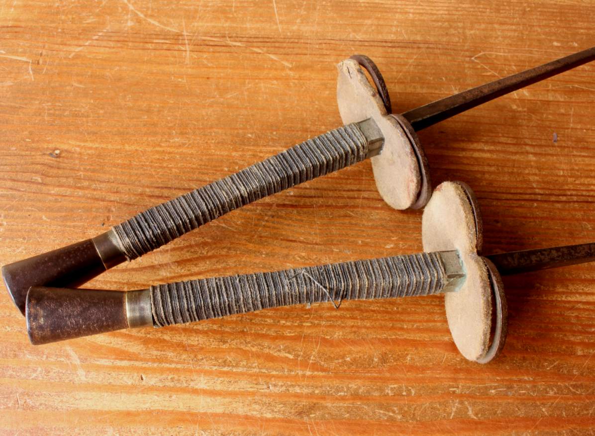 This nice pair of decorative fencing foils / epees which have steel blades, brass and leather guards, brass pommels and bound grips on rectangular wooden handles are marked France and date from the late 19th century.