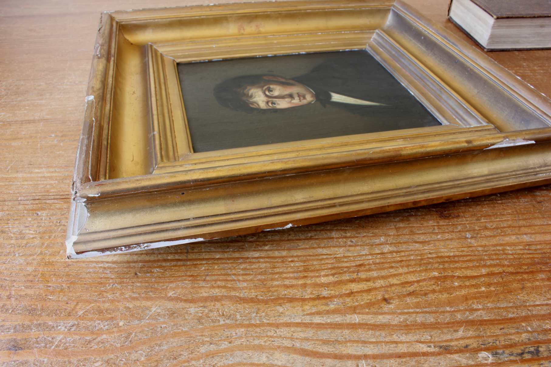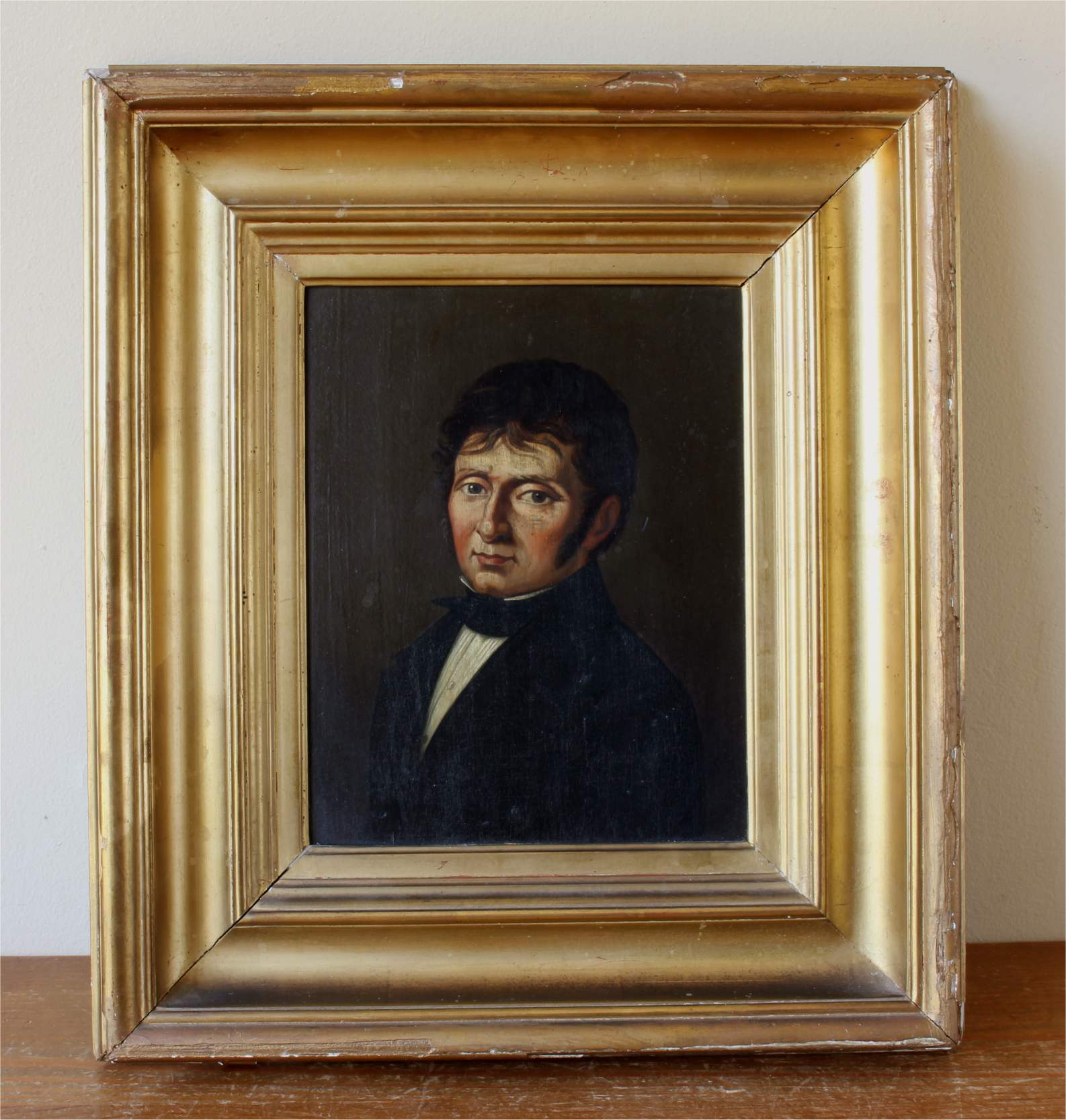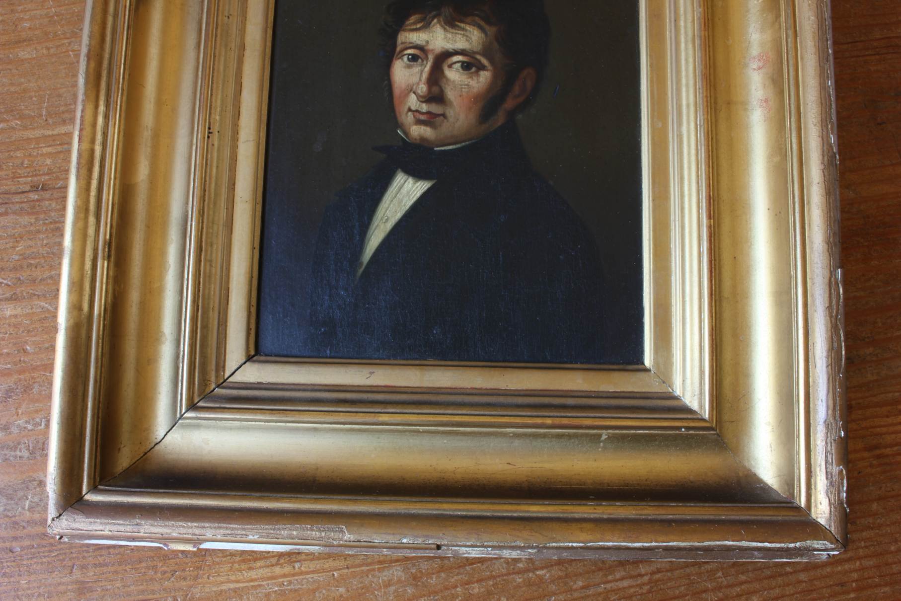 This antique French oil painting which is a portrait of a smartly dressed gentleman was well painted using oils on a wooden board in the first half of the 19th century and is mounted in a gilt wood frame.