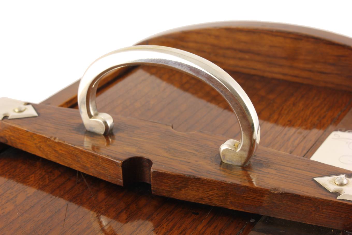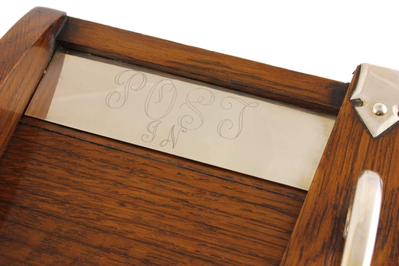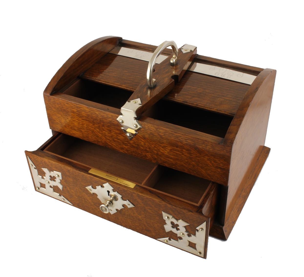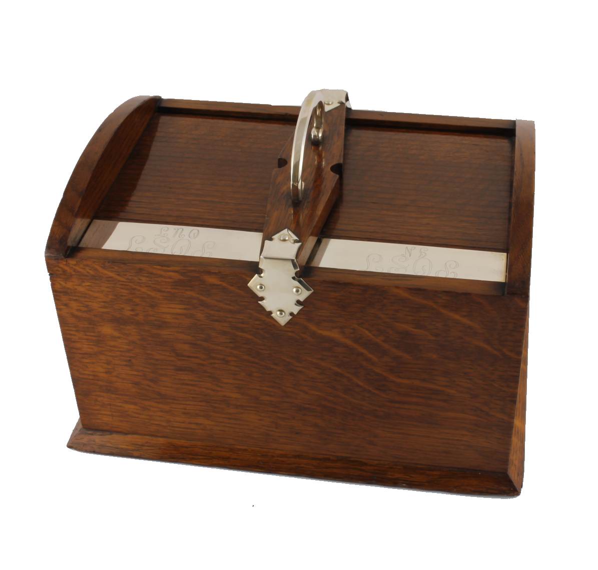 This handsome antique table humidor which is made of English oak dates from c1900 and has two compartments to the top with silver plated fittings which are nicely engraved with Post In and Post Out.