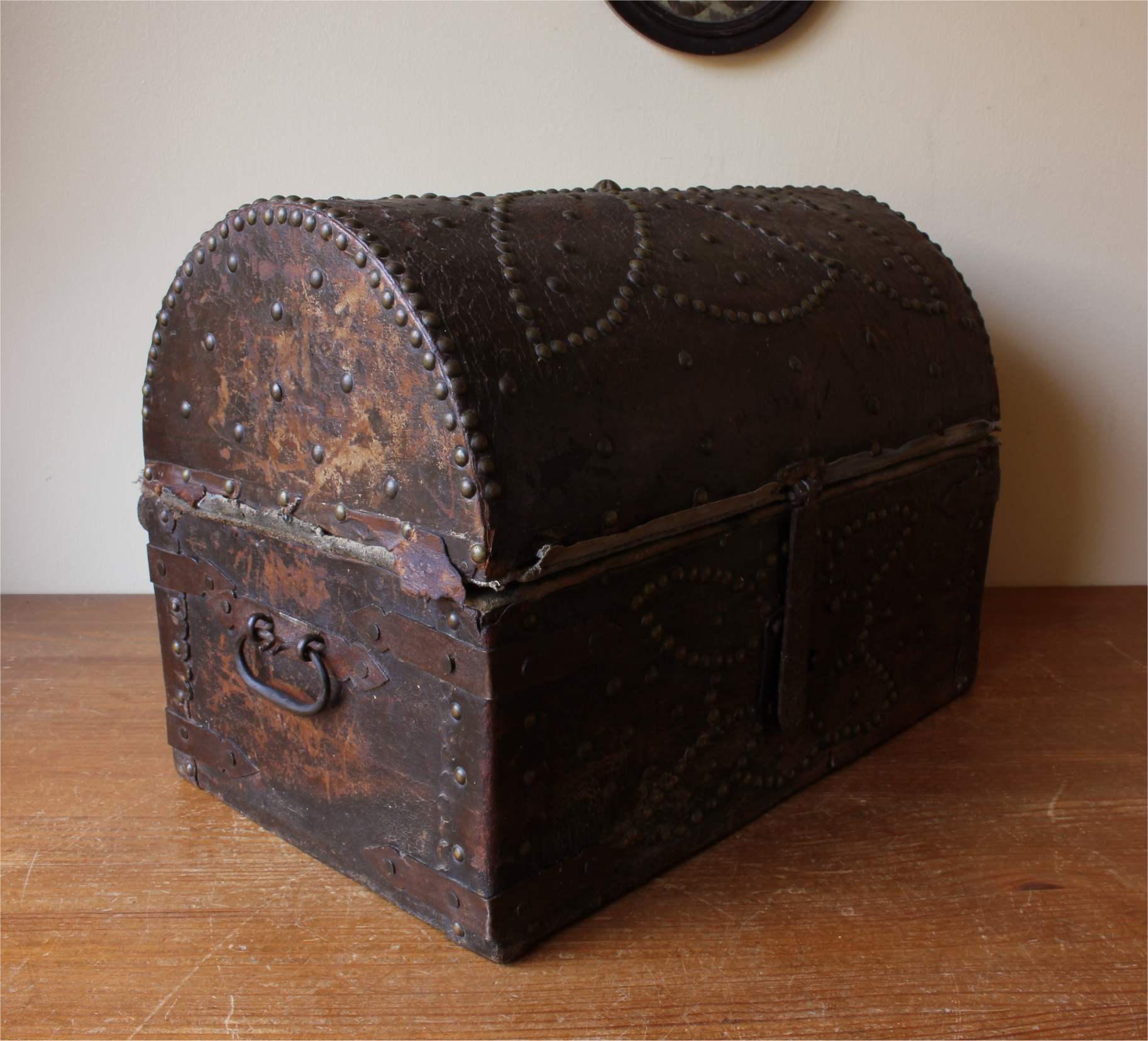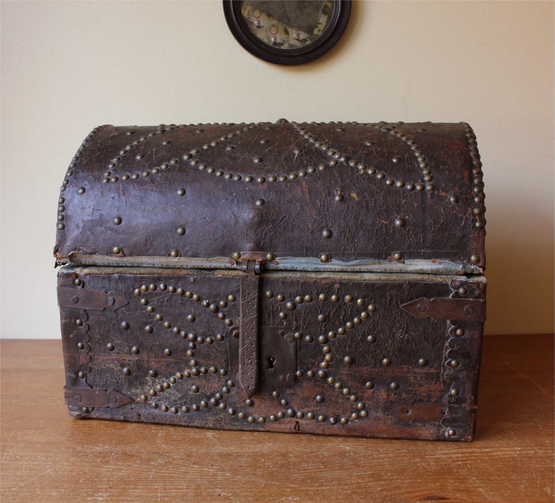 This fabulous Spanish brown leather trunk with beautiful brass stud-work which includes floral studs has a domed lid and dates from the late 17th / early 18th century.
