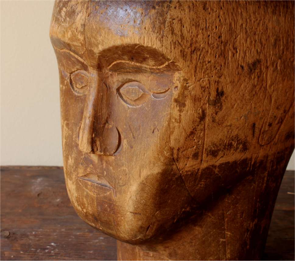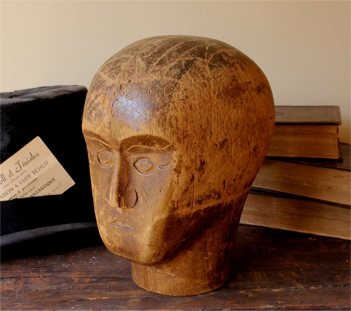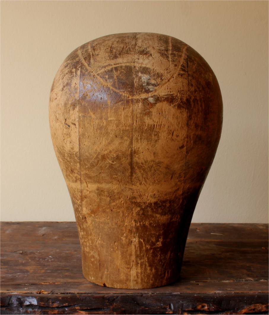 This handsome head shaped wooden hat block was made with hand carved facial features of eyes, nose, mouth, ears and chin, is a wonderful brown colour and has accumulated lots of pin holes and wear over the years leaving a wonderful look. The underside is marked with the number 57.