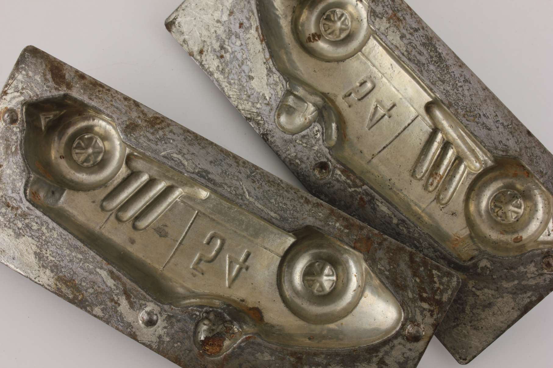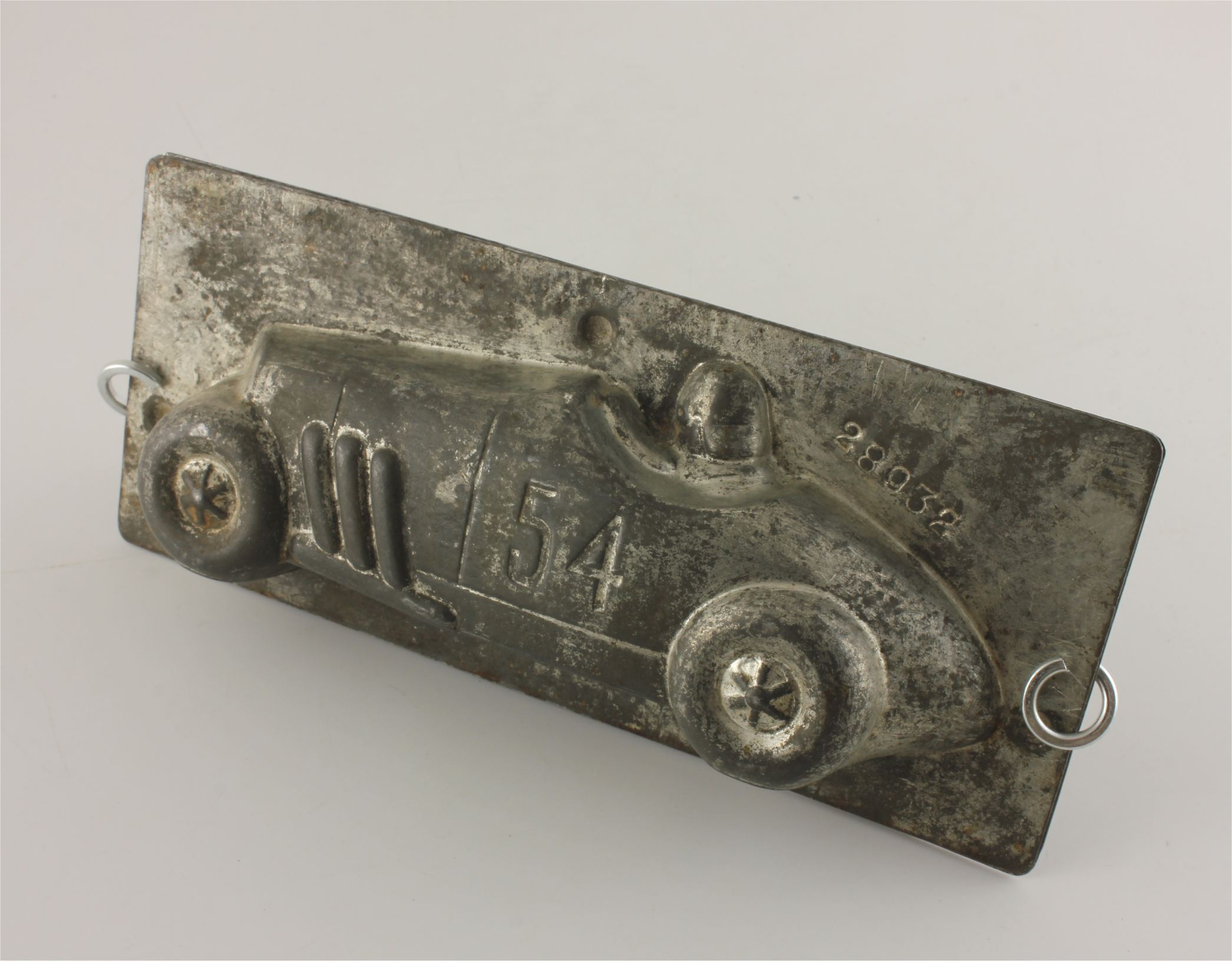 This antique mould which comes in 2 sections is of an early racing car marked number 54 with it's driver.