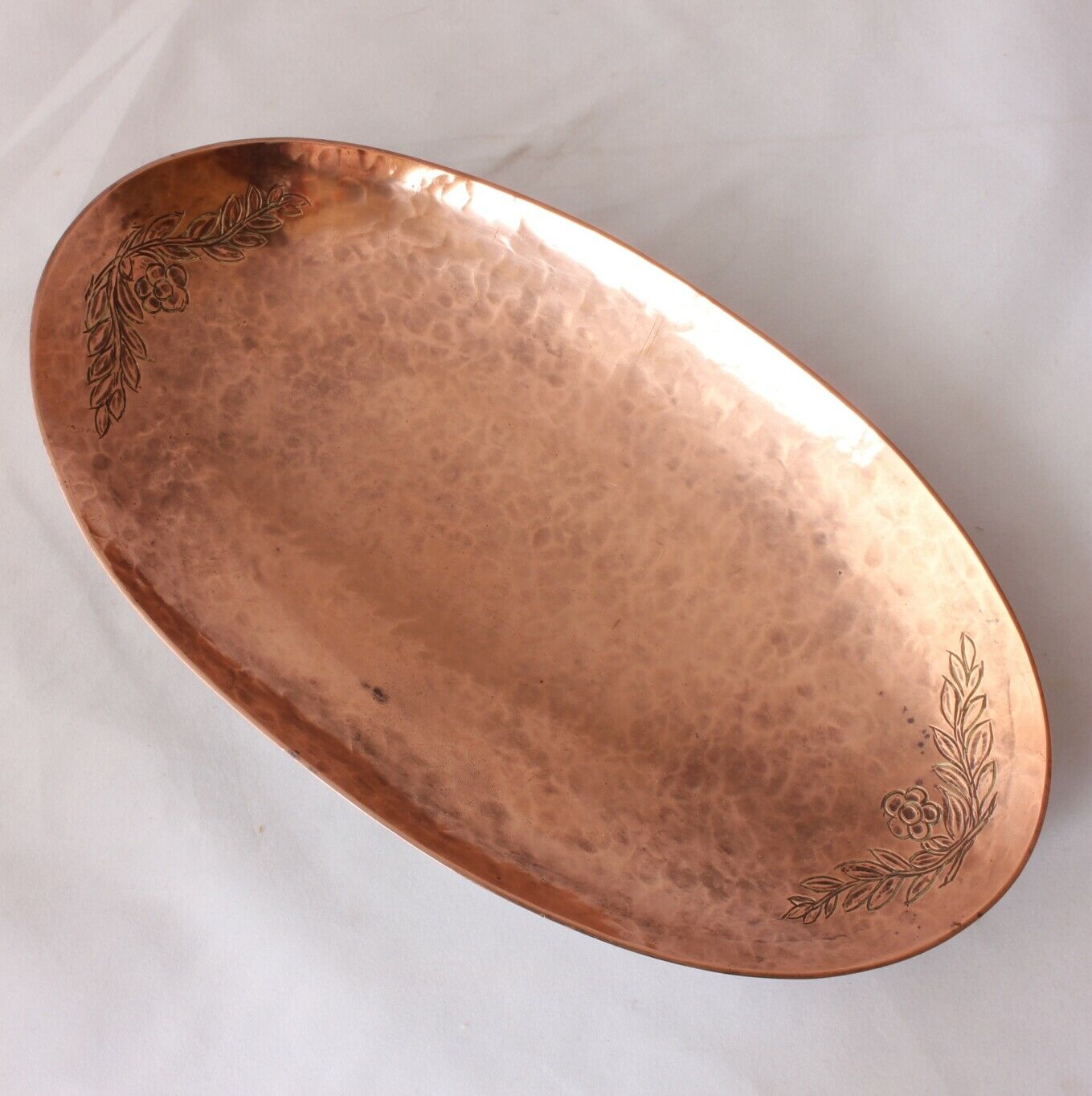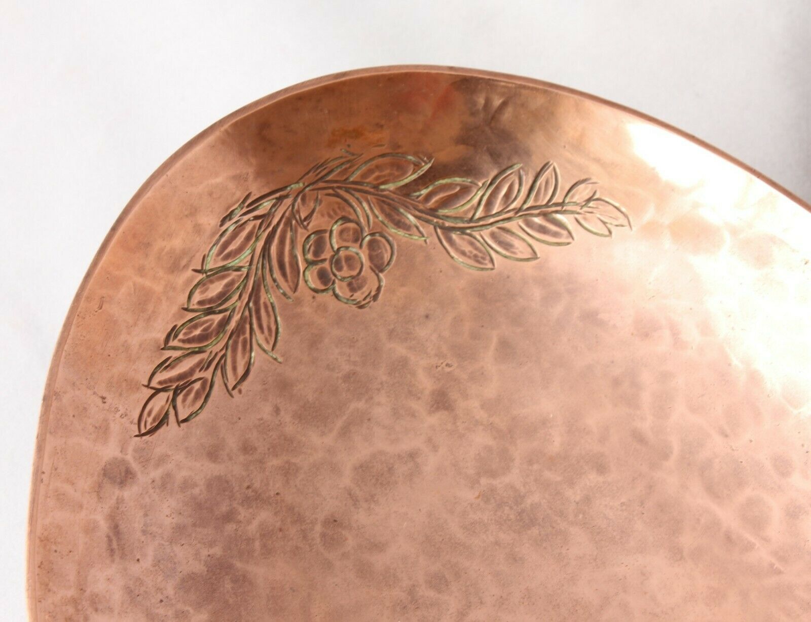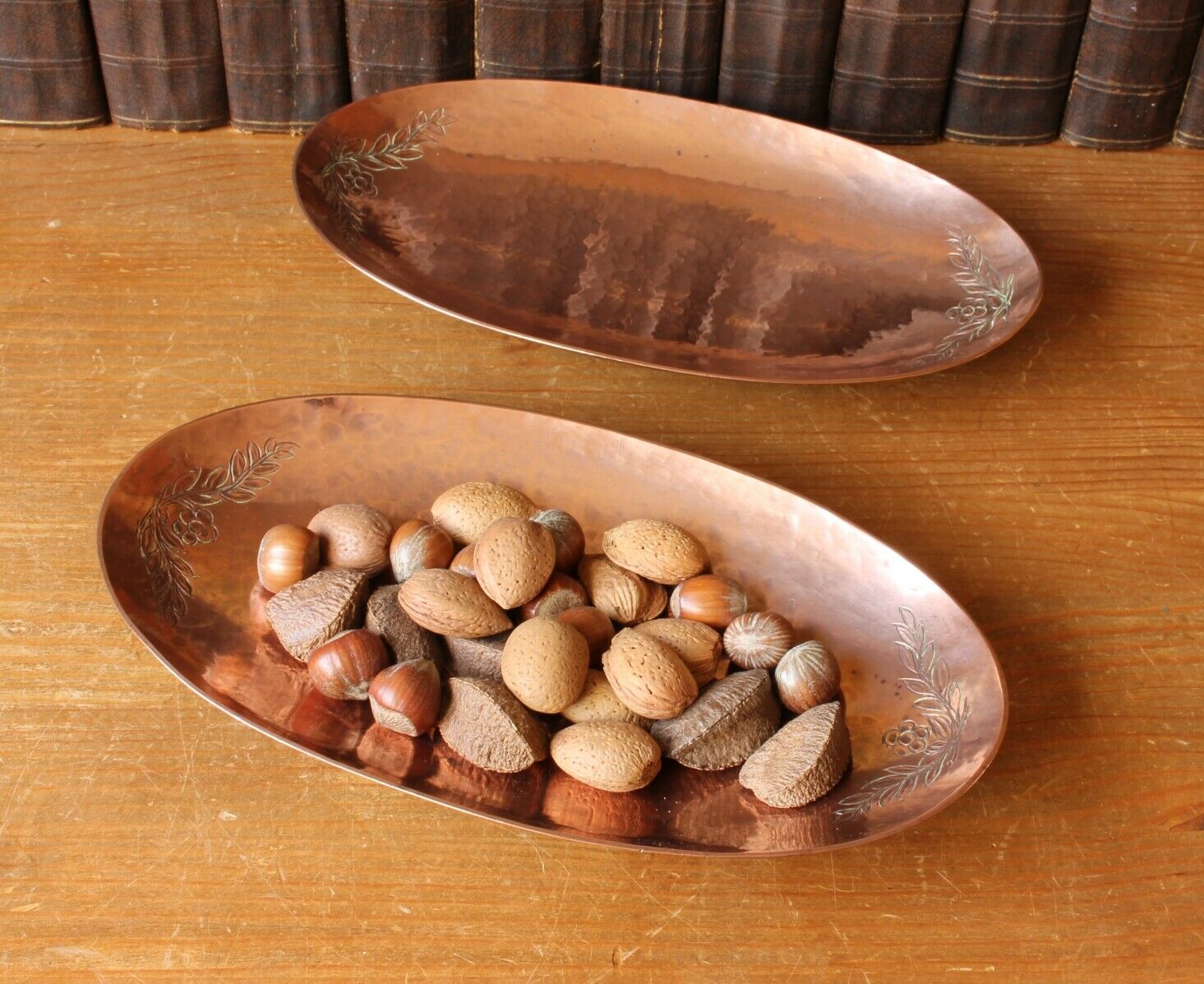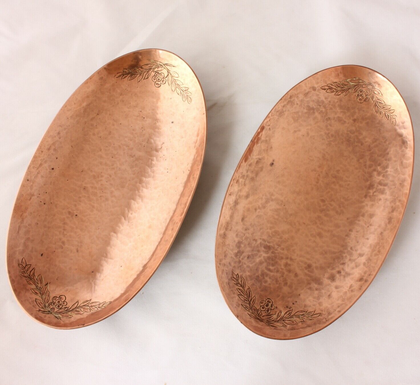 This pair of hand made copper dishes with hammered finish and flower design date from the early 1900's and are very stylish.
