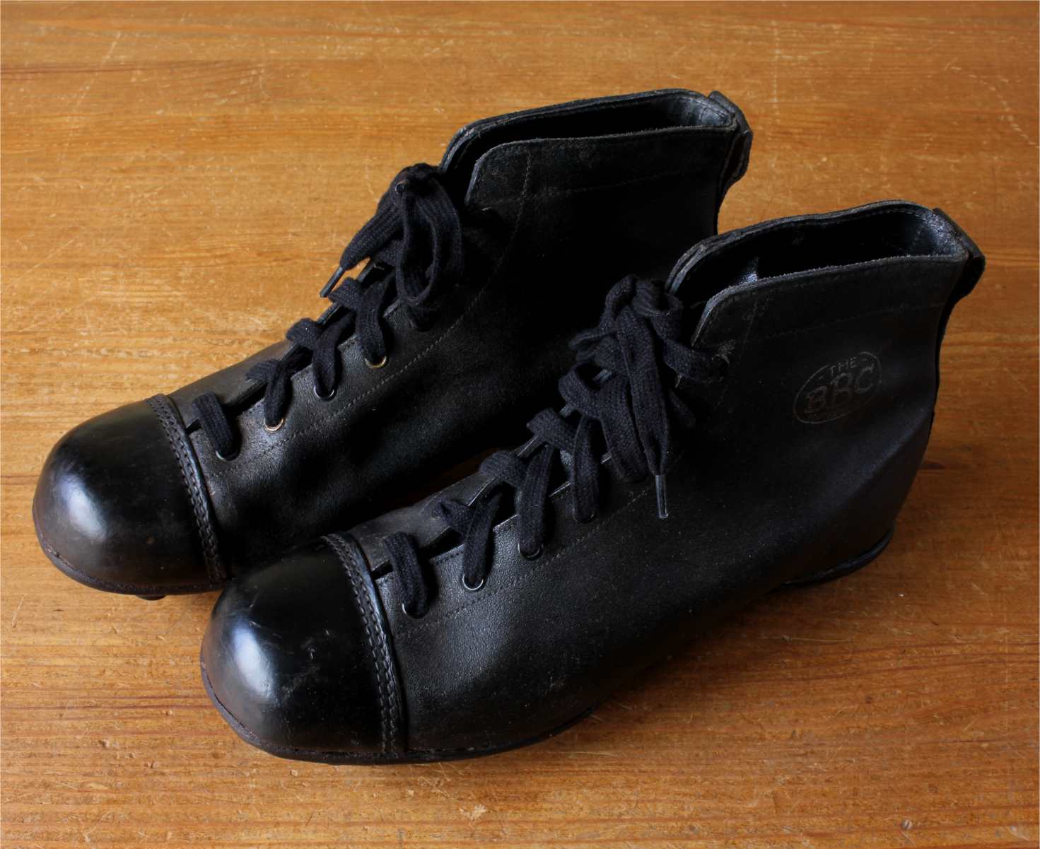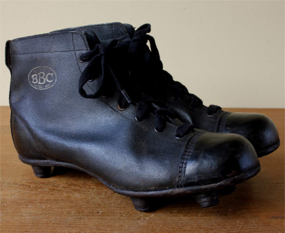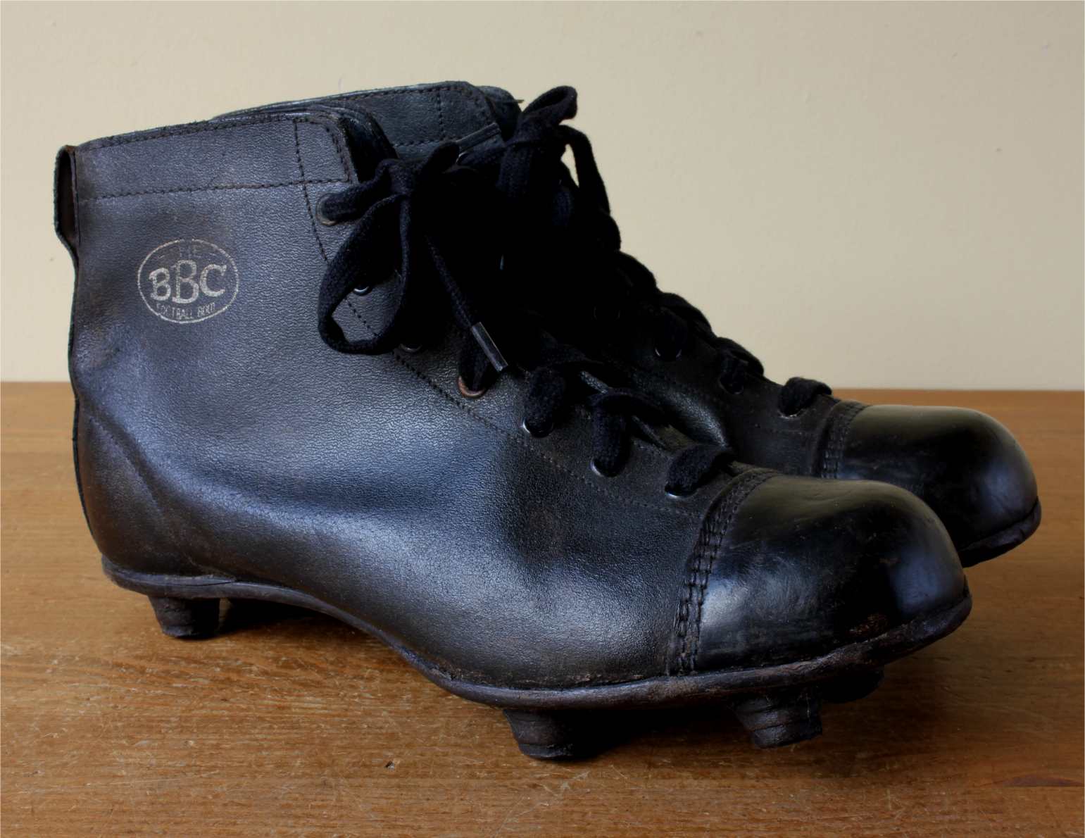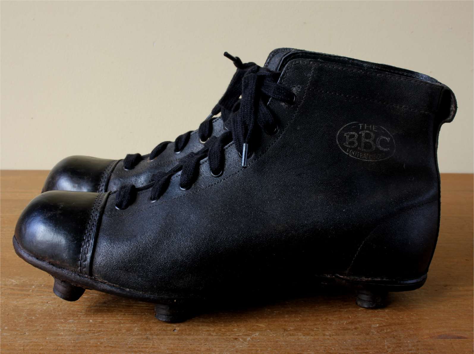 This rare pair of THE B B C branded football boots which are made of black leather have leather soles, nailed on studs, black cord laces and date from c1940.