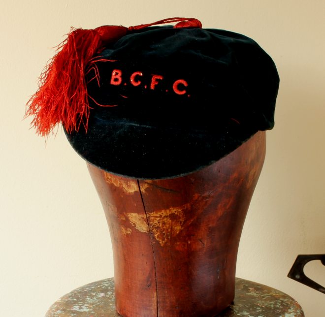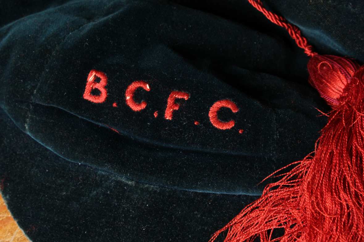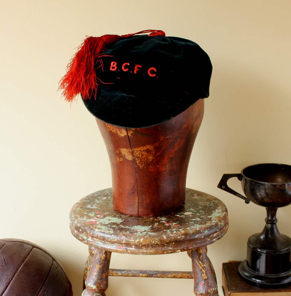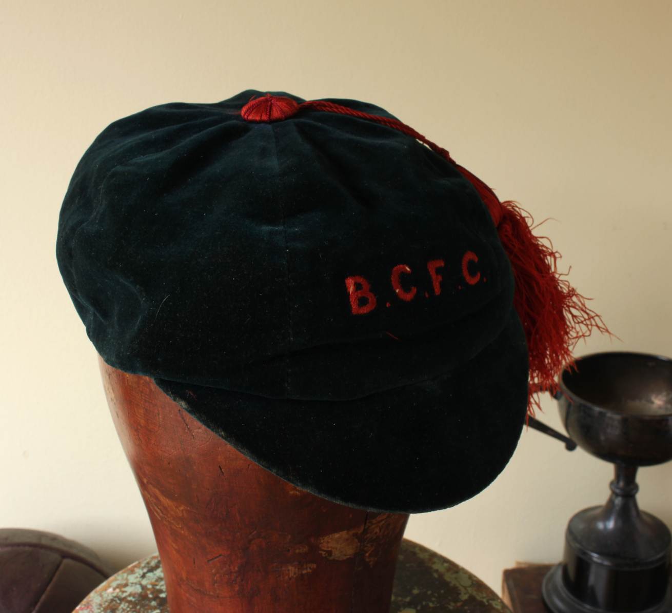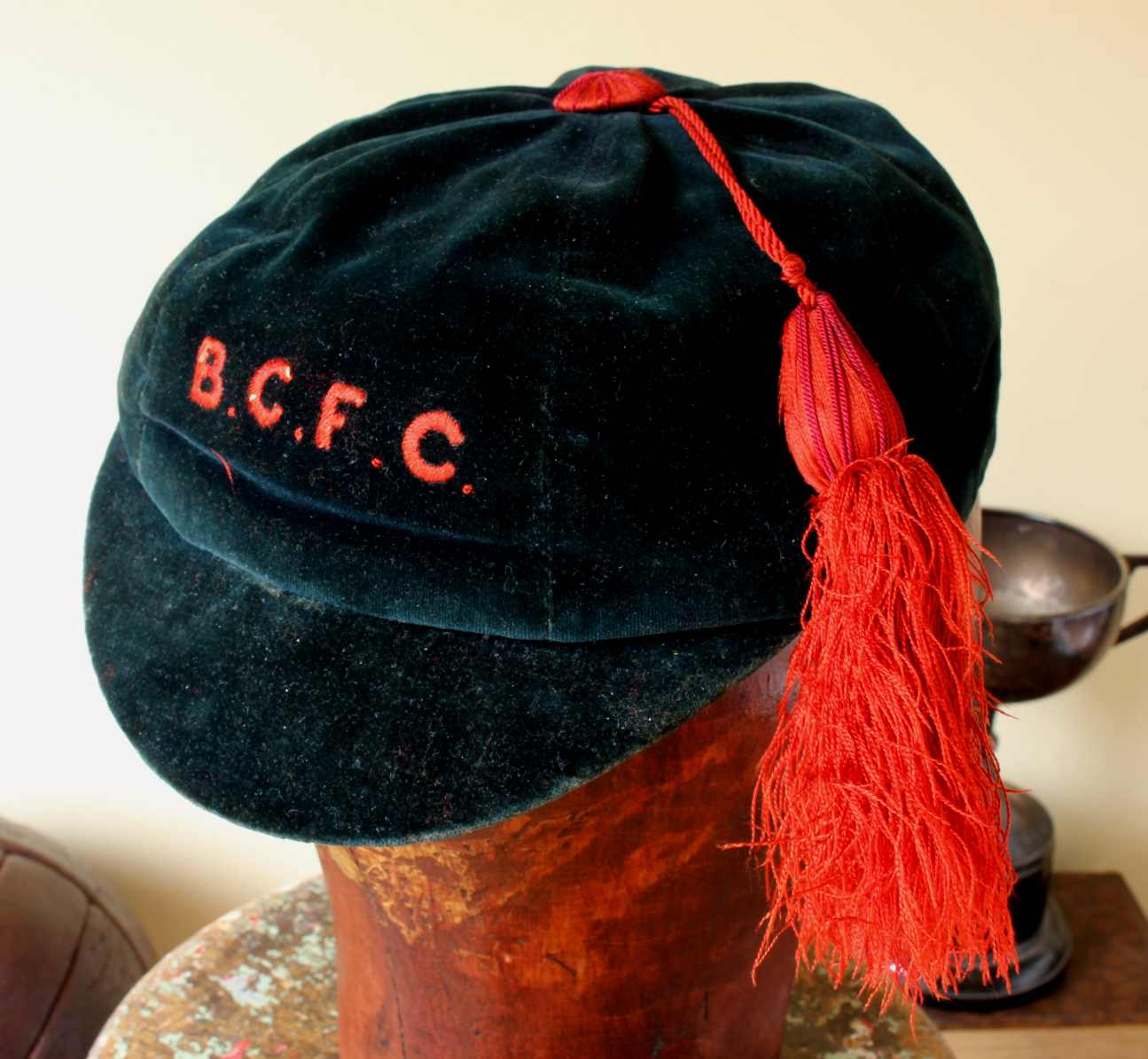 This very nice antique football sports cap which is made of velvet cloth is embroidered to the front with B.C.F.C in red braid with a red braid tassel.