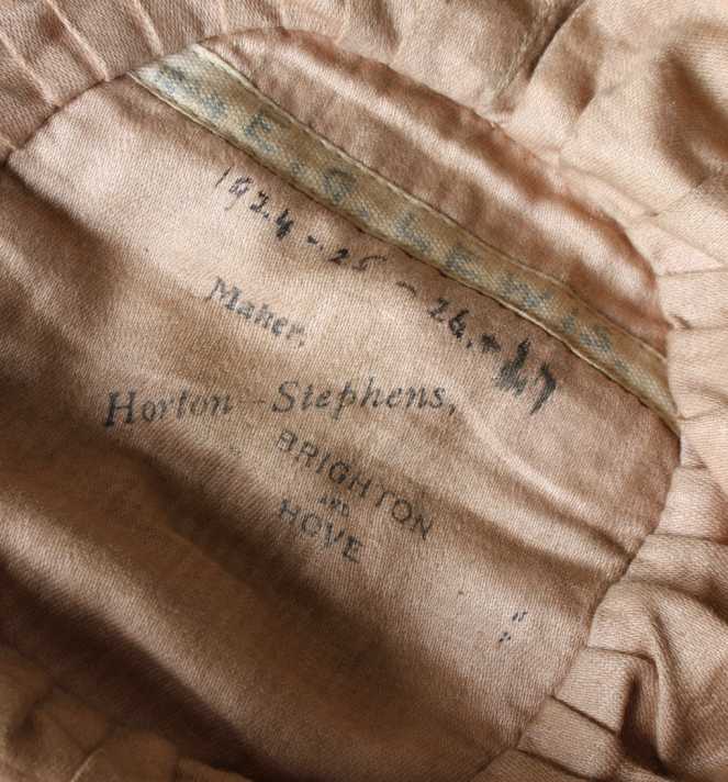 This football cap dates from the 1920's and is marked to the inside with the maker's details of Horton Stephens of Brighton and Hove. Also marked with 1924 1925 1926 1927 and the previous owner's details of E.G. Lewis.