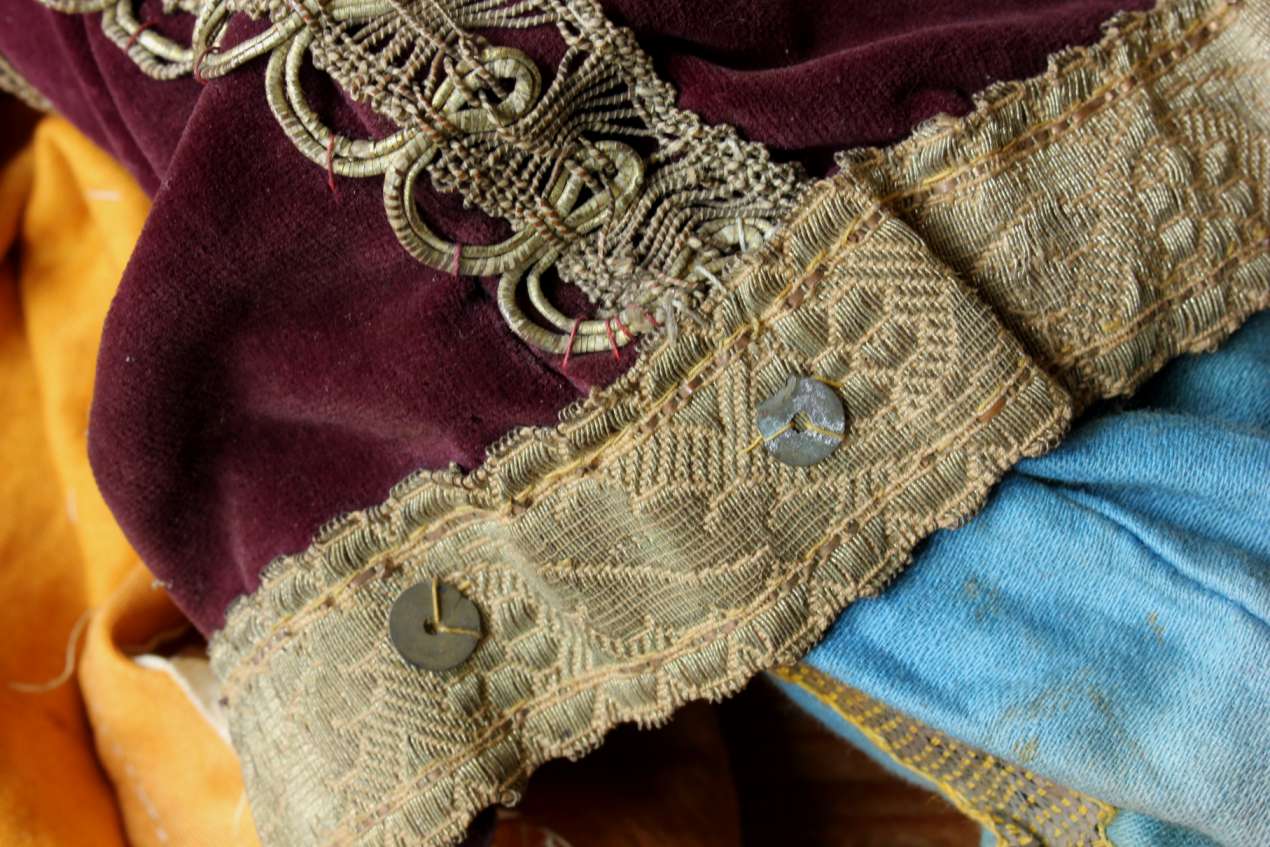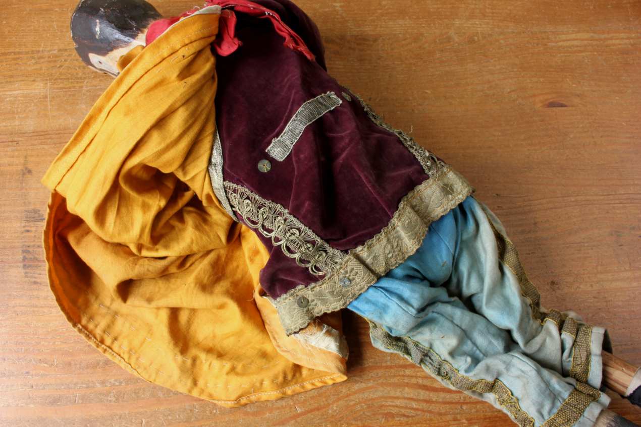 This articulated mannequin puppet figure which is a tall size at 61 cm high has a carved face with painted features such as a beard, original hand stitched clothing which include long trousers, velvet jacket with gold braid, an orange cape and has with a hanging loop to the top of his head.