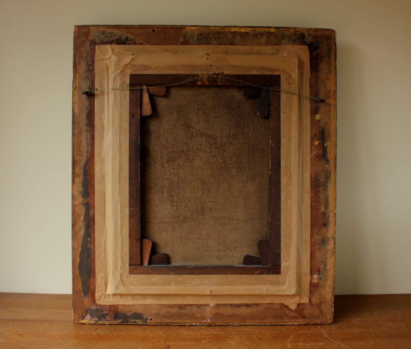 Condition: Very good antique condition with signs of use in keeping with age. Artwork has some crazing, small marks and a few touch ups. Frame has some chips, cracks, wear and marks. Please see pictures.