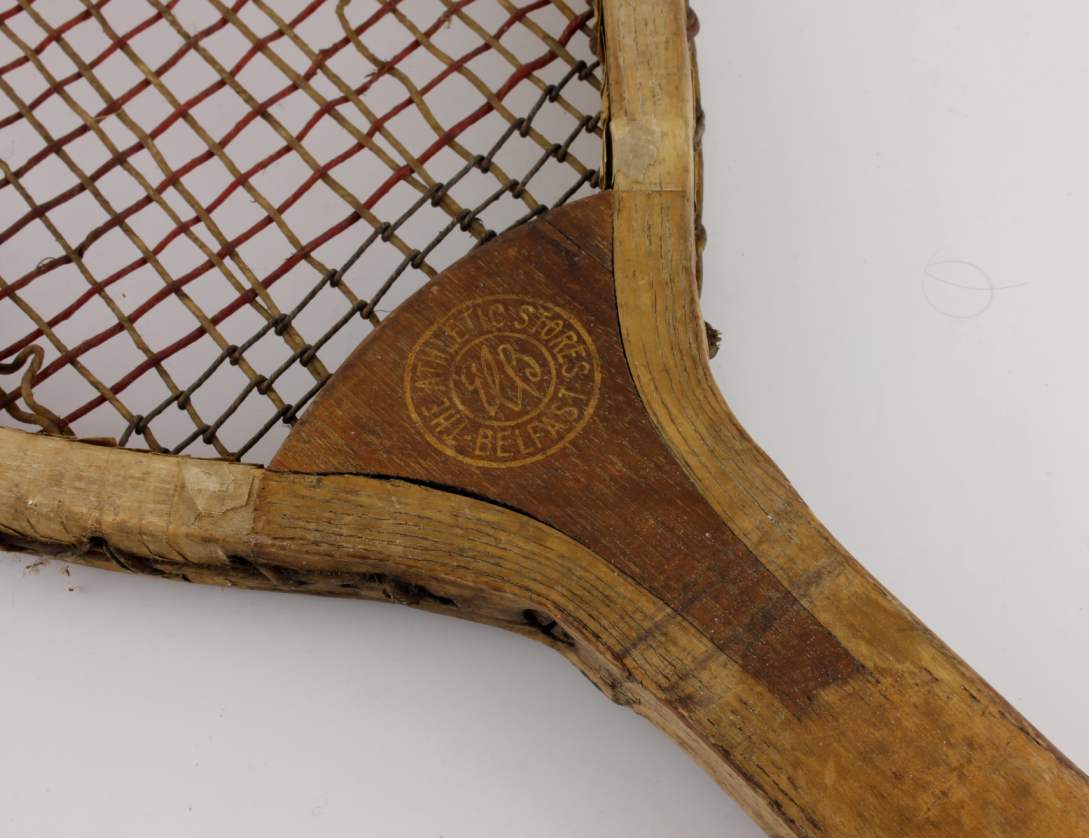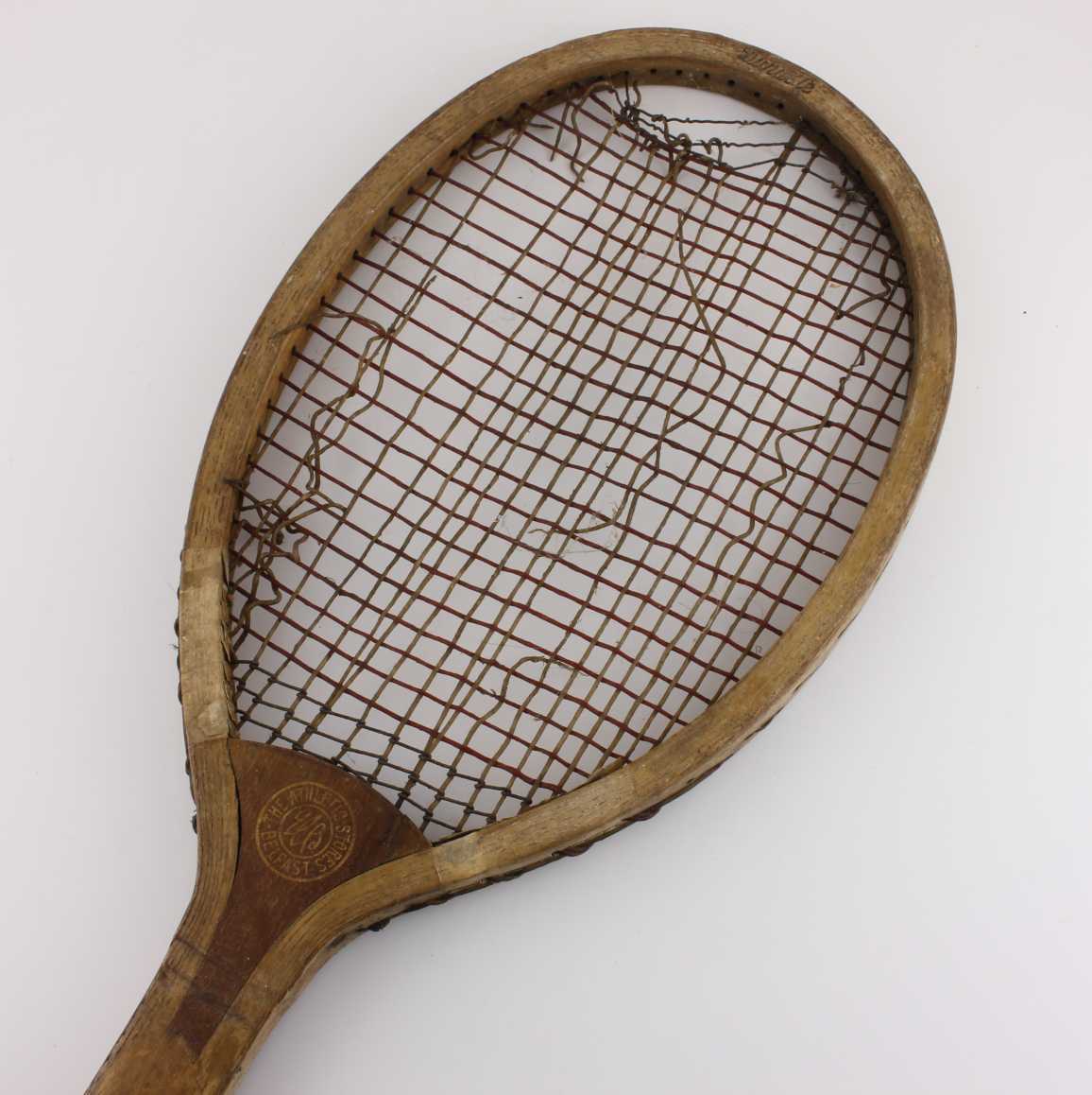 This great looking antique wooden lawn tennis racket embossed with the maker's details for The Athletic Stores Belfast has a wood frame with a convex wedge to the throat, gut stringing and is stamped with the word Durable to the top edge.