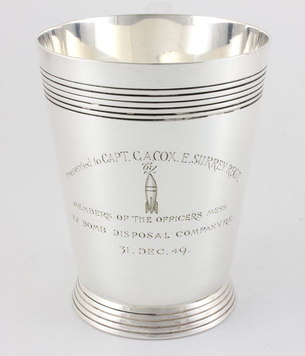 This also shows the 22 Bomb Disposal Company logo and would have been engraved and presented to Captain Cox when their bomb disposal company was disbanded at the end of 1949.