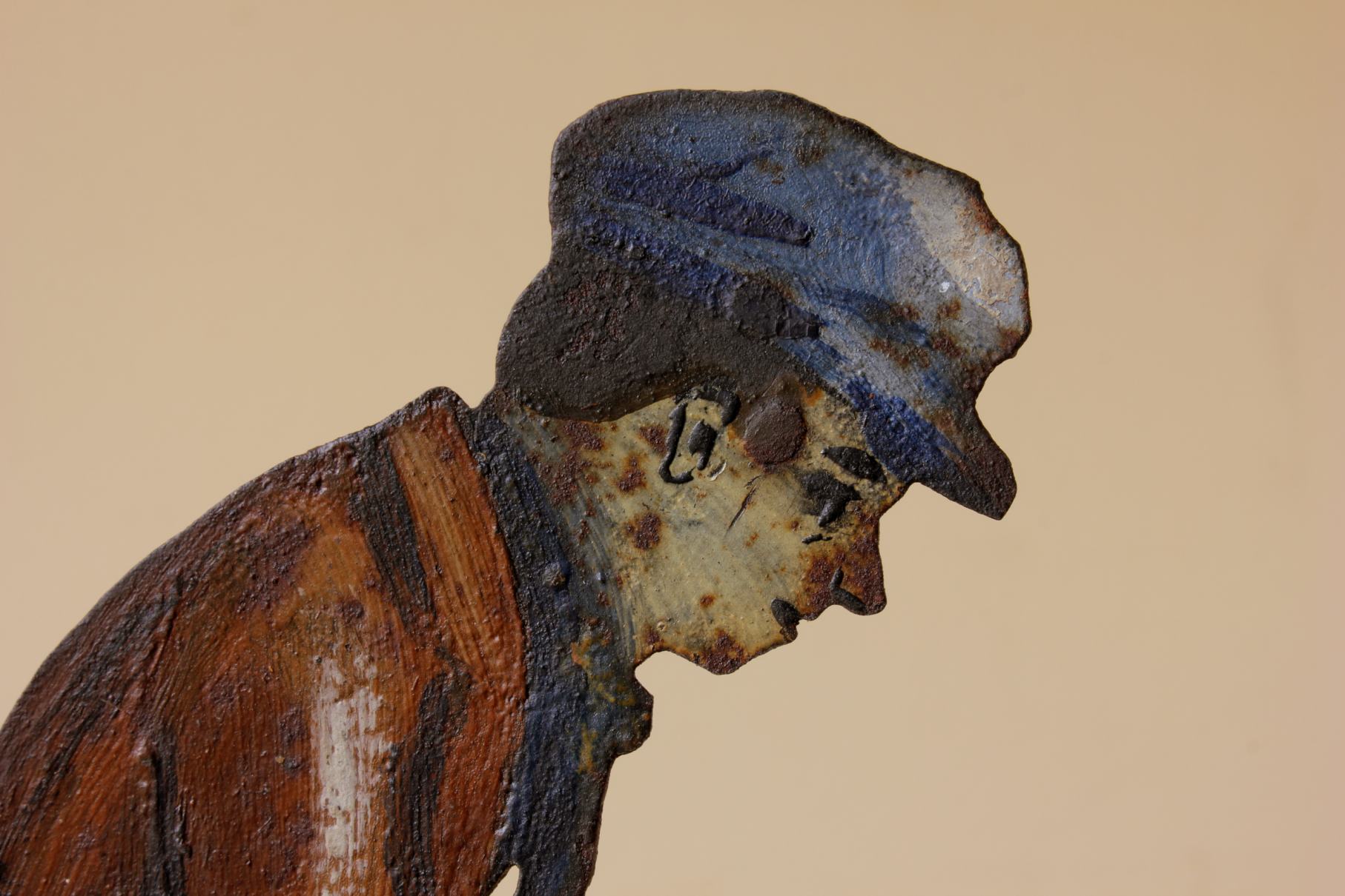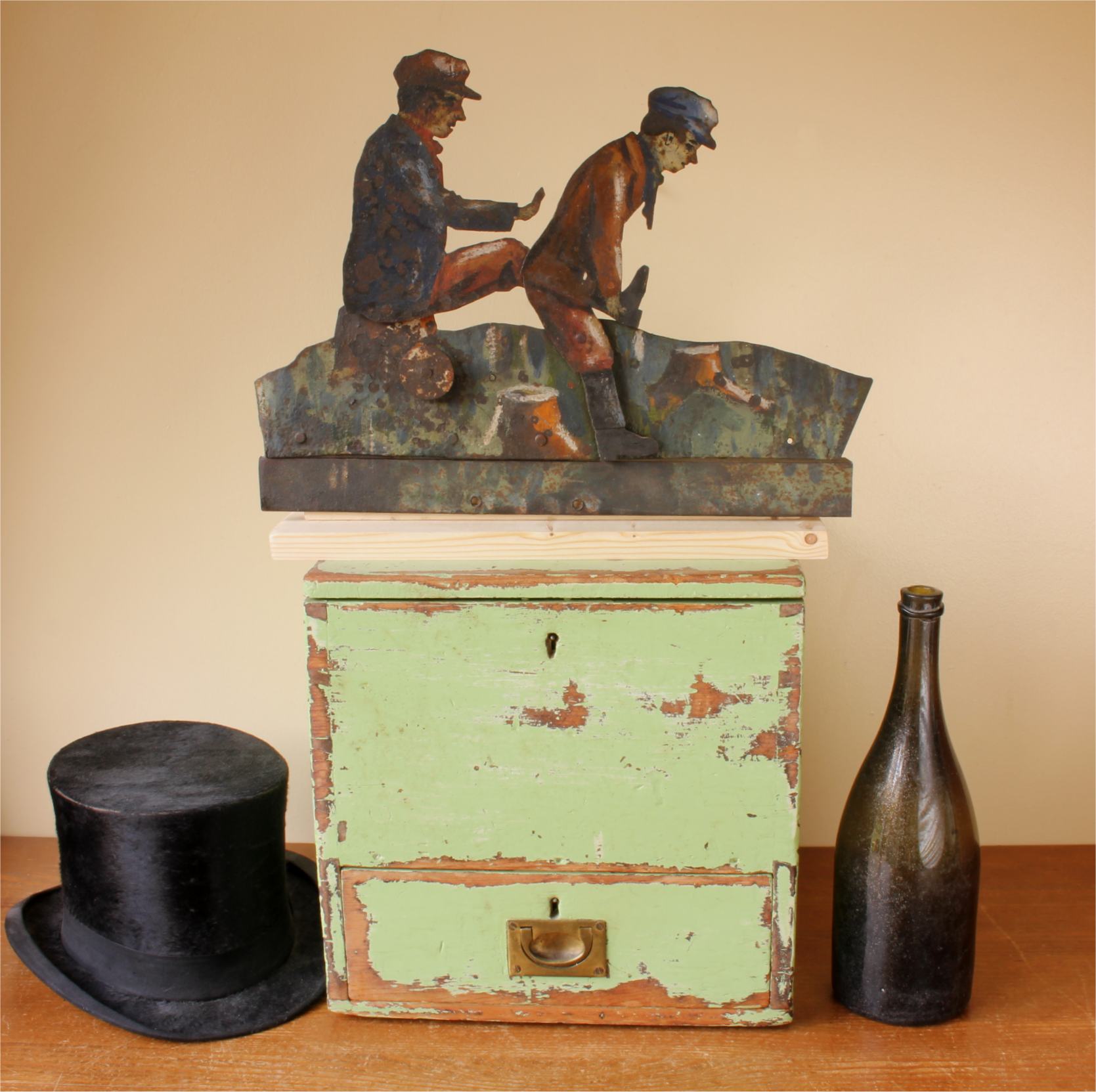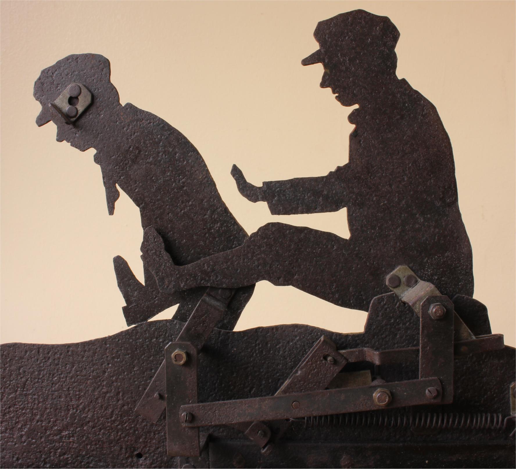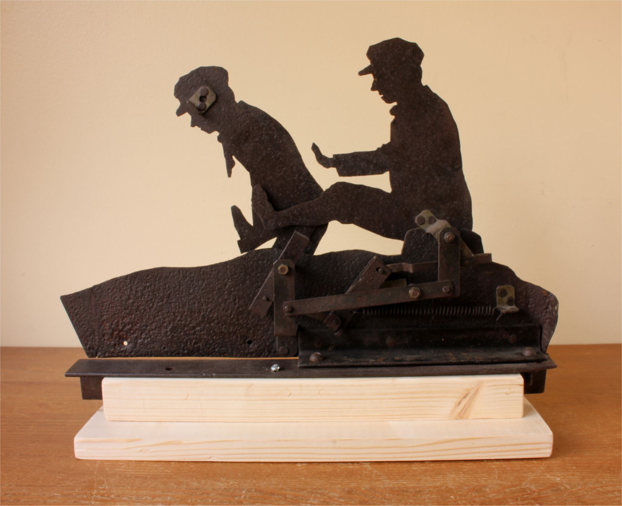 This humorous automated target which has mechanical workings would have been part of a fairground shooting game where carnival goers would shoot at the target plate and when it was hit one of the men would fall backwards pulling off the other man's boot.
