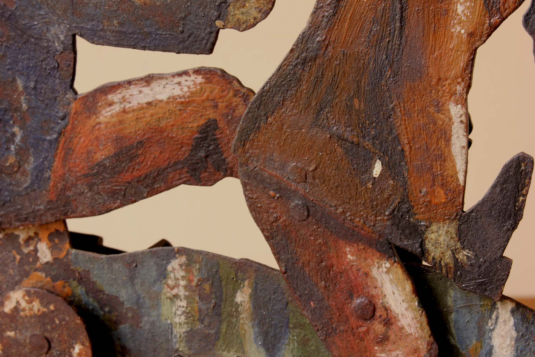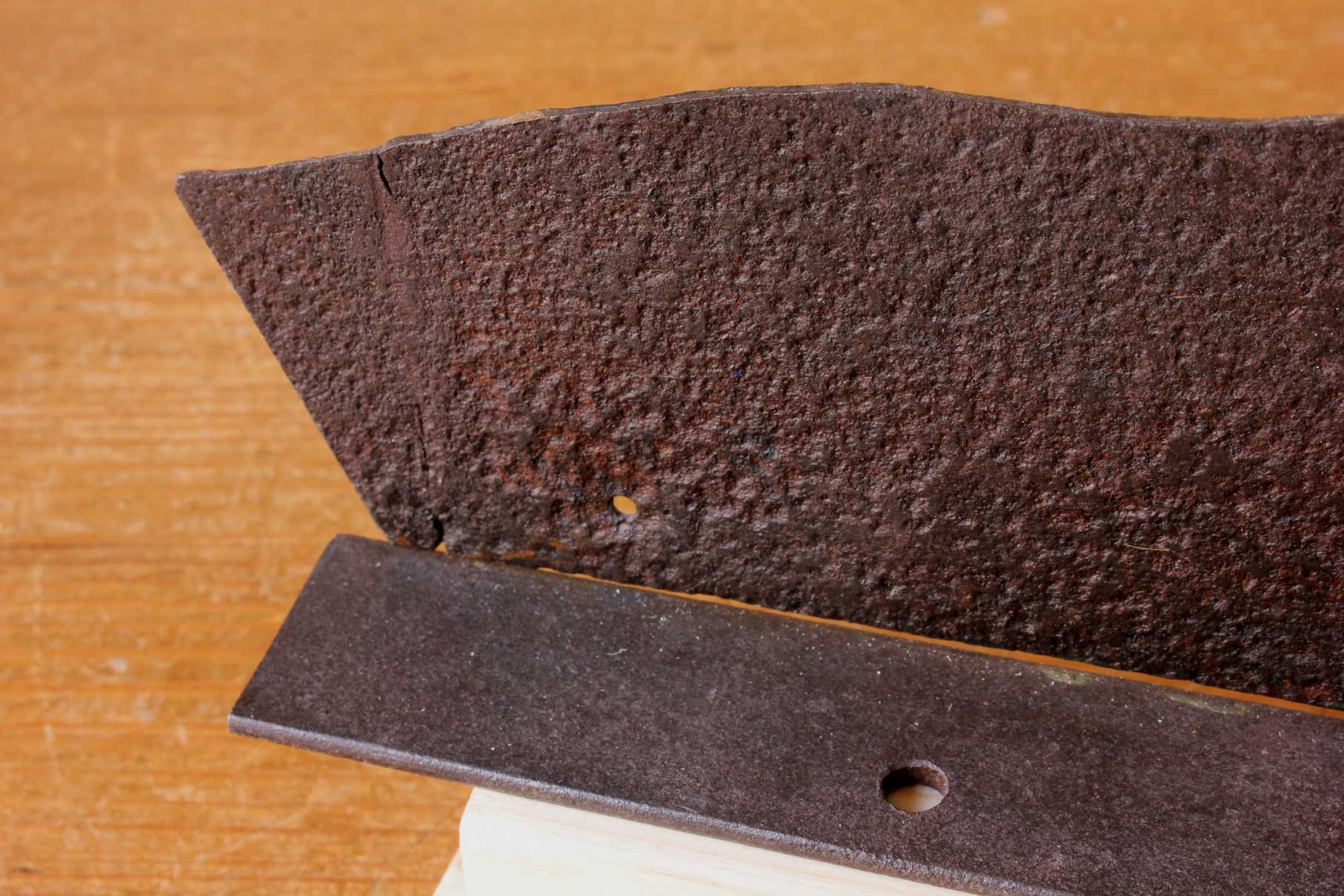 Material: Iron. Has been mounted on a simple wood base as a support.
