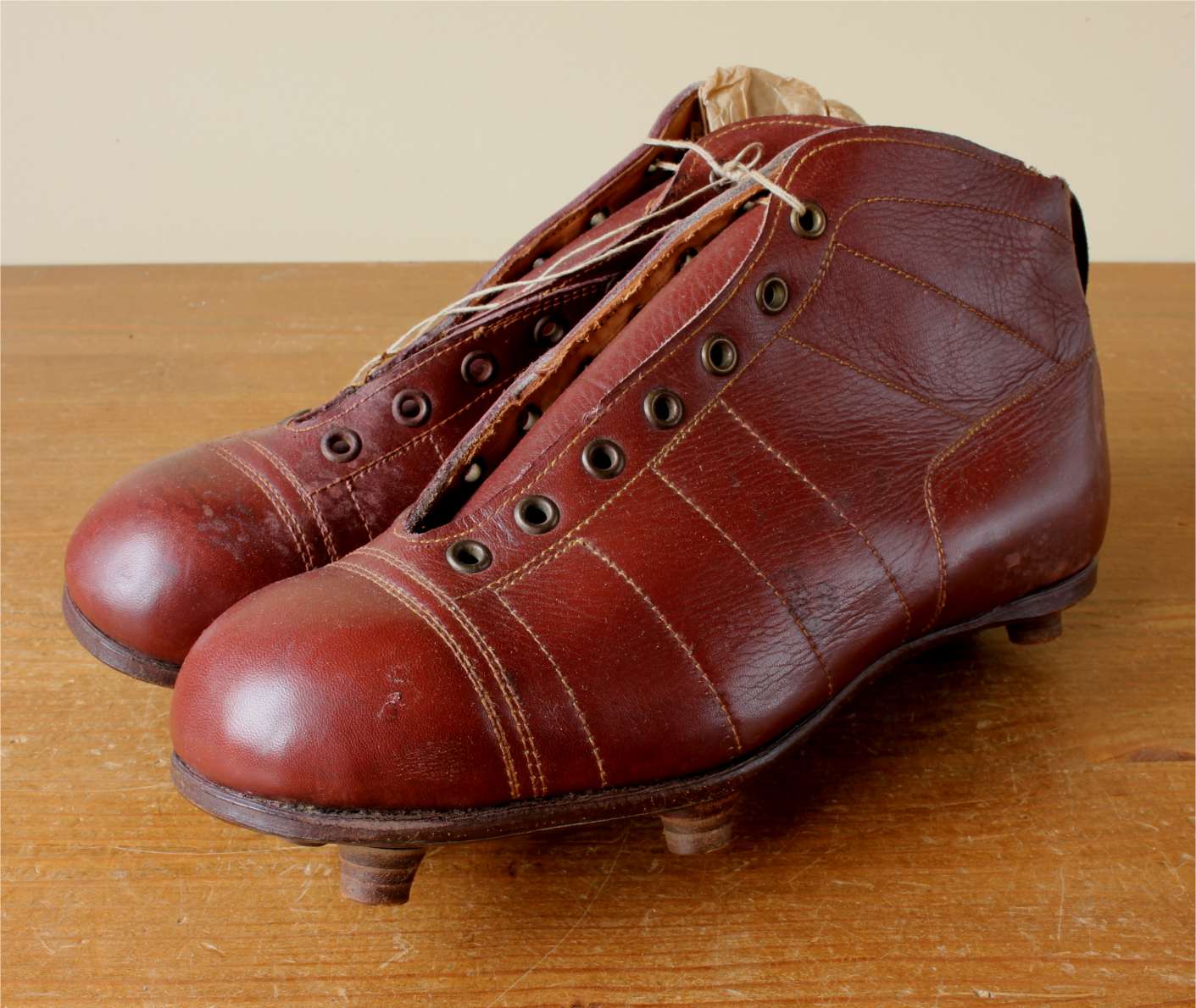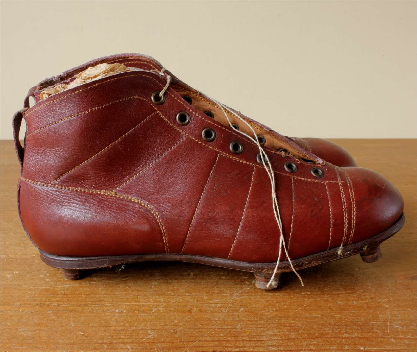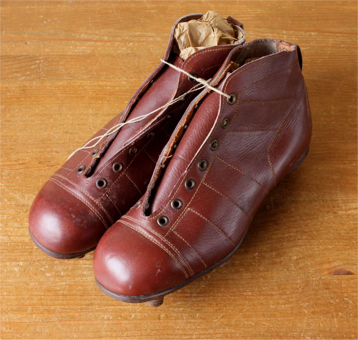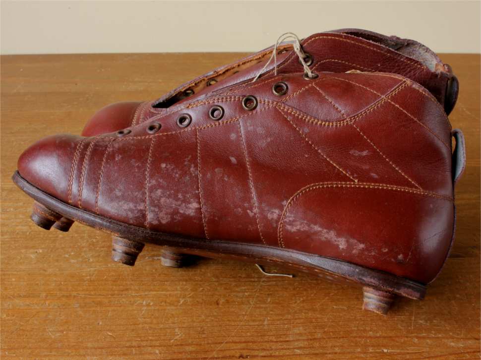 This pair of French vintage football boots which date from the 1950's are made of red / brown leather with leather soles and nailed on studs.