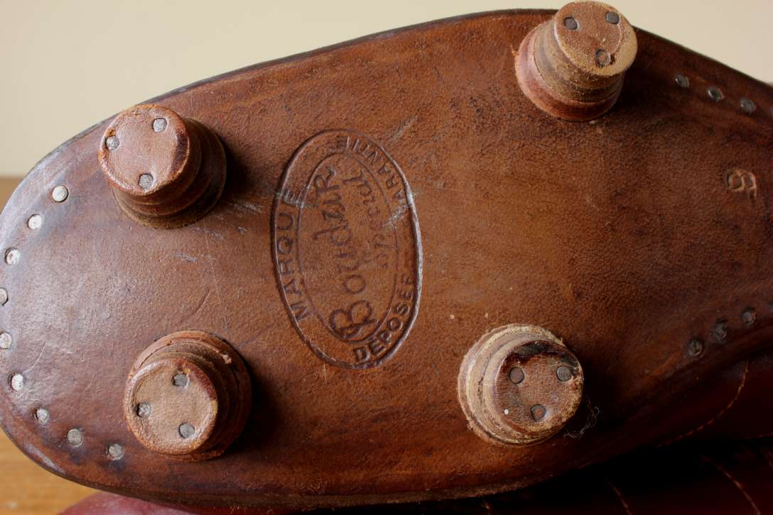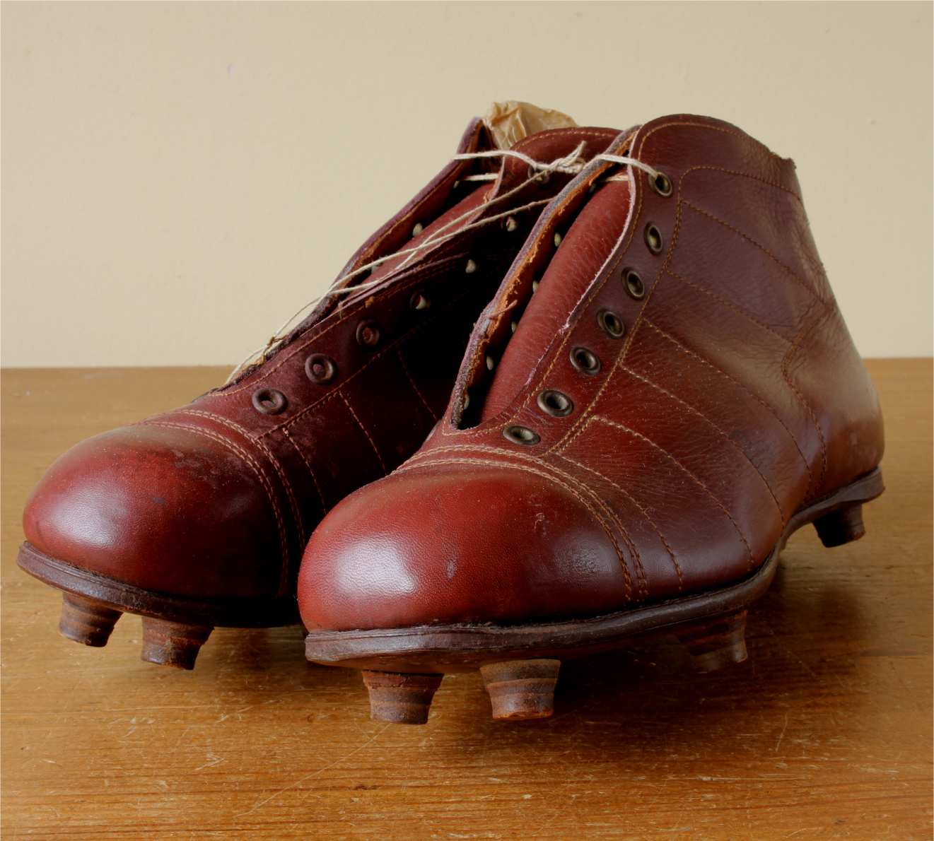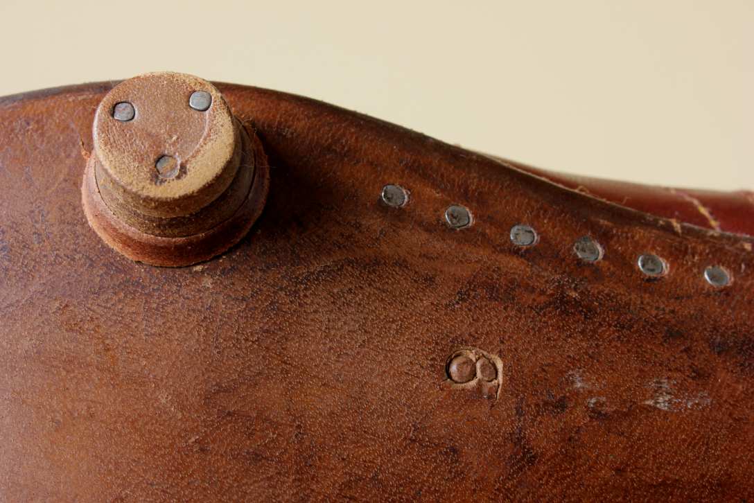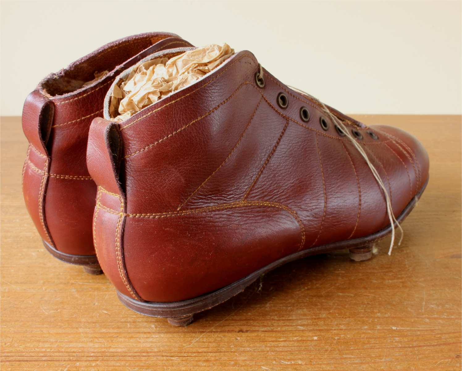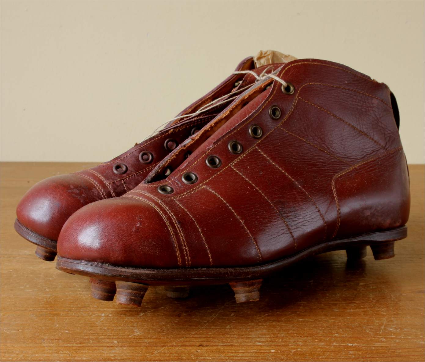This pair of French vintage football boots which date from the 1950's are made of red / brown leather with leather soles and nailed on studs.