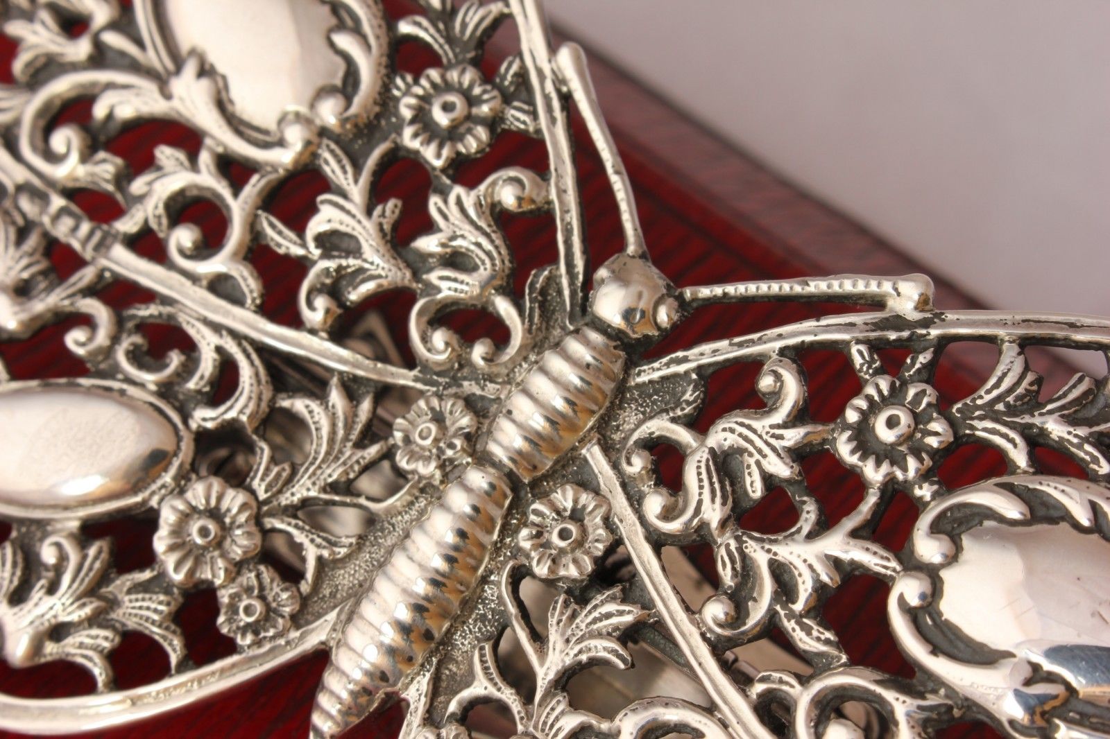 This wonderful antique stationery holder has a solid hallmarked silver hinged clip which is the form of a large butterfly mounted to a leather covered wooden base. The silver butterfly clip and the mount is fully hallmarked for London 1895 and is by renowned silversmith Samuel Jacob.