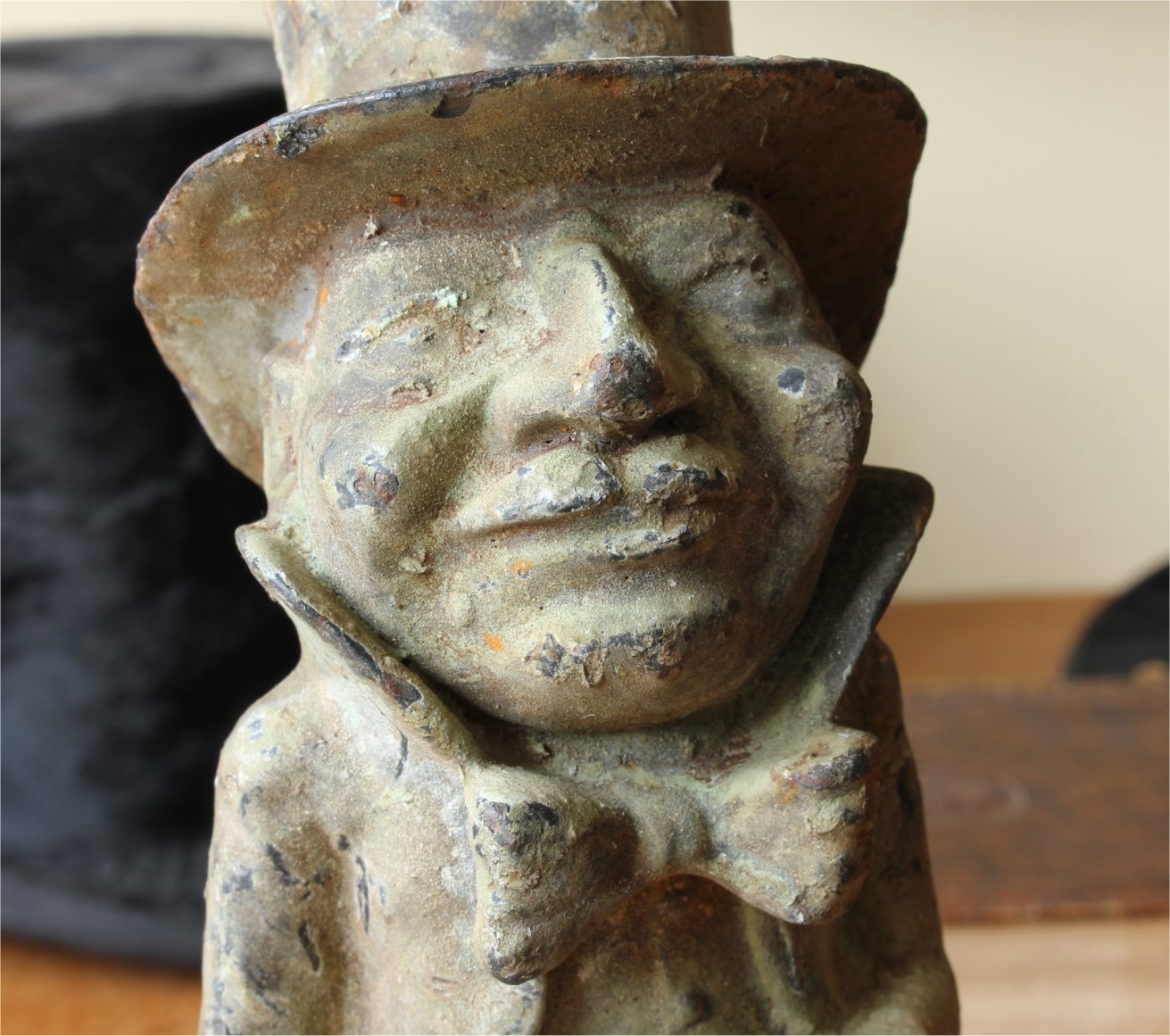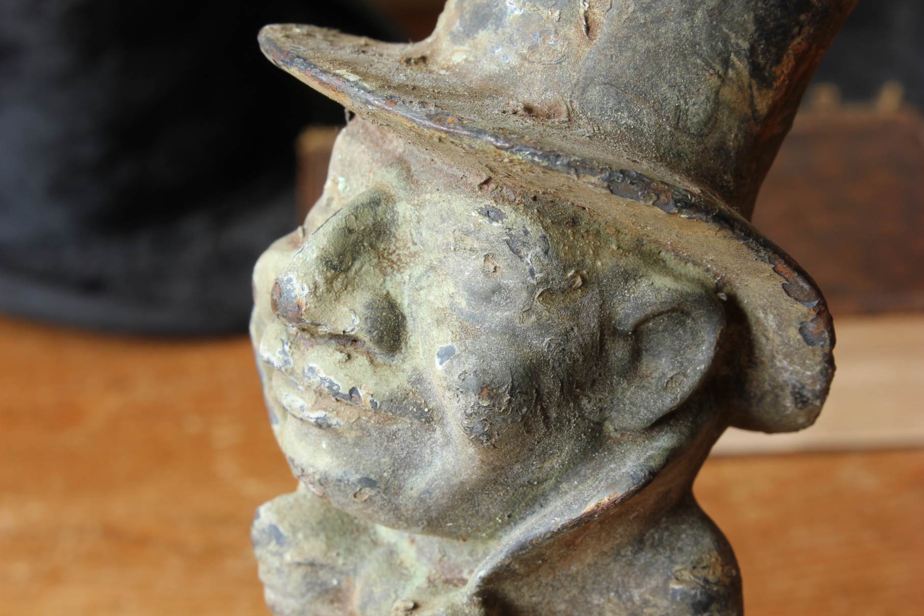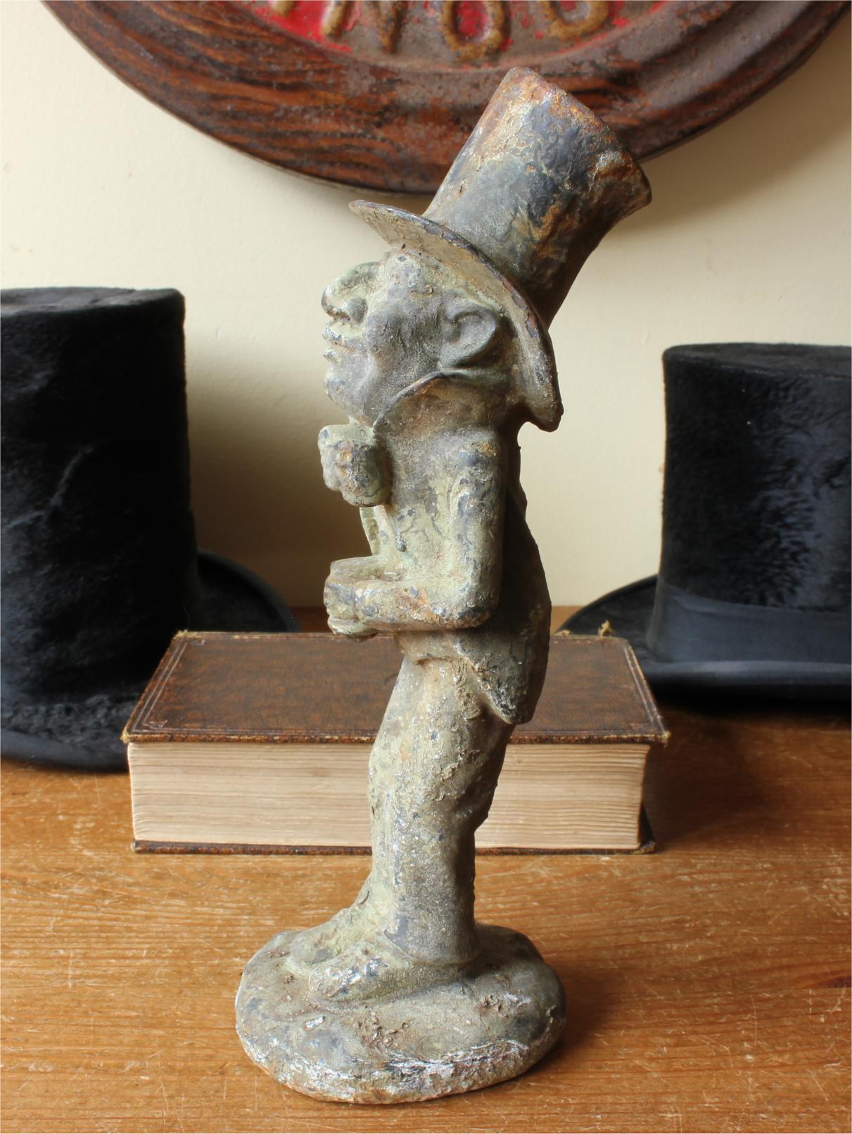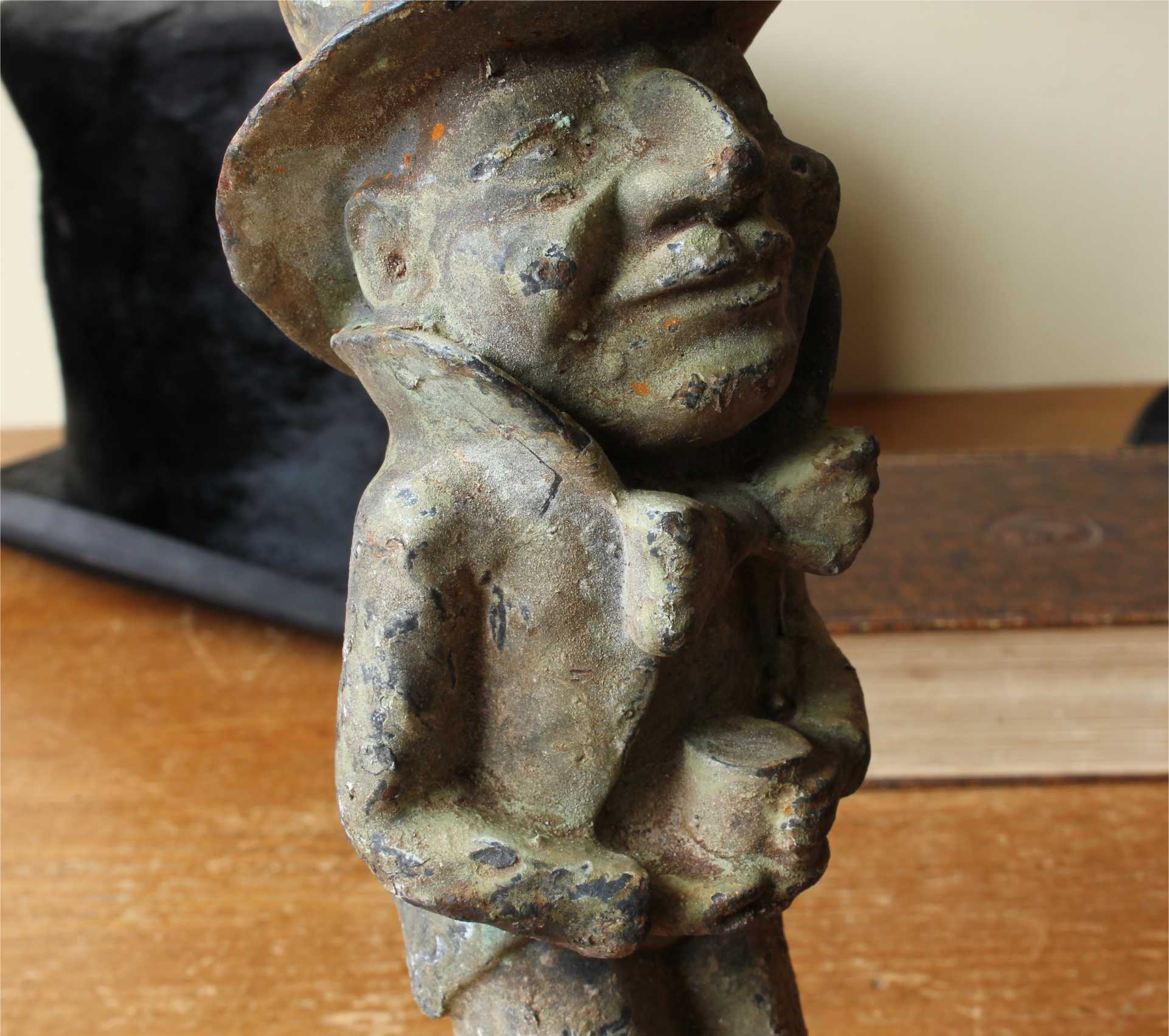 This unusual decorative figure of a man sporting a top hat and bow tie has a wonderful patina that has built up on the cast iron body over the many years and this handsome gentleman would make a great doorstop or a garden ornament.