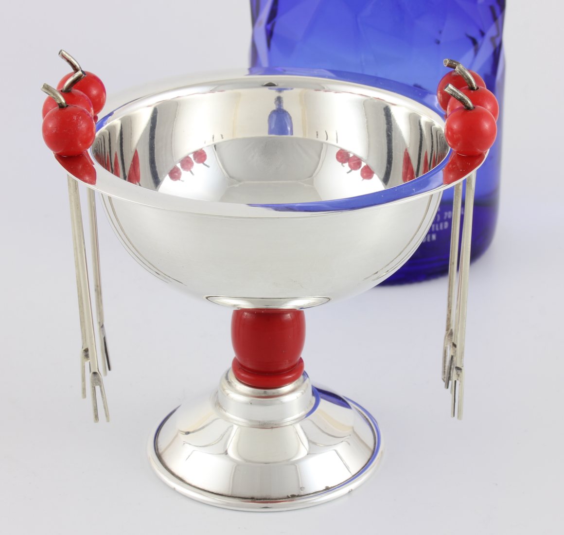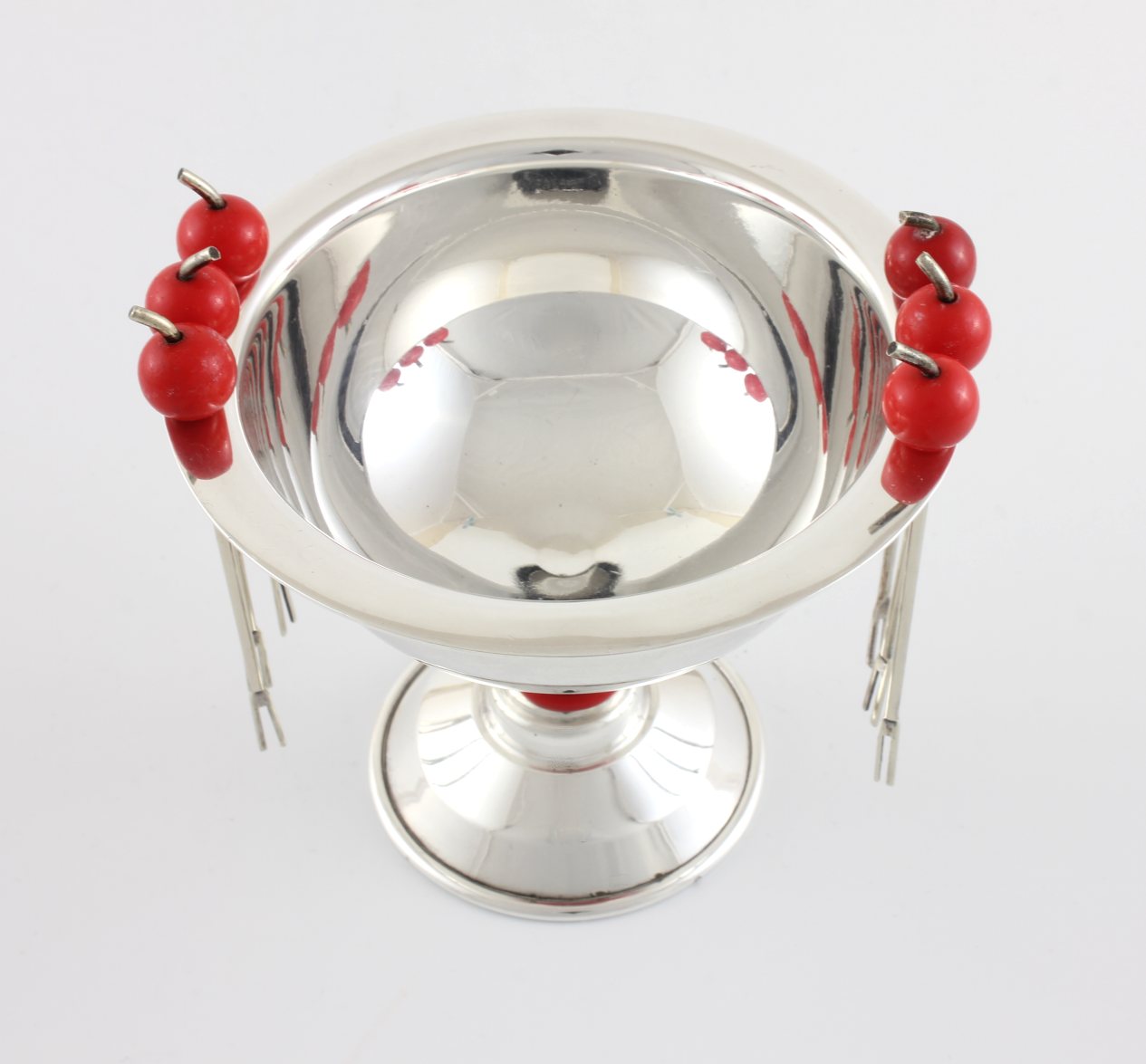 This novelty vintage / antique set of six silver plated cocktail sticks which feature cherry finials sit nicely around the edge of their silver plated bowl, is by PH Vogel & Co and dates from c1930.