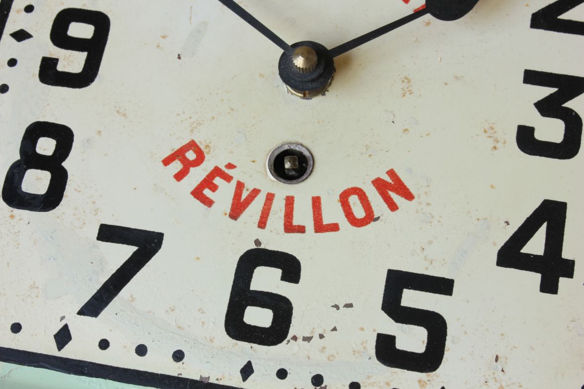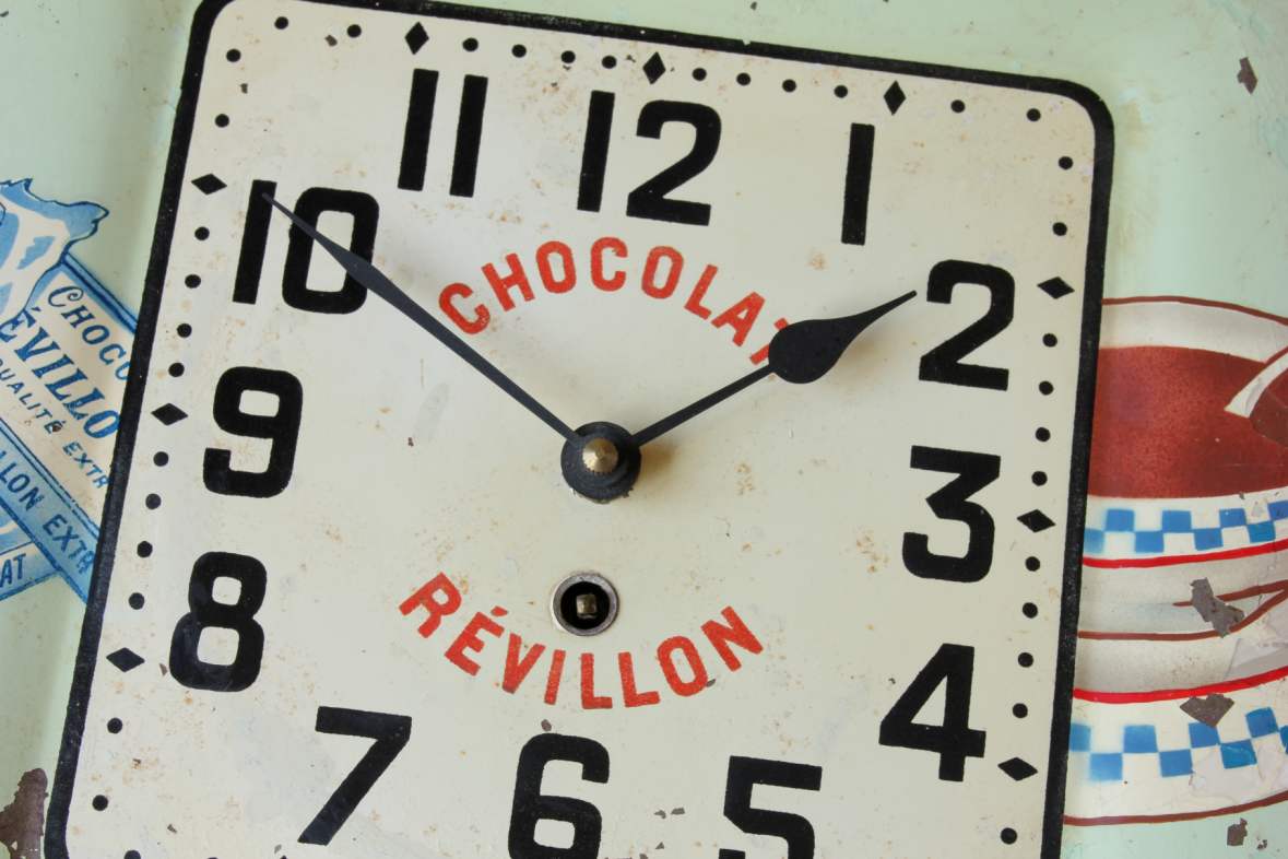 This stylish vintage / antique French chocolate advertising wall clock which dates from the second quarter of the 20th century is made of painted metal and would have originally been hung in a French Cafe to advertise Chocolat Revillon.