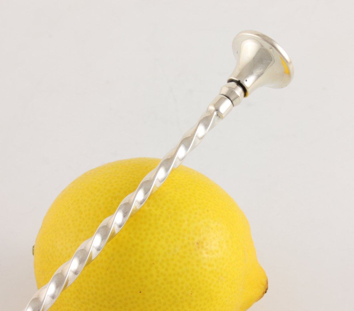 This long stirrer has a twisted design with a large spoon to one end and a muddler with a circular pattern at the other end for crushing your fruits and other cocktail ingredients.