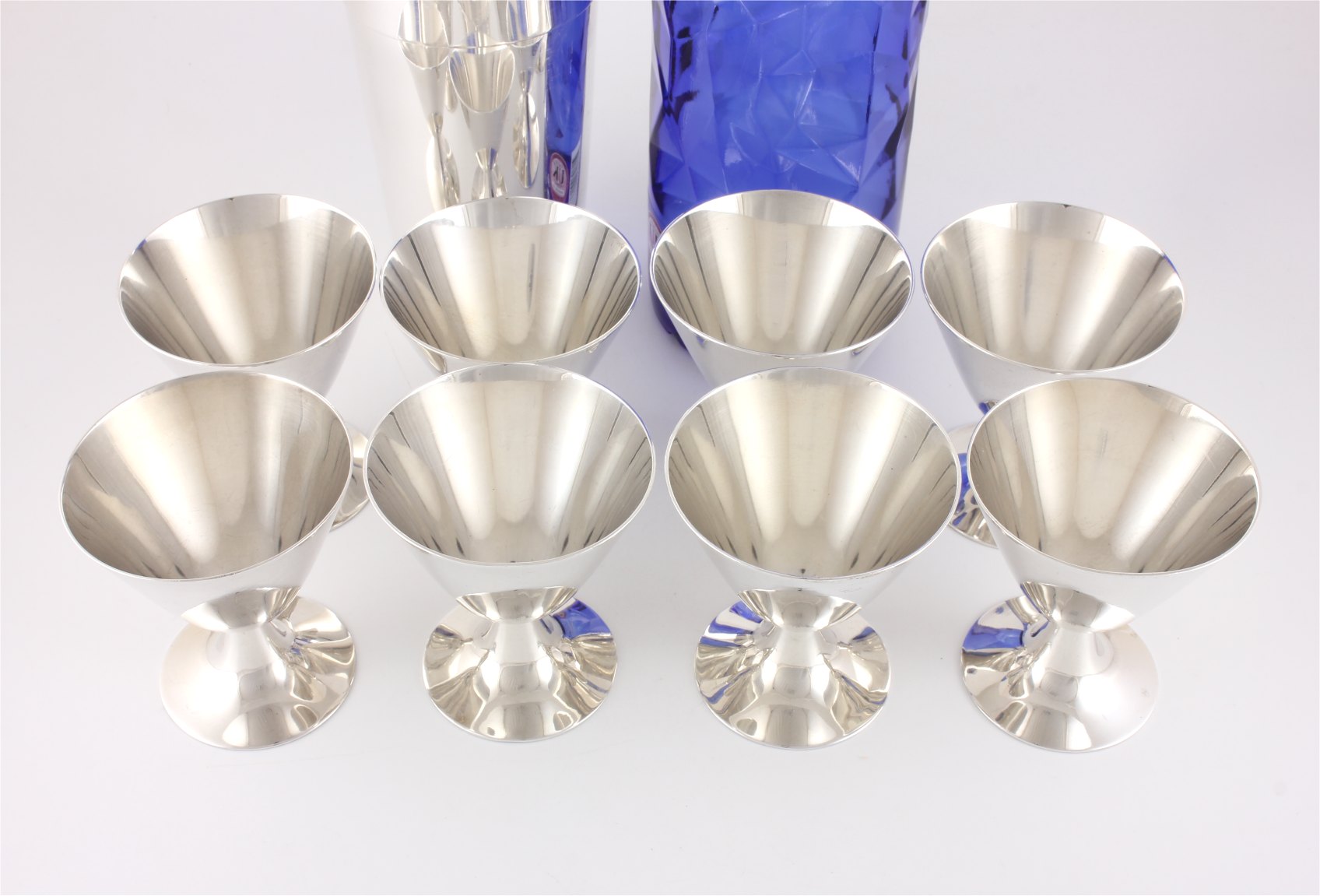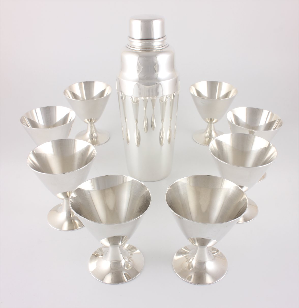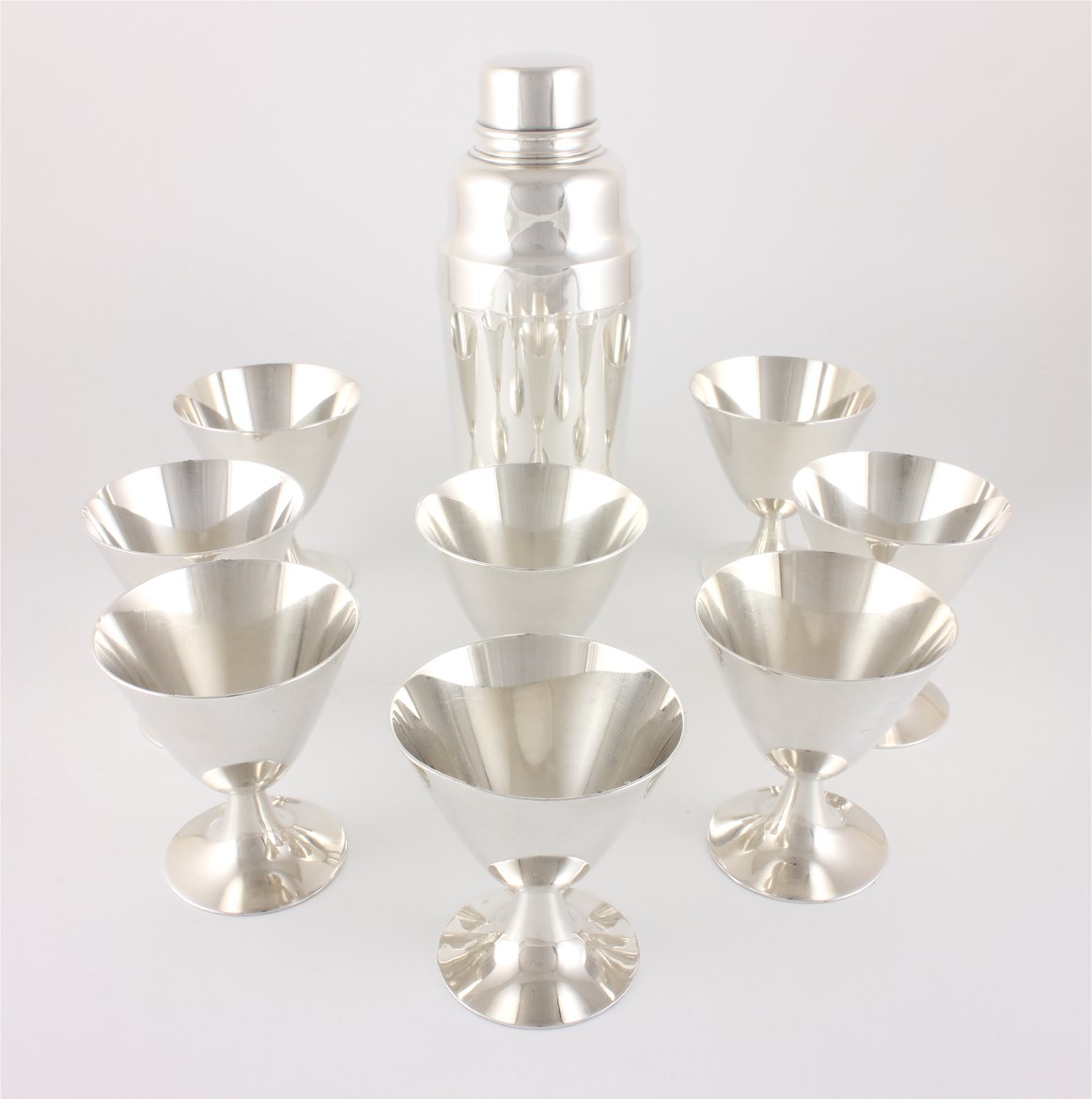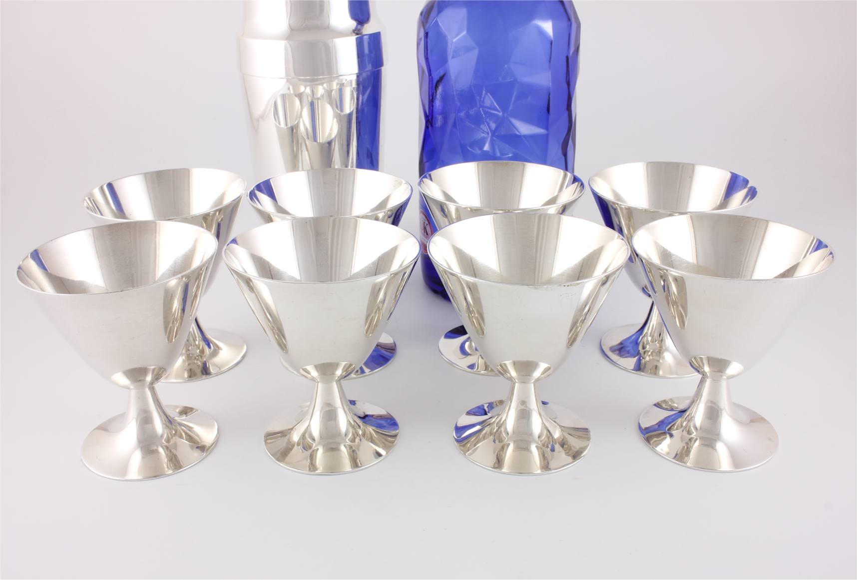 The cocktail shaker has a wonderful Art Deco design and is in excellent clean condition. The set of 8 matching goblets have a conical shape with a sloped foot, feel nice and heavy in the hand and are also in nice clean condition.