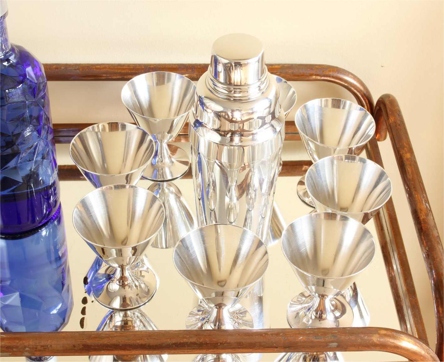 This stylish French barware set which is made by top maker Christofle comprises of a silver plated 3 piece cocktail shaker, 8 silver plated stemmed goblets and dates from the mid 20th century.