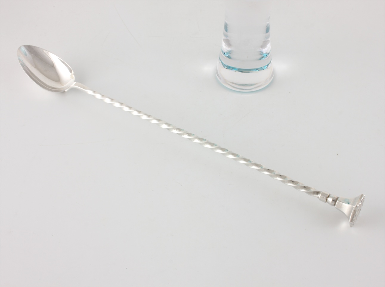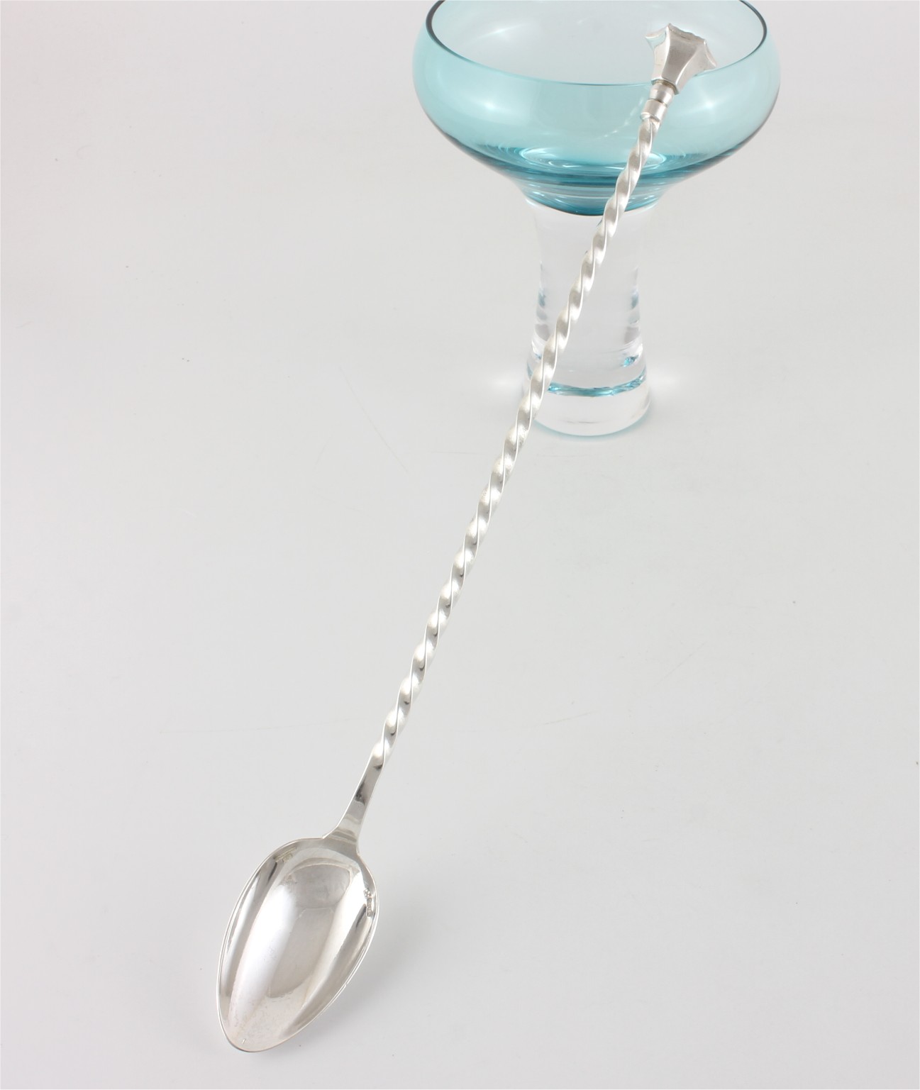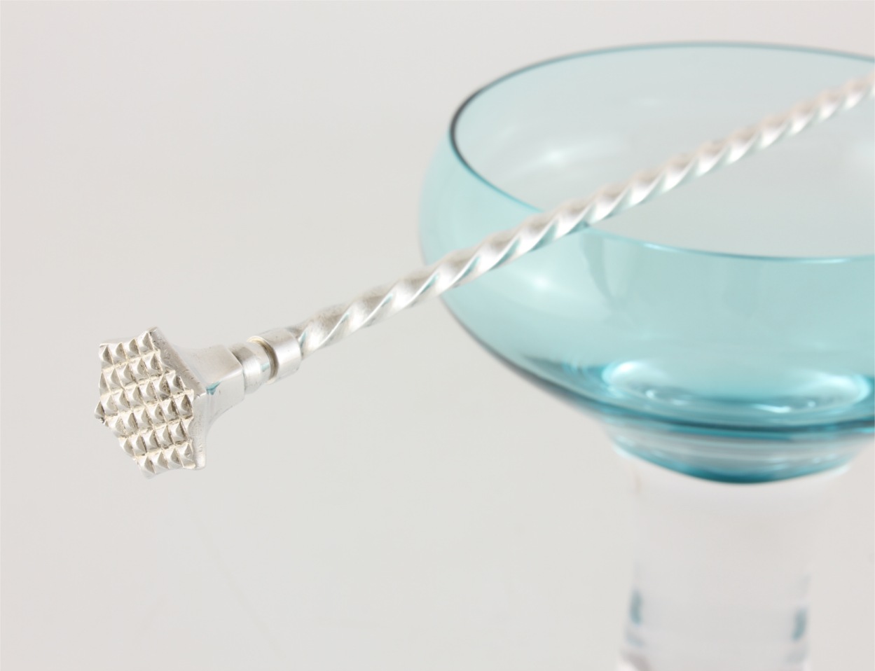 This long stirrer has a twisted design with a large spoon to one end and a muddler which has a hexagonal star shape at the other end for crushing your cocktail ingredients.