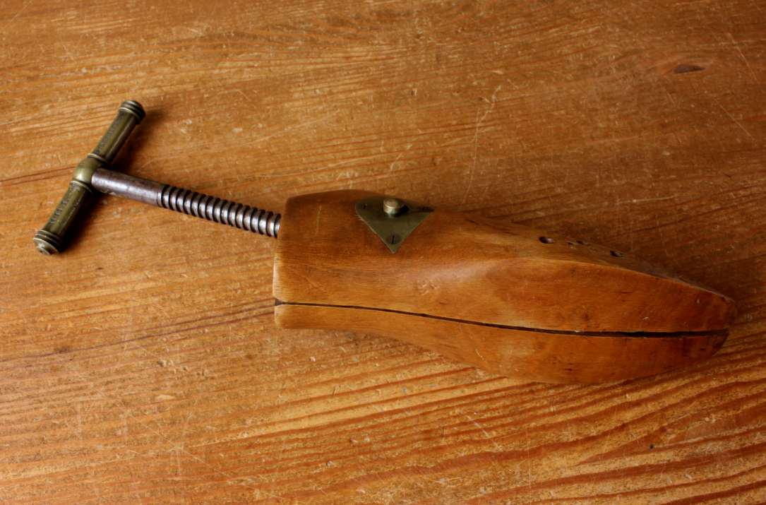 This highly decorative antique wooden shoe stretcher which has a wonderful rich golden patina has 2 parts that are hinged, have brass fittings and a metal screw mechanism with brass handle for tightening and enlarging the wooden last to stretch a shoe.