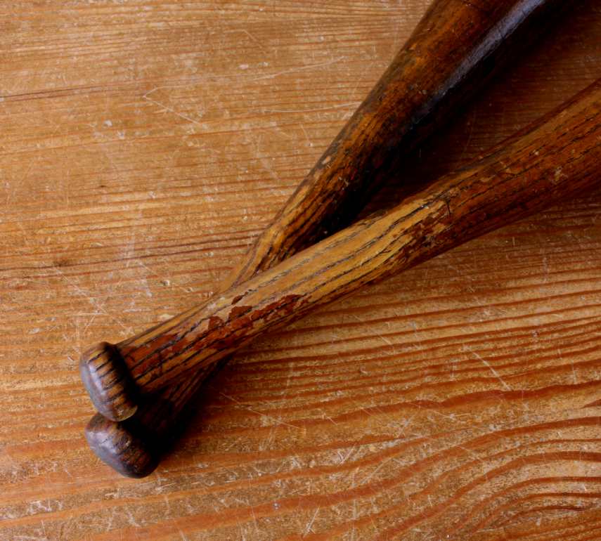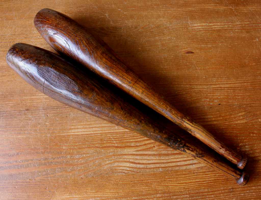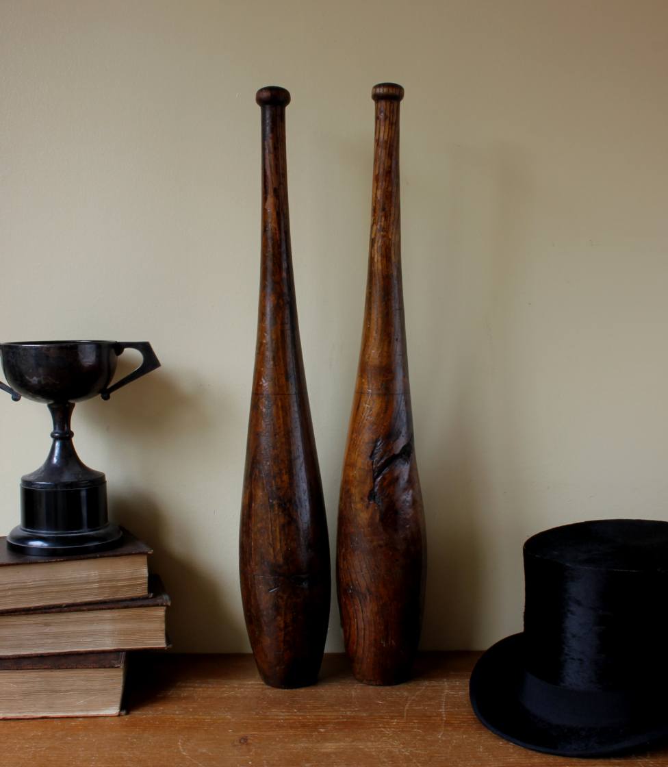 This handsome pair of antique wooden Indian clubs or exercise meels which were hand made in the late 19th / early 20th century have a wonderful dark colour and a ring decoration to the body.