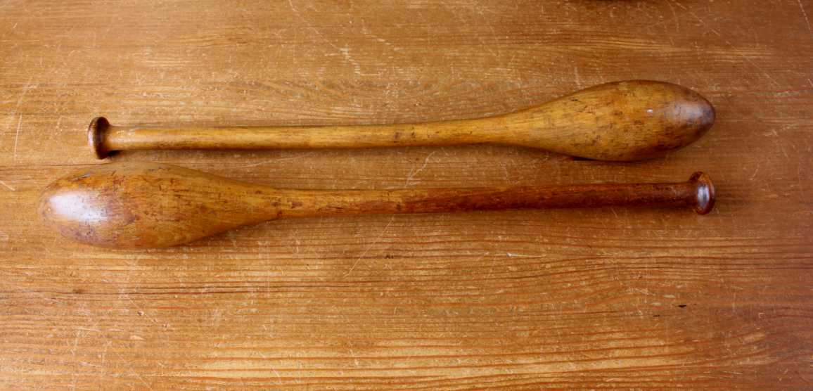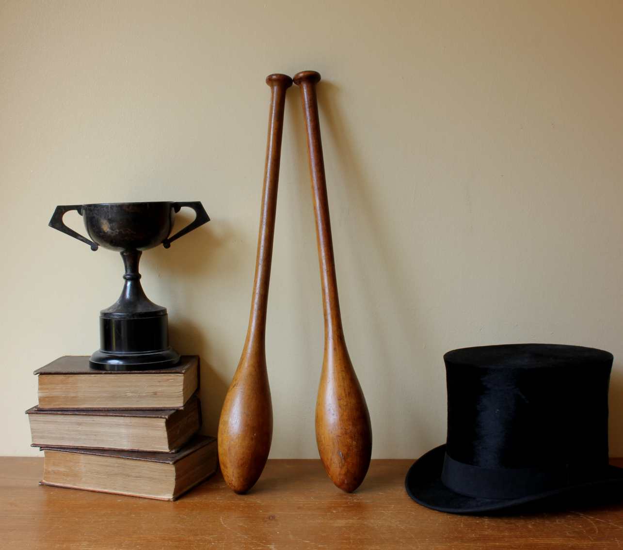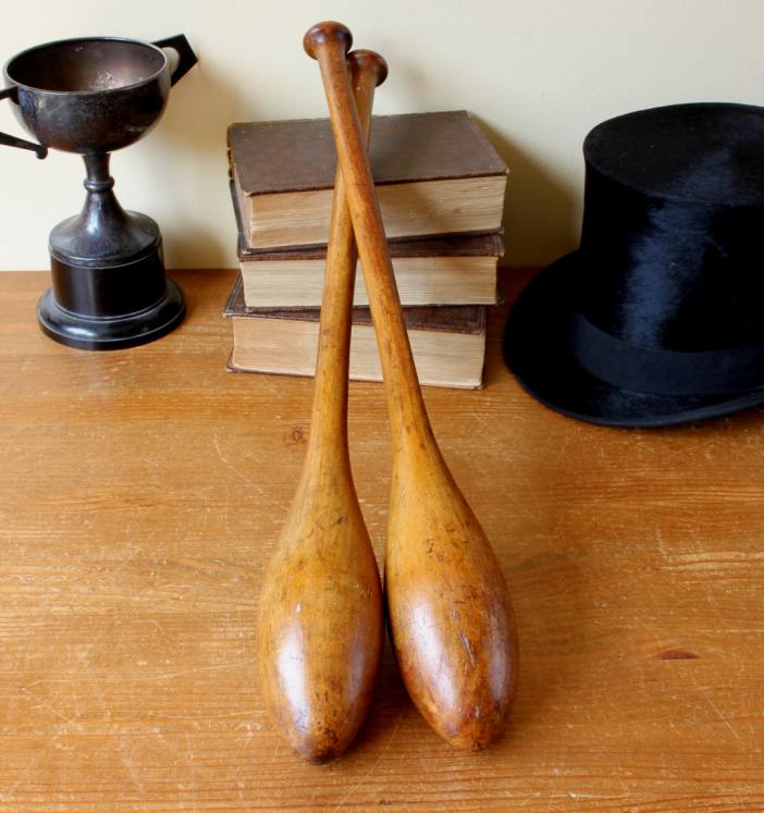 This handsome and decorative antique pair of wooden Indian clubs or meels which date from the early 20th century have a beautiful rich dark brown colour, are marked with the number 2 to the top of each and are approx 49.5 cm (19 1/2") in length.