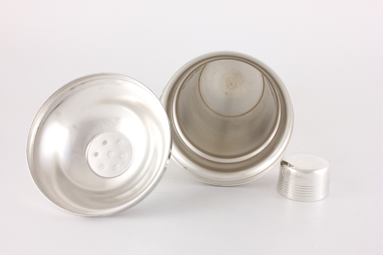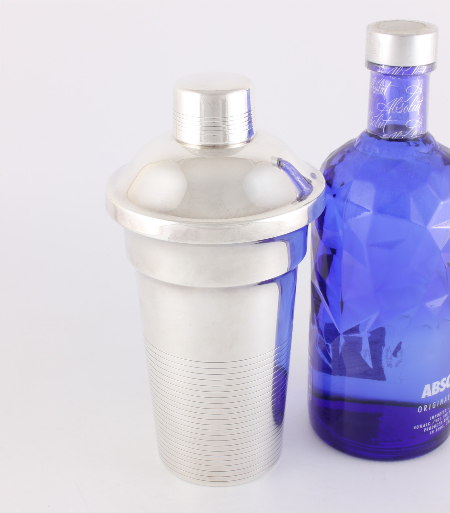 This handsome shaker is marked to the underside with the maker's marks and not only looks great with it's Art Deco stepped and ringed design but is very clean to the inside. A nice usable bar accessory.