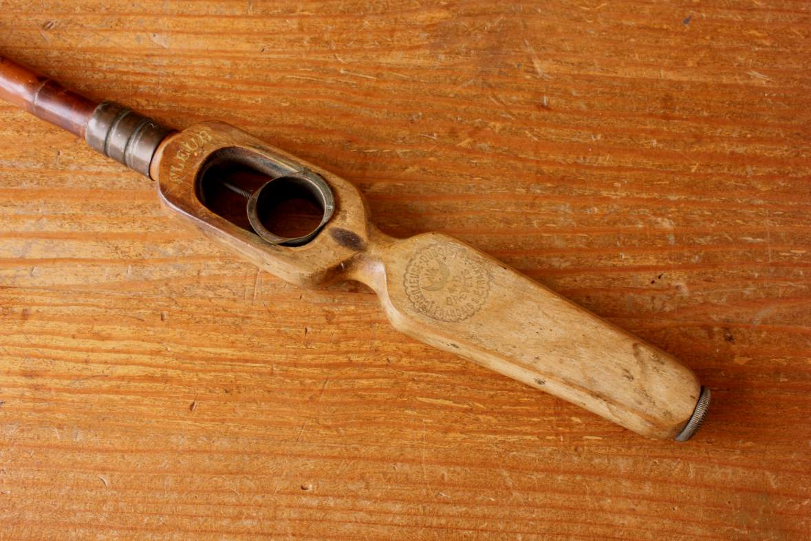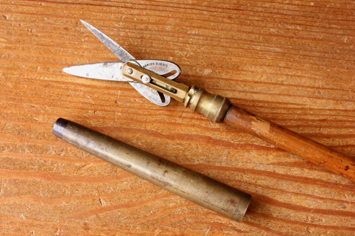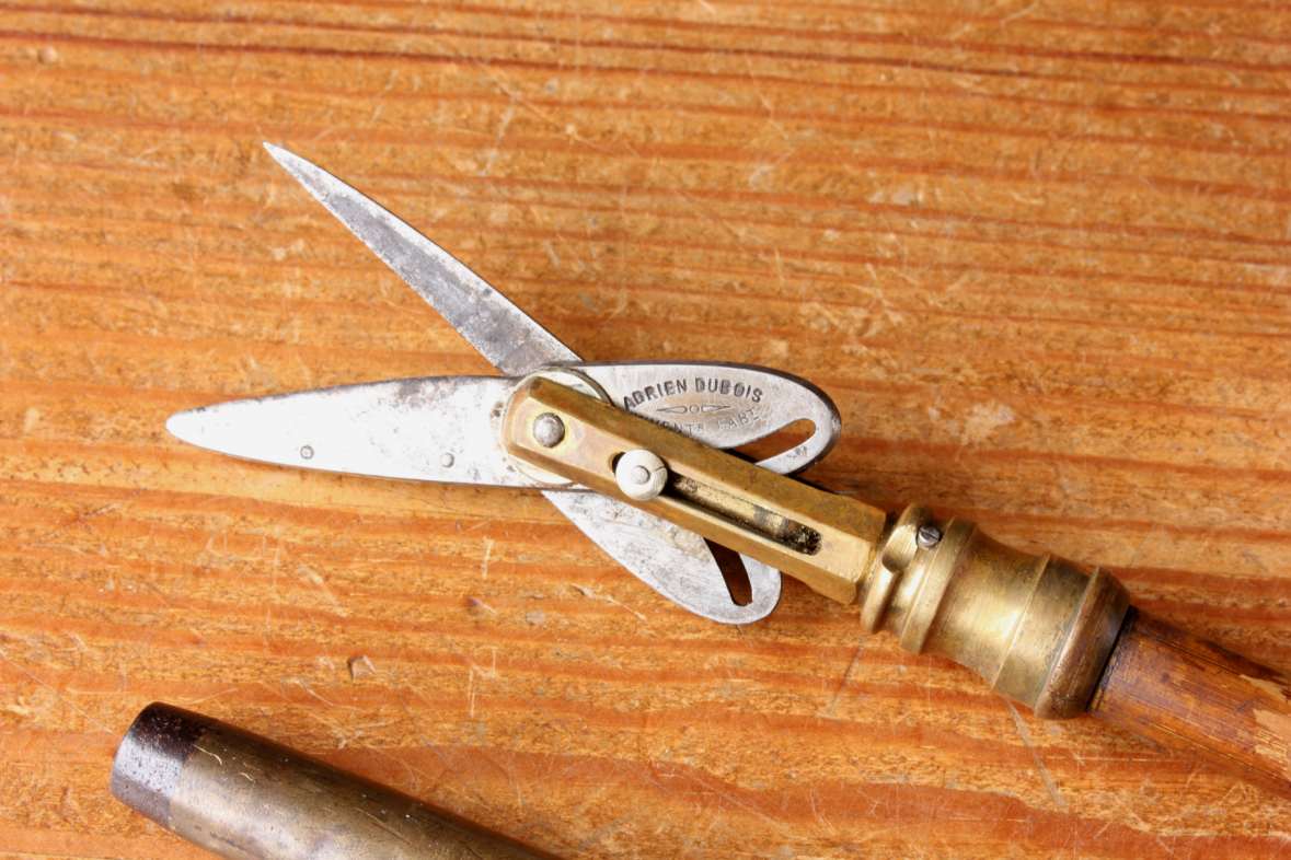 This flower / fruit picker has a fruitwood handle which is marked with Fleurs to one side and Fruit to the other. This handle is fitted with a trigger which when pressed opens and closes the scissors grips at the other end of the cane to cut and hold your required specimen from a high or hard to reach area, remove buds or can also be used to remove caterpillar nests in high places. This is also embossed with the inventor and maker's details for Adrien Dubois and the Patent mark.