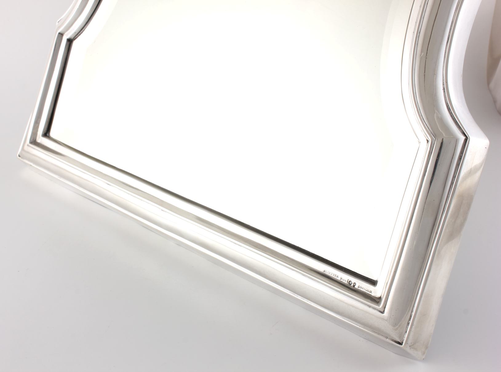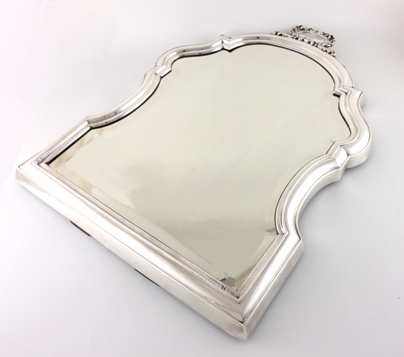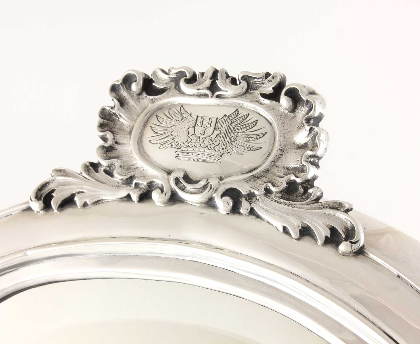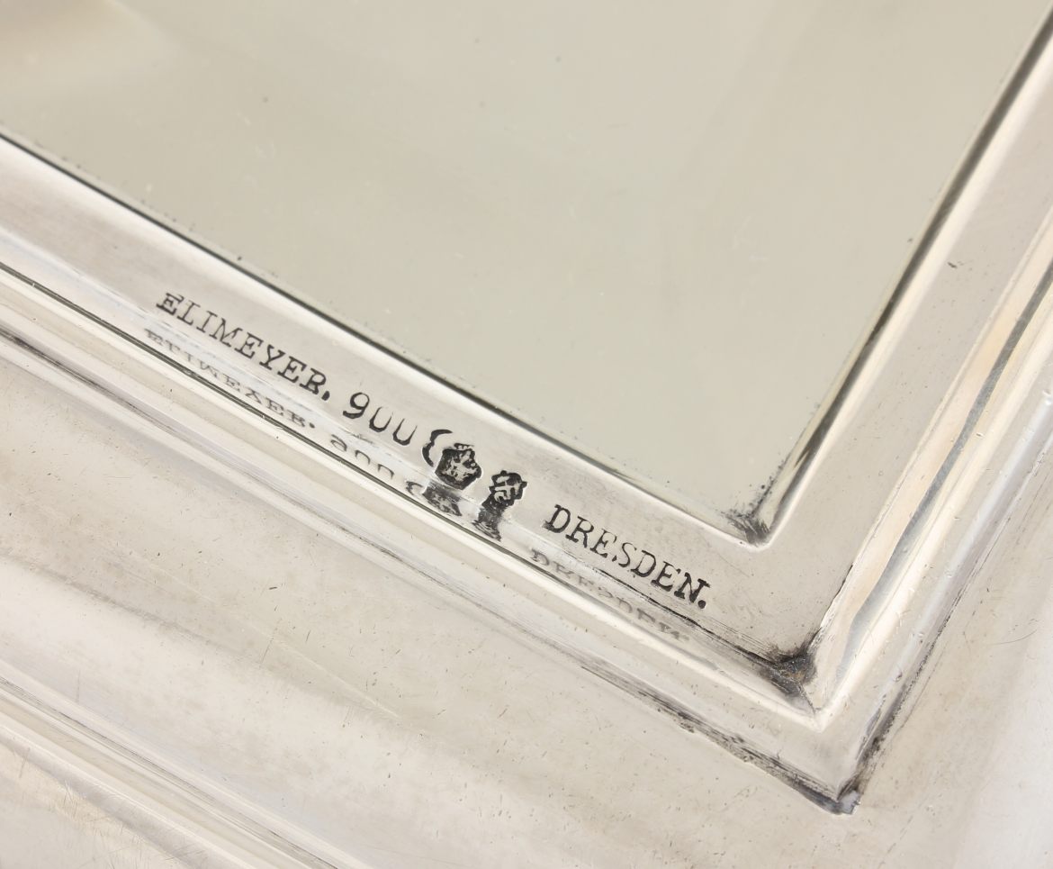 This fabulous antique silver easel back table mirror which is made of 900 grade German silver is by top German silversmith Elimeyer of Dresden.
