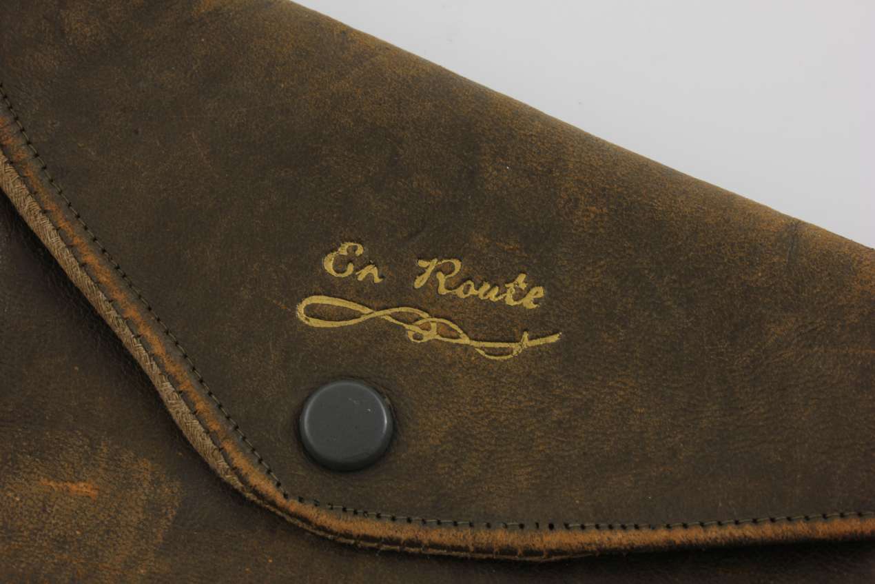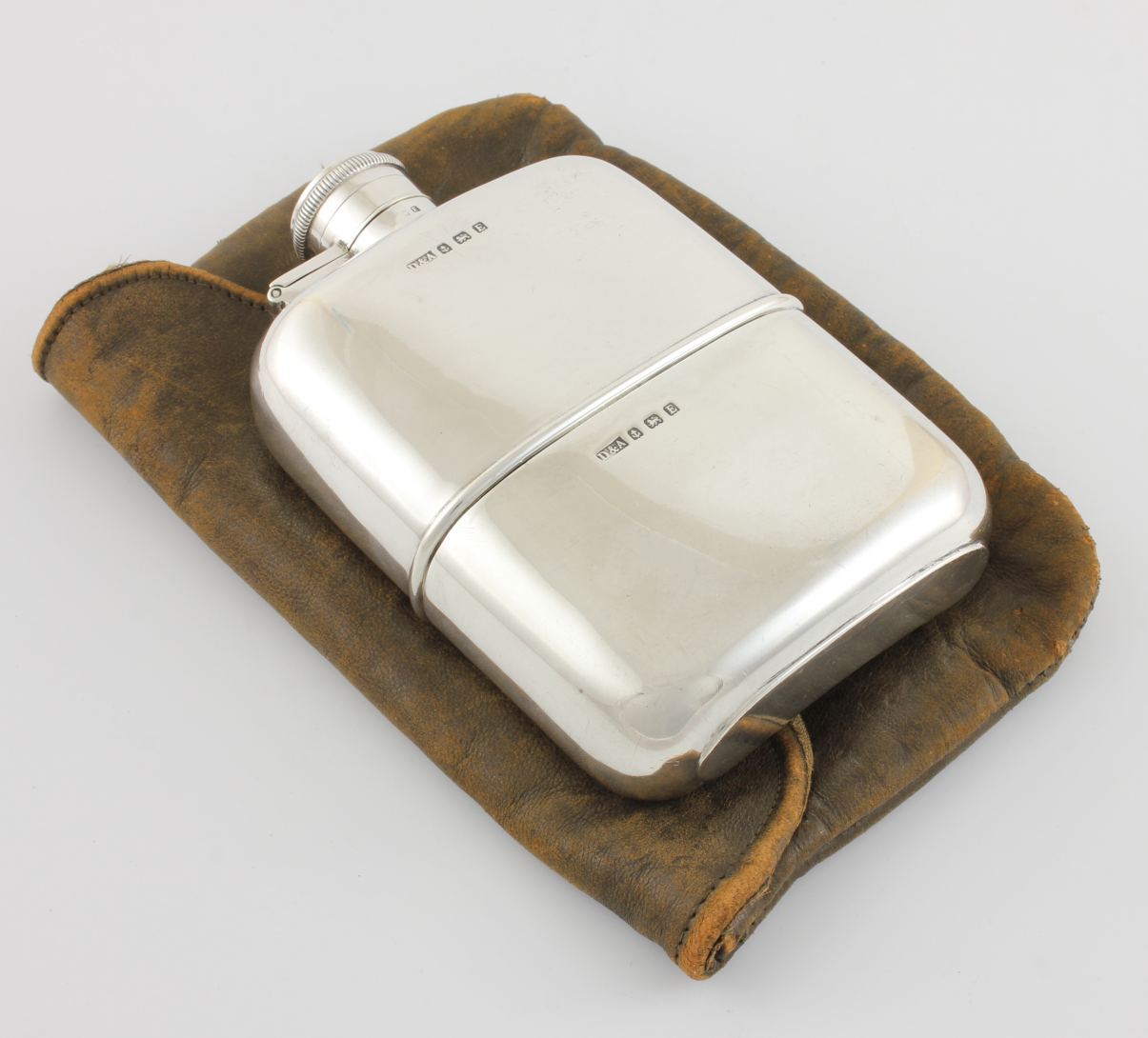 This flask has a detachable silver cup which is gilt lined, a hinged flip / bayonet top which is tight and seals well so does not leak and the flask comes in a charming leather pouch which is marked to the front with En Route.