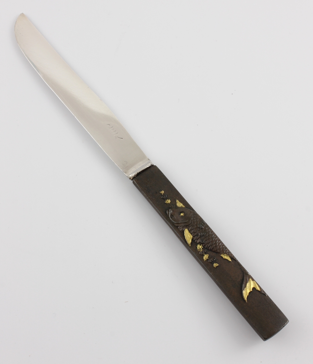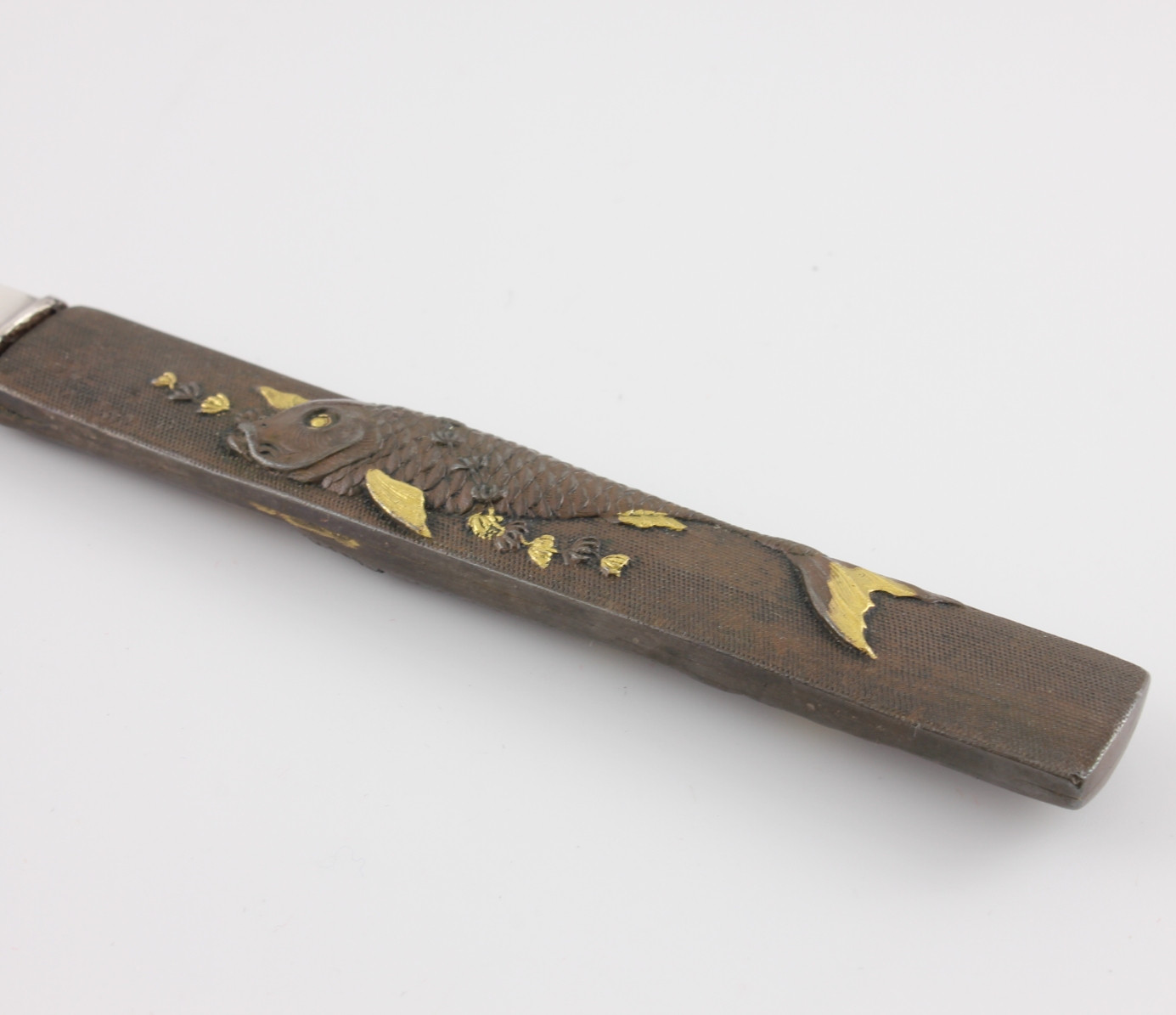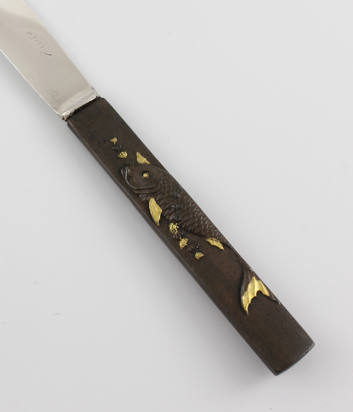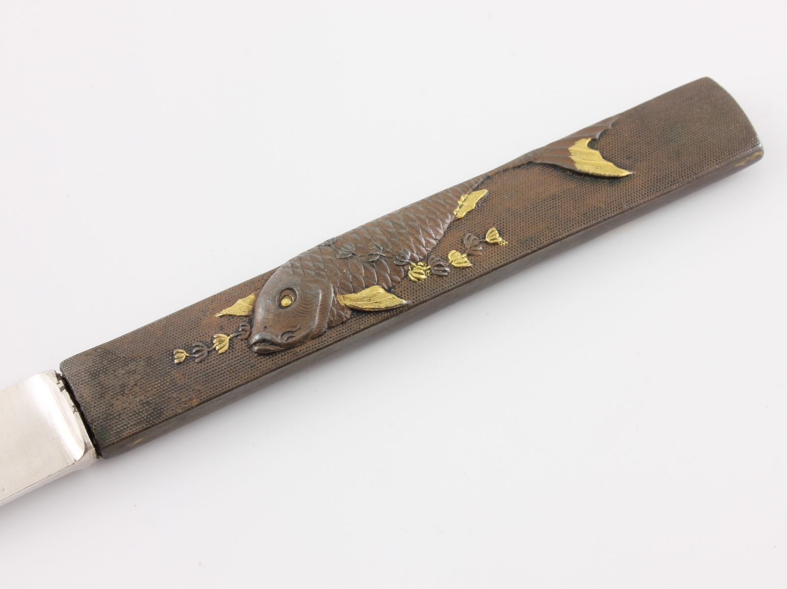 This antique Japanese letter opener has a bronze Kozuka handle, dates from the Meiji period and has a silver blade that is marked with a fish type character.