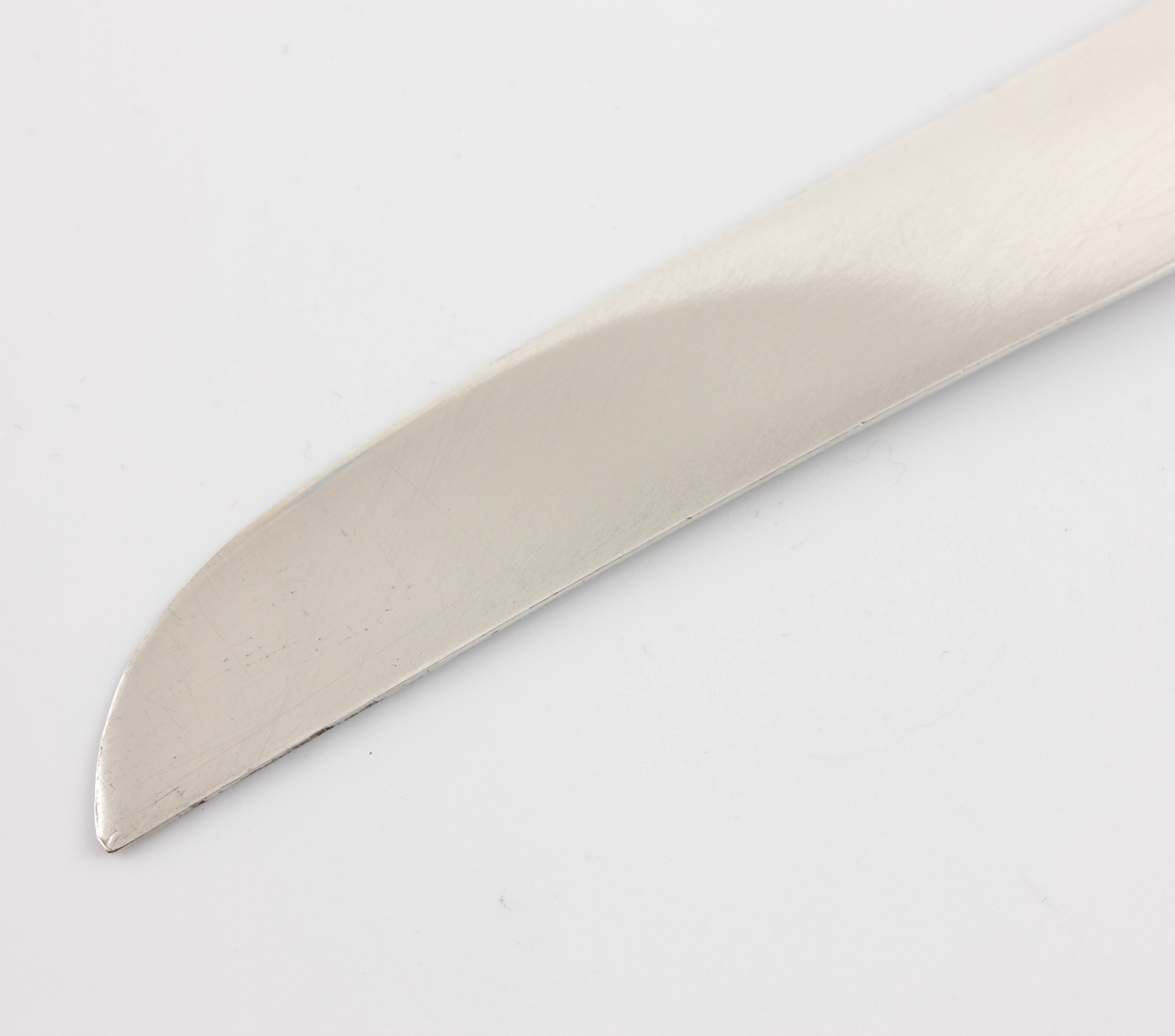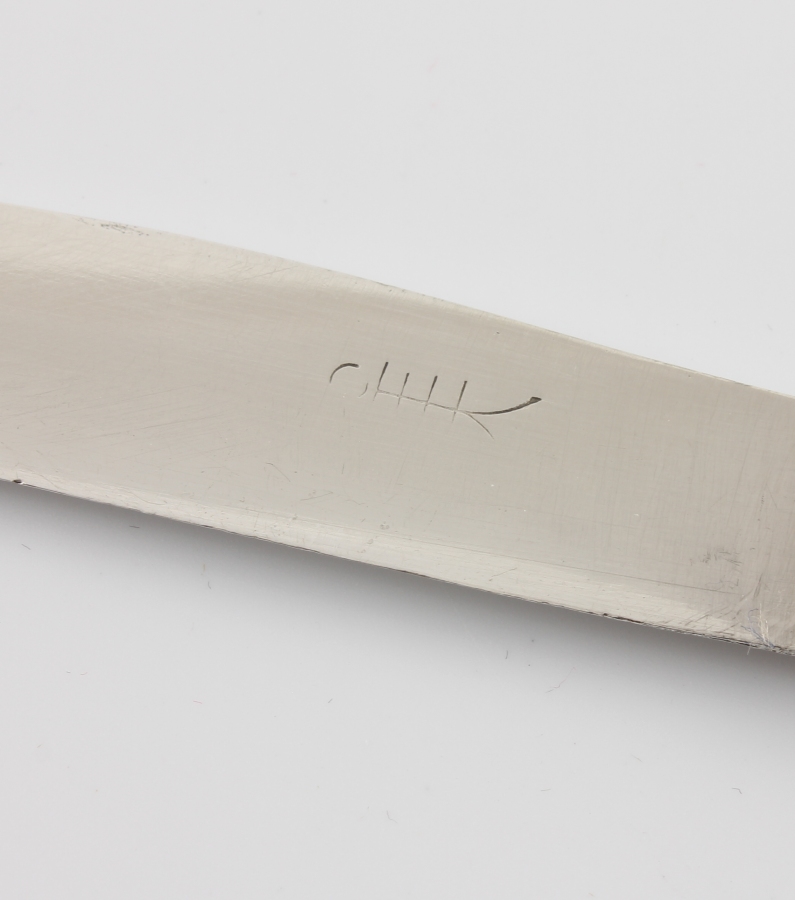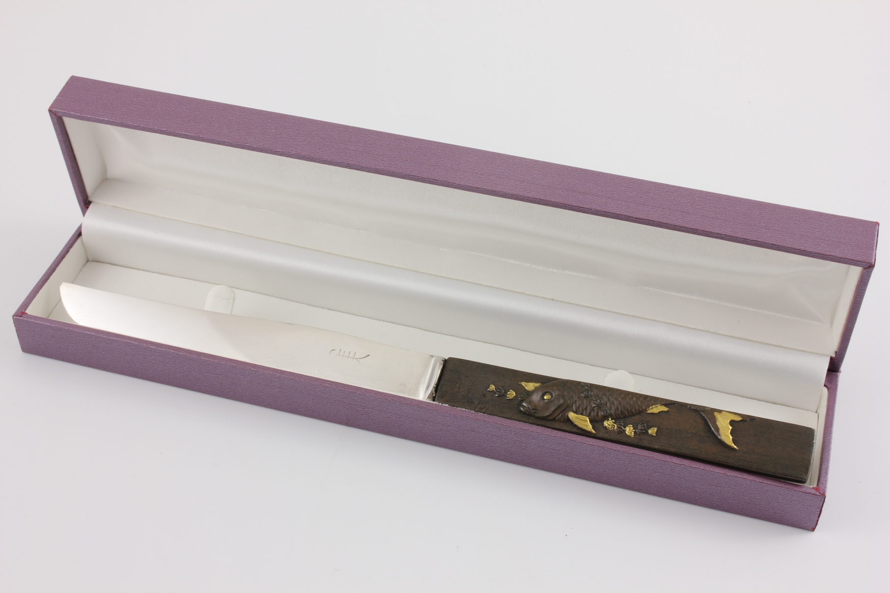 This antique Japanese letter opener has a bronze Kozuka handle, dates from the Meiji period and has a silver blade that is marked with a fish type character.