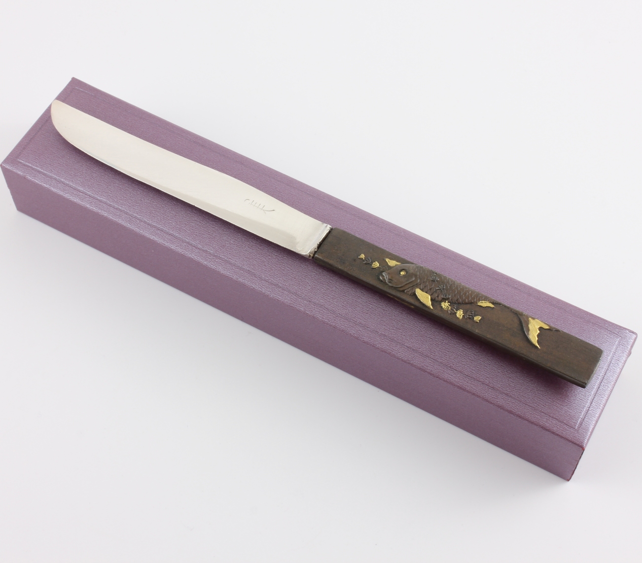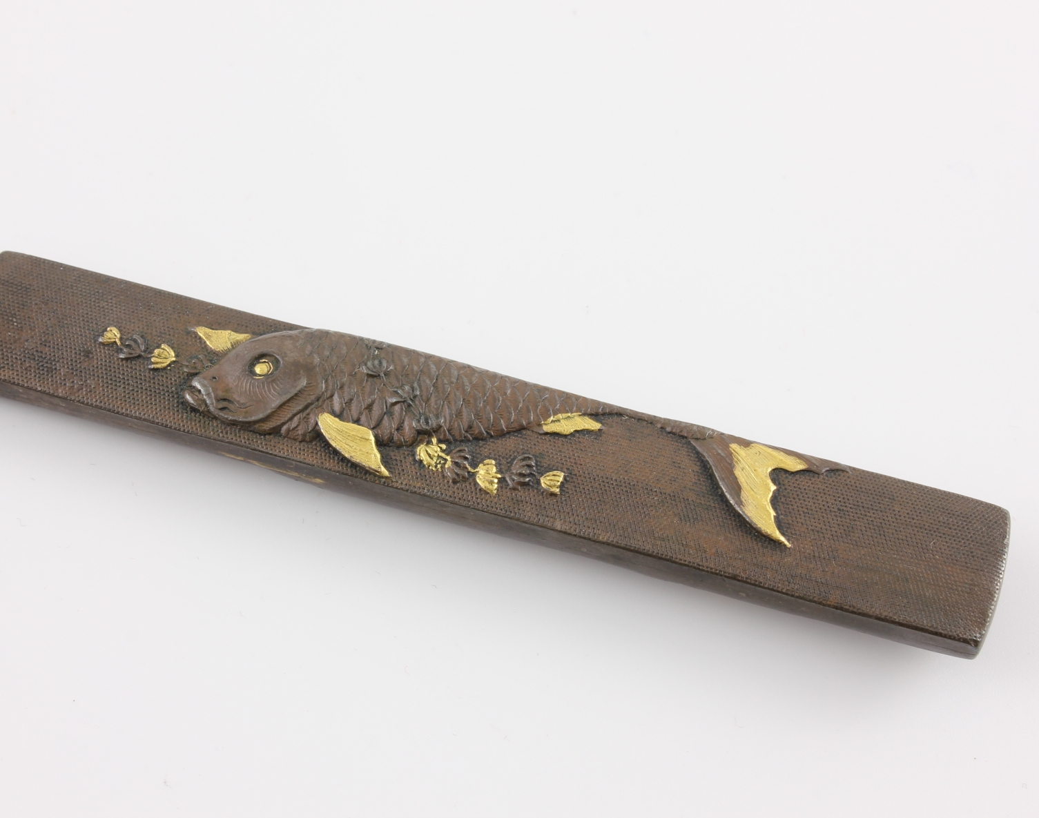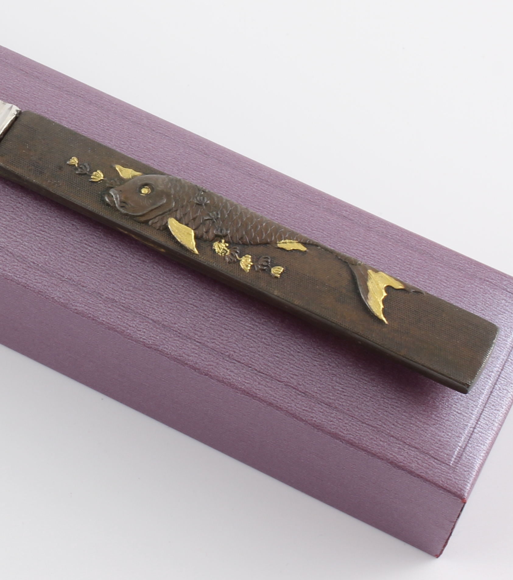 The beautiful bronze handle is wonderfully decorated on both sides with real gold highlights which show off the craftsman's skill for detail and this one features a carp swimming amongst weed.