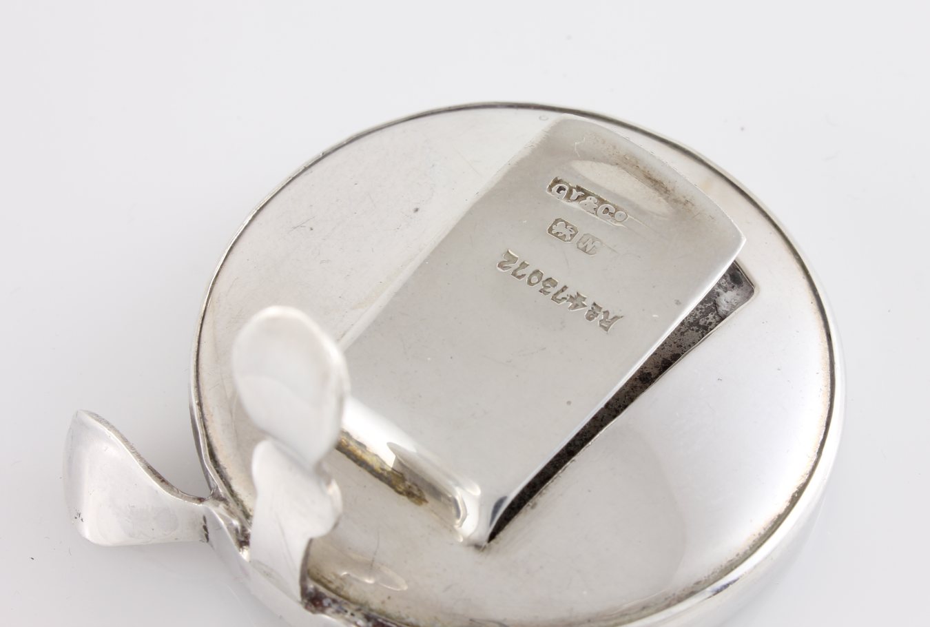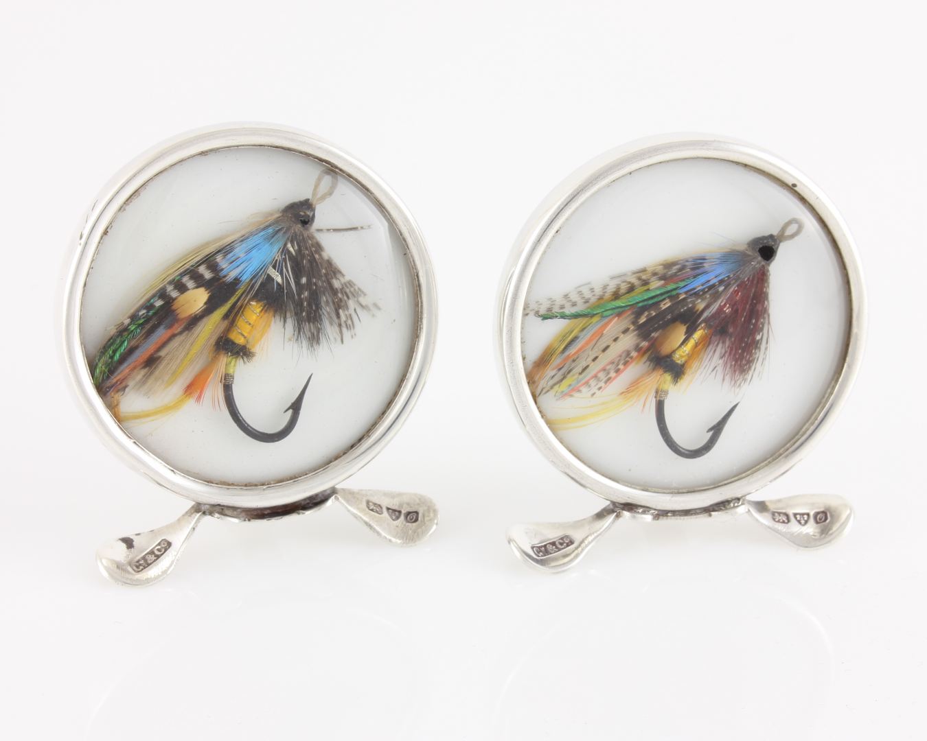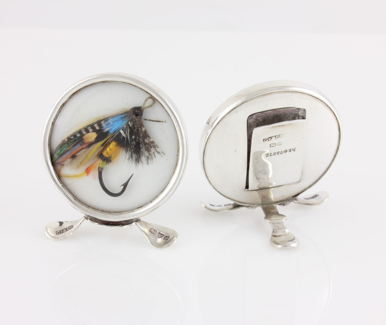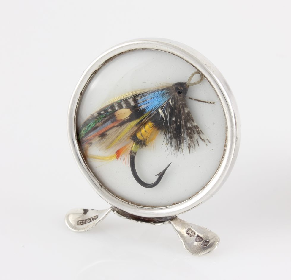 These circular menu holders feature colourful fishing flies that are set in the silver mount behind glass and sit on three feet.