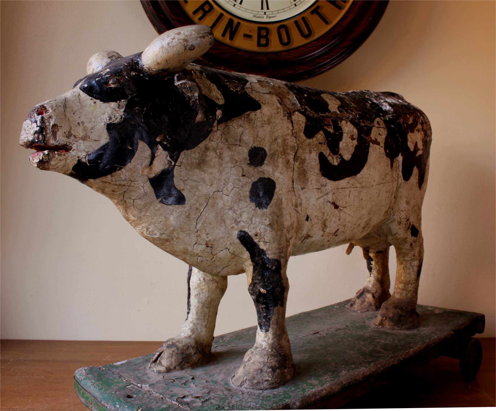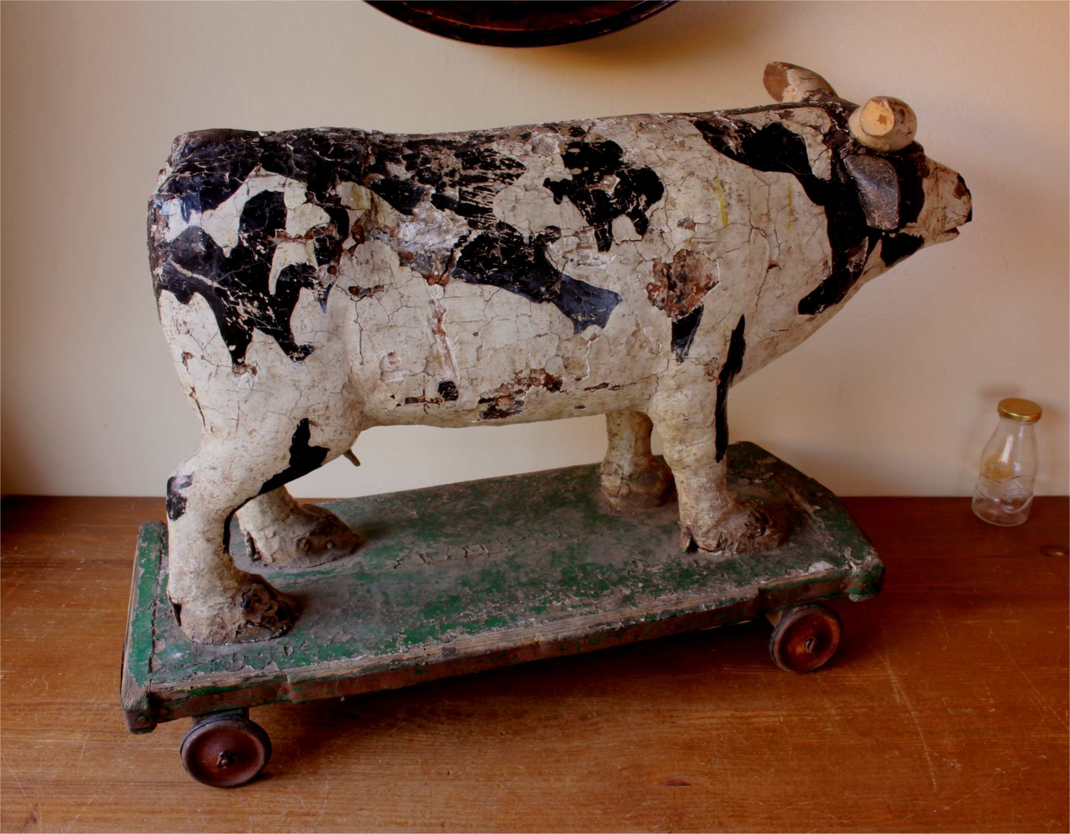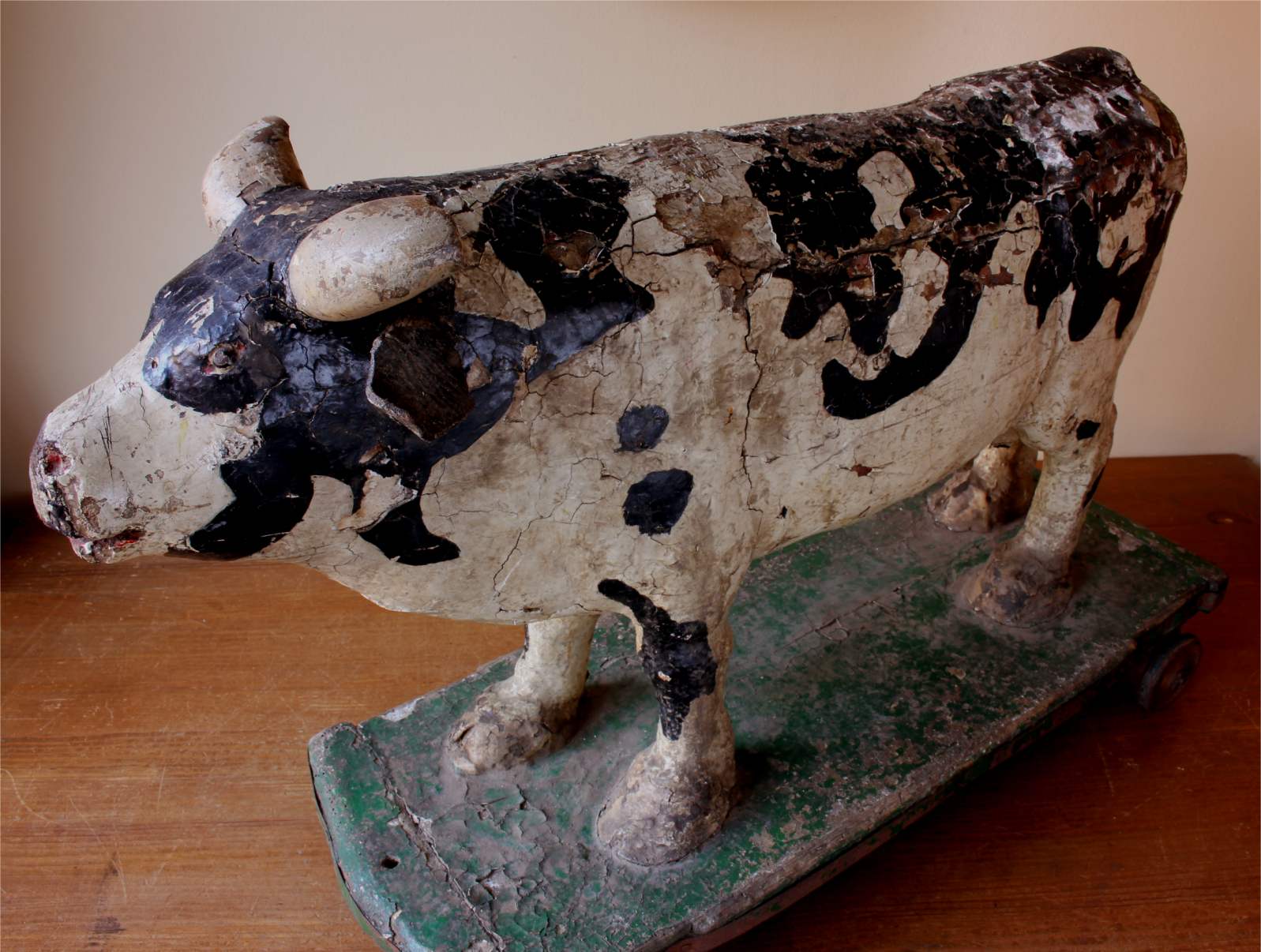 This adorable folk art cow which would have been made by hand using wood, leather and other materials sits on a green painted trolley and dates from the 19th century.